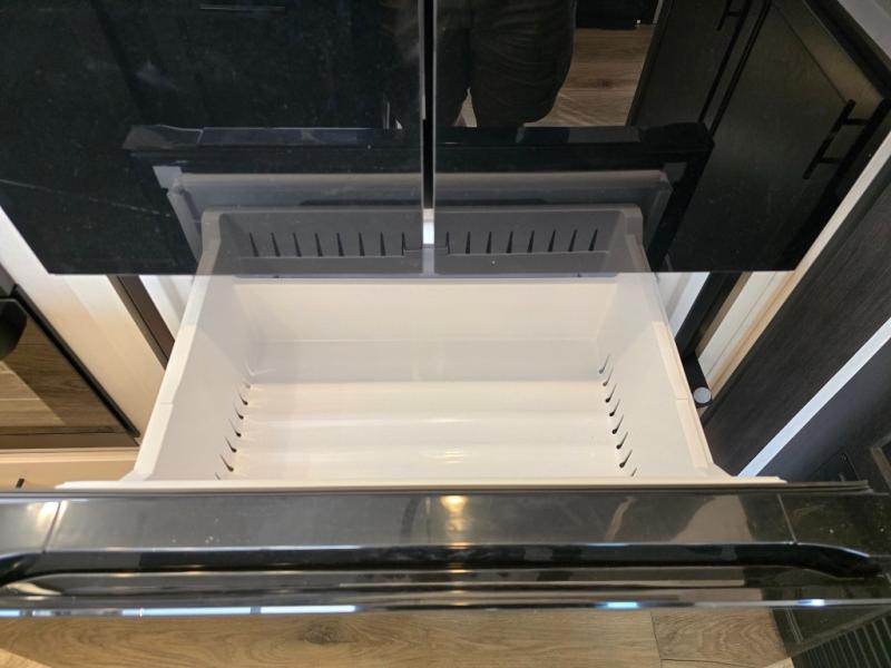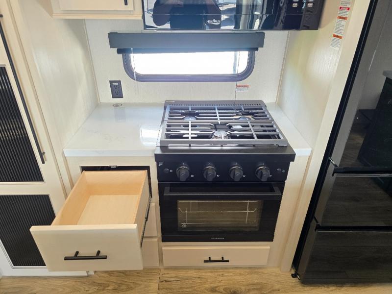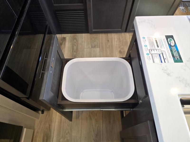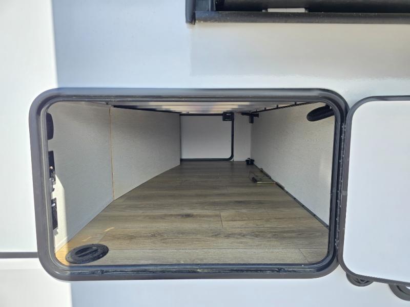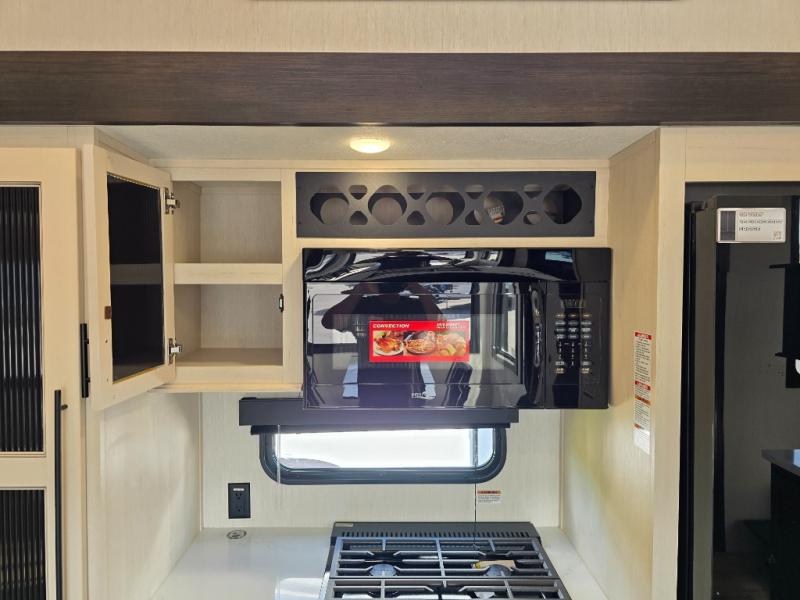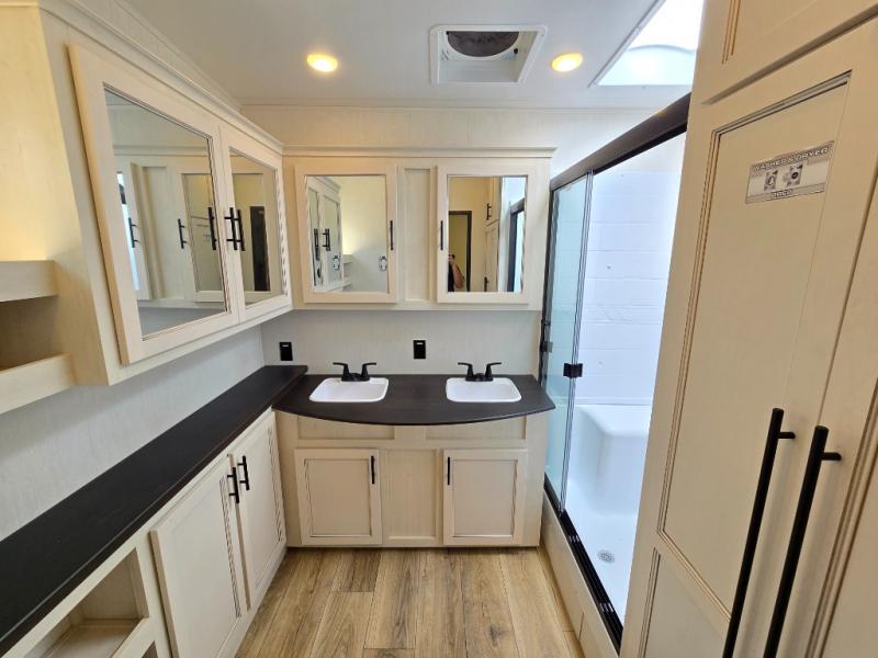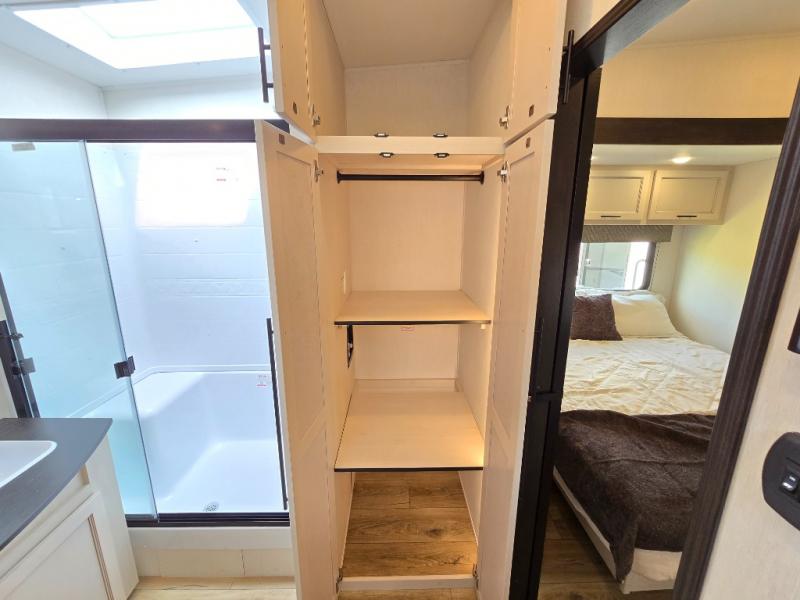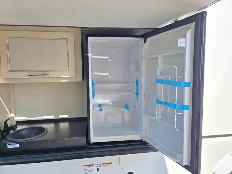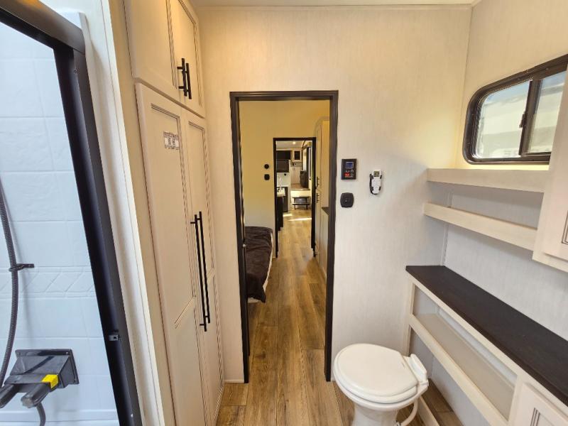 This Sabre fifth wheel with a full and half bath is sure to be a crowd pleaser! The front living area is the perfect place for everyone to visit each other comfortably on the two tri-fold sofas that can be transformed into extra sleeping spaces, or at the theater seating for complete relaxation. You will also find an entertainment center with a fireplace and a TV. This Sabre has a kitchen filled with convenient features, such as a 12V refrigerator with French doors, a kitchen island, and a lighted pantry with motion sensors. The rear master suite has access to its very own full bathroom with a double-sink vanity for two to get ready at once, and a wardrobe with washer and dryer prep for convenience!