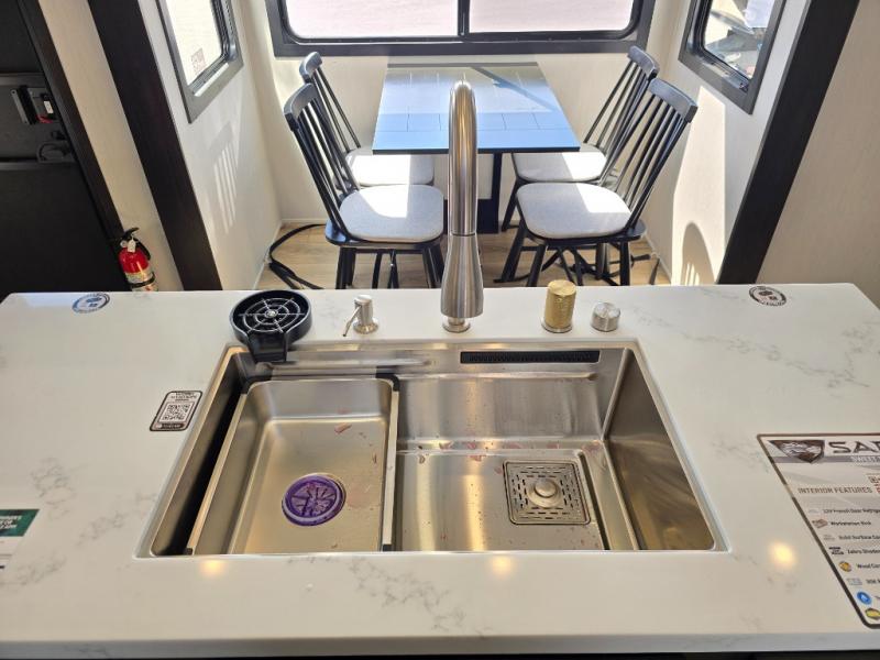You will experience luxurious camping trips at an affordable price with any one of these Forest River Sabre fifth wheels! These models are durable and ready to travel anytime of the year thanks to features like the high-gloss gel-coat front cap with LED lighting, the PVC roof membrane, and the forced air underbelly with enclosed gate valves. The electric auto-leveling system makes setting up easy and safe, and the adjustable power awning with LED lighting will create an inviting outdoor living space. Each model includes a universal docking station which includes a black tank flush and an outside shower, and detachable and adjustable stable steps for you to enter and exit the unit safely. Inside, you will love the design of the ambient accent lighting in the living area, the real wood lumbercore cabinetry, and the linoleum flooring!
