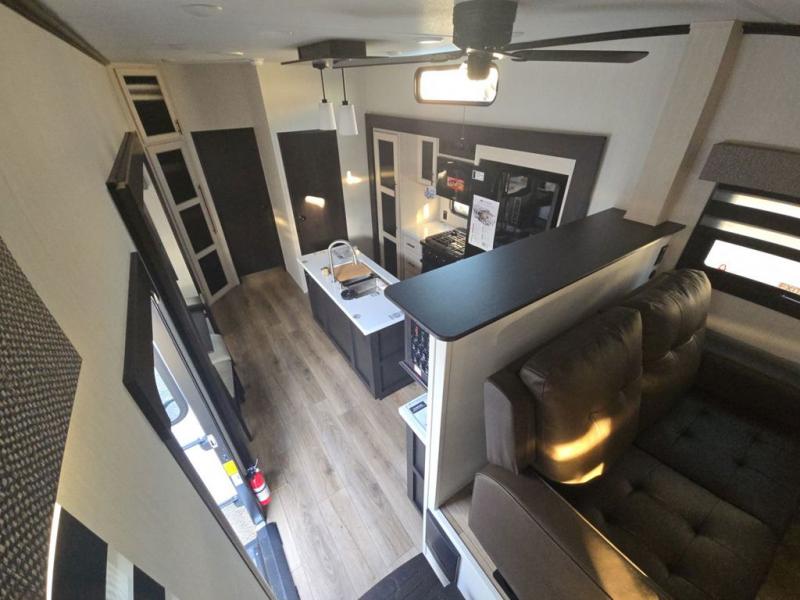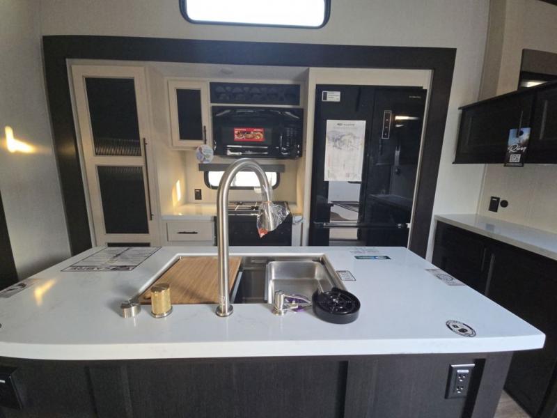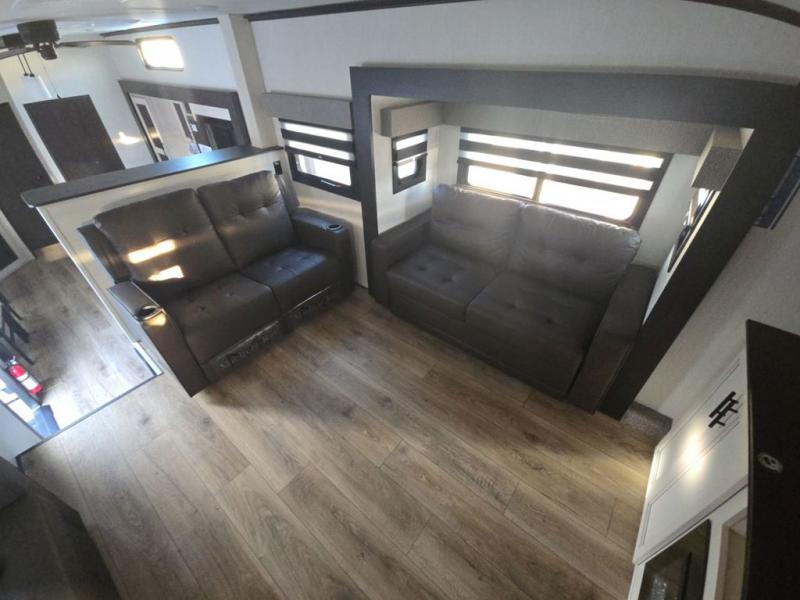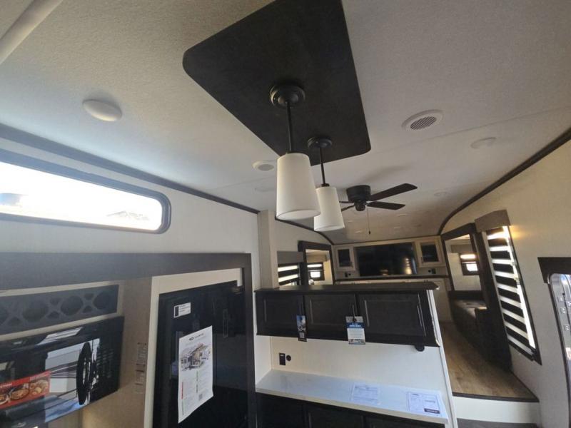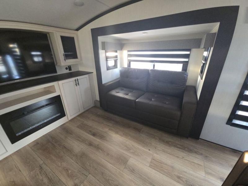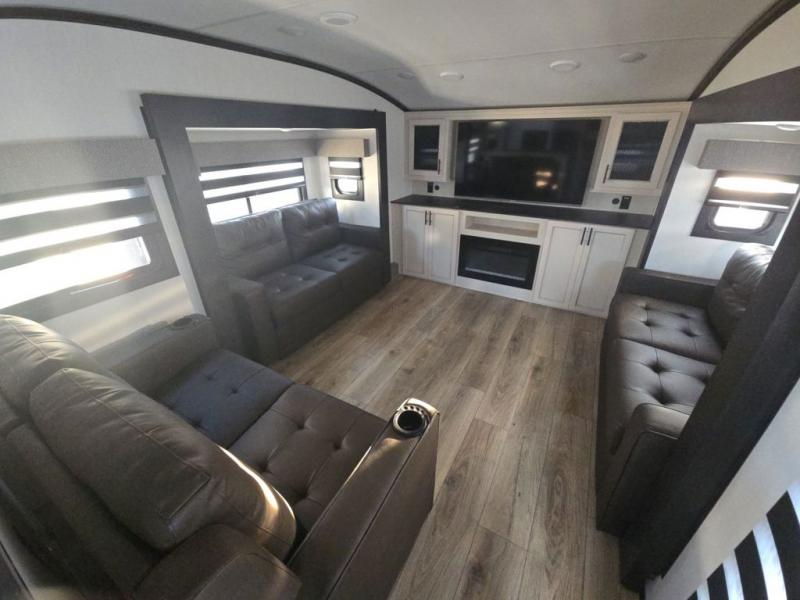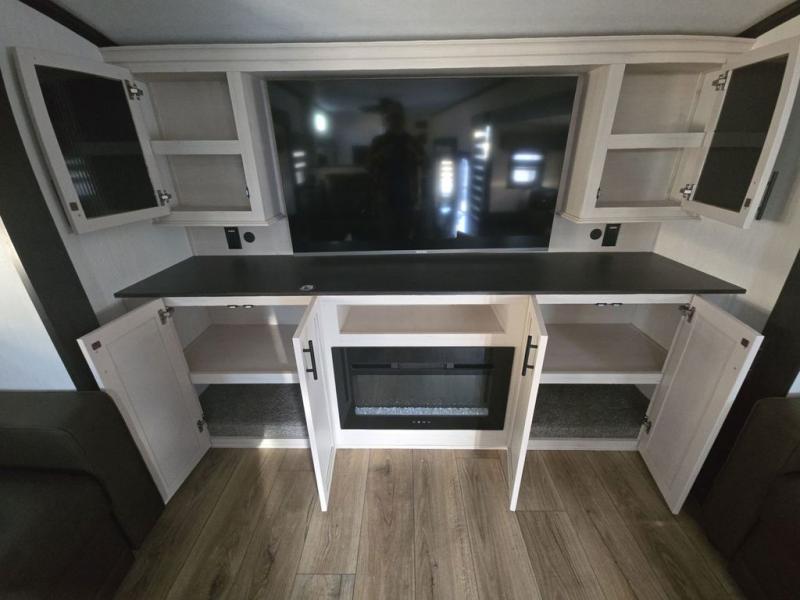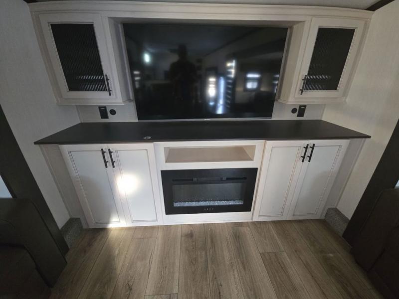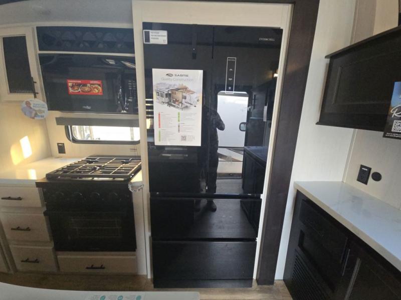 This Sabre fifth wheel with a full and half bath is sure to be a crowd pleaser! The front living area is the perfect place for everyone to visit each other comfortably on the two tri-fold sofas that can be transformed into extra sleeping spaces, or at the theater seating for complete relaxation. You will also find an entertainment center with a fireplace and a TV. This Sabre has a kitchen filled with convenient features, such as a 12V refrigerator with French doors, a kitchen island, and a lighted pantry with motion sensors. The rear master suite has access to its very own full bathroom with a double-sink vanity for two to get ready at once, and a wardrobe with washer and dryer prep for convenience!