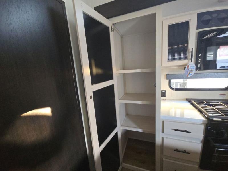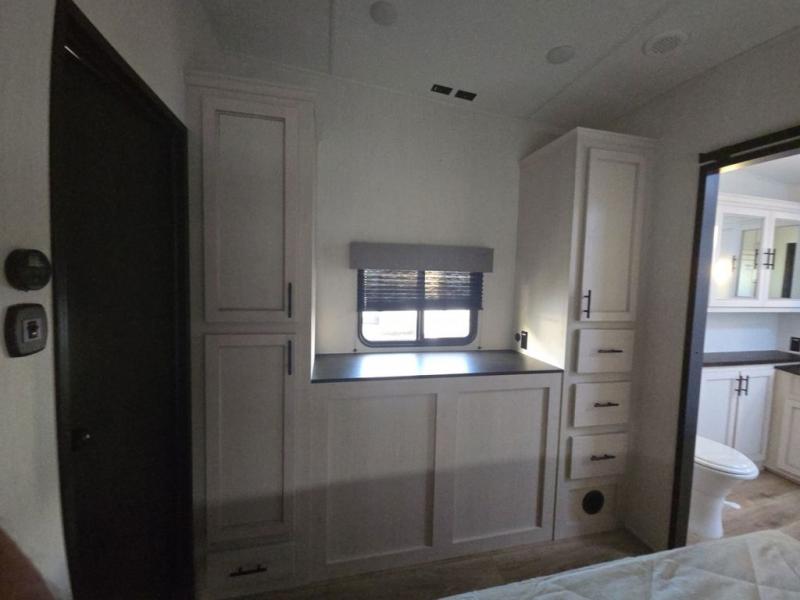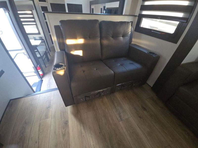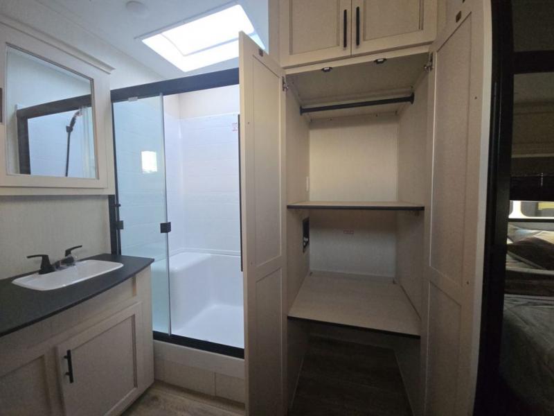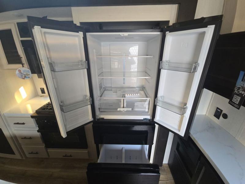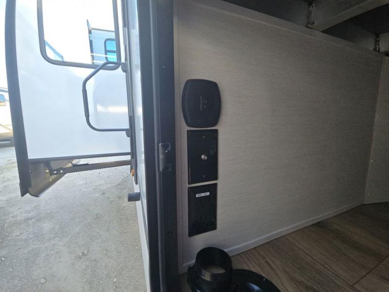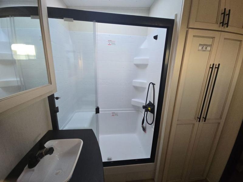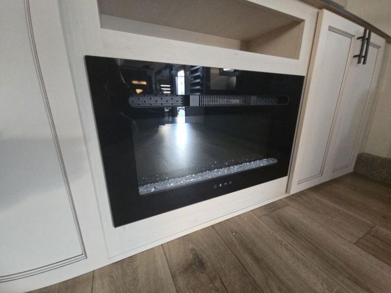 This Sabre fifth wheel with a full and half bath is sure to be a crowd pleaser! The front living area is the perfect place for everyone to visit each other comfortably on the two tri-fold sofas that can be transformed into extra sleeping spaces, or at the theater seating for complete relaxation. You will also find an entertainment center with a fireplace and a TV. This Sabre has a kitchen filled with convenient features, such as a 12V refrigerator with French doors, a kitchen island, and a lighted pantry with motion sensors. The rear master suite has access to its very own full bathroom with a double-sink vanity for two to get ready at once, and a wardrobe with washer and dryer prep for convenience!