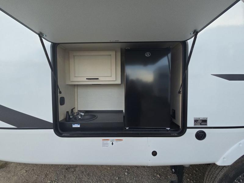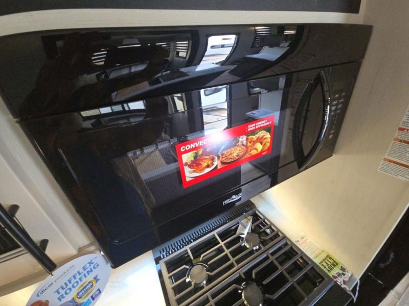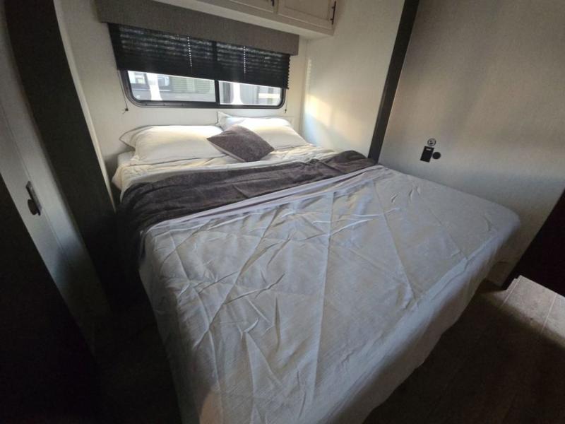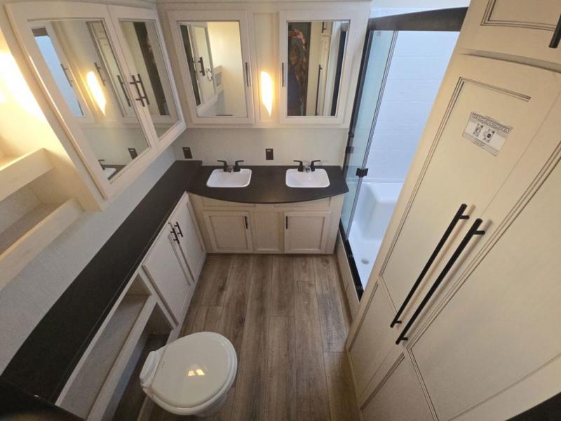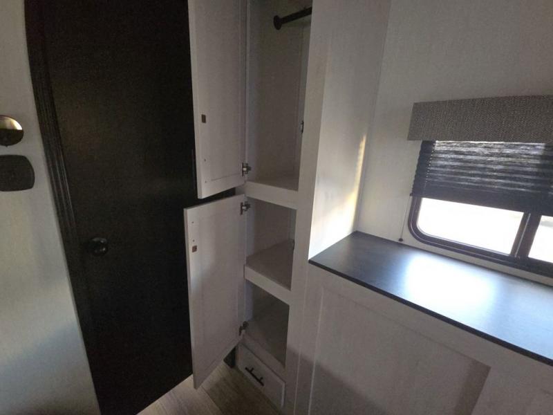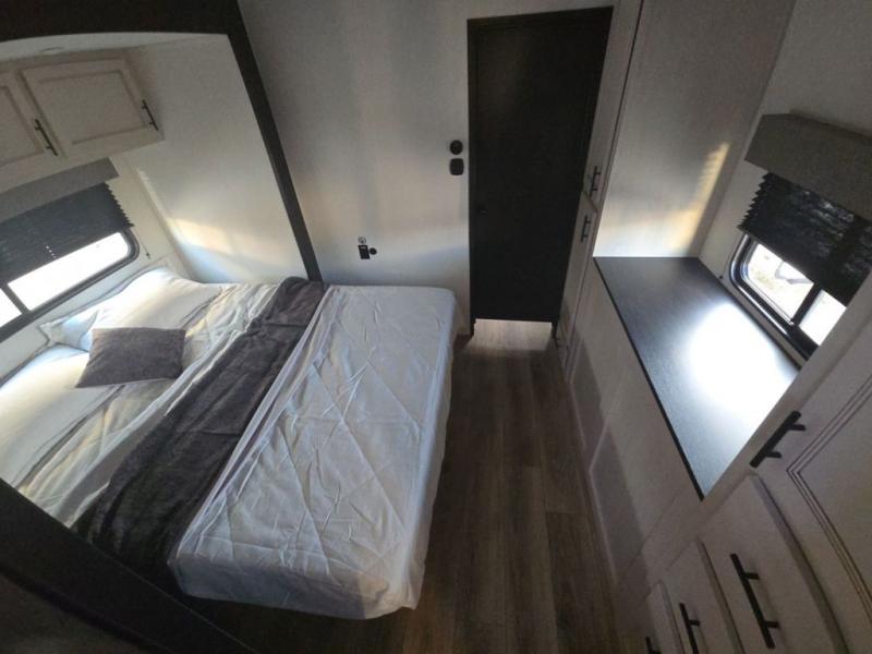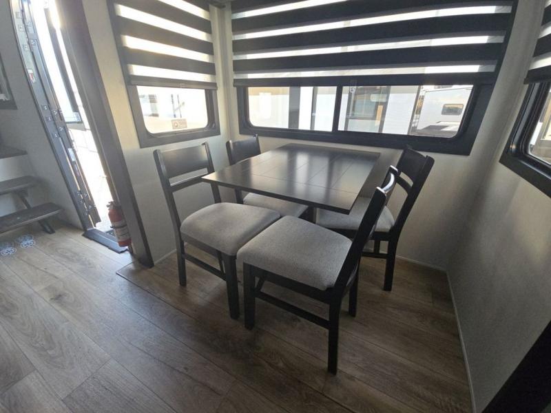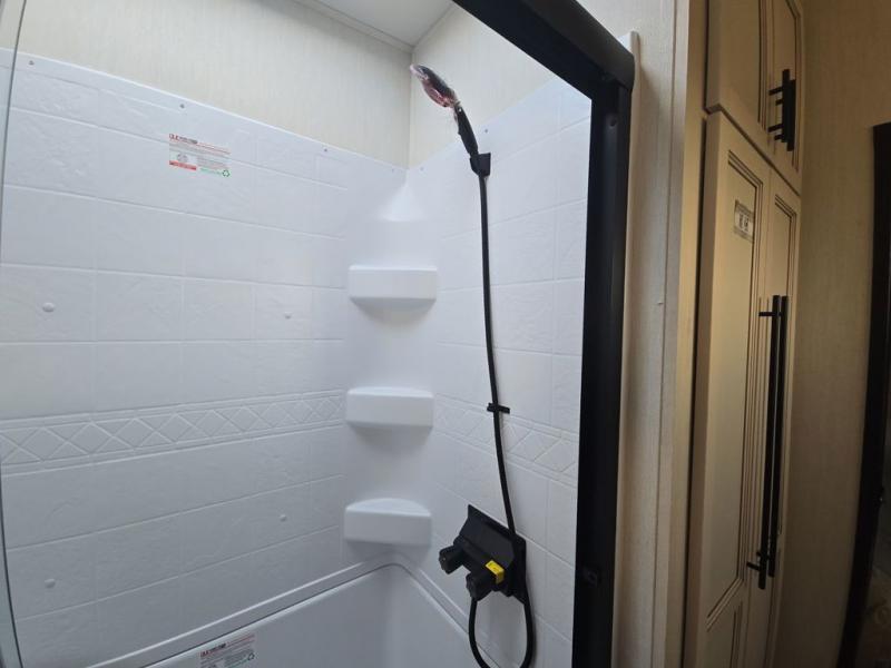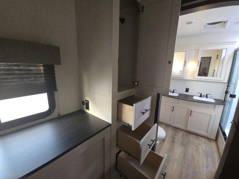 This Sabre fifth wheel with a full and half bath is sure to be a crowd pleaser! The front living area is the perfect place for everyone to visit each other comfortably on the two tri-fold sofas that can be transformed into extra sleeping spaces, or at the theater seating for complete relaxation. You will also find an entertainment center with a fireplace and a TV. This Sabre has a kitchen filled with convenient features, such as a 12V refrigerator with French doors, a kitchen island, and a lighted pantry with motion sensors. The rear master suite has access to its very own full bathroom with a double-sink vanity for two to get ready at once, and a wardrobe with washer and dryer prep for convenience!