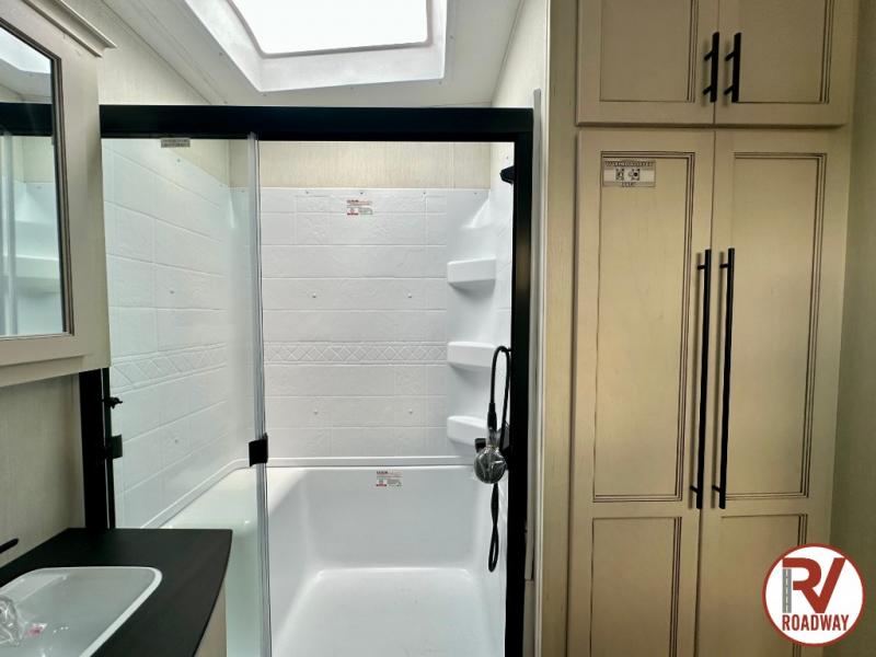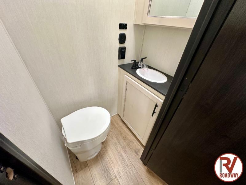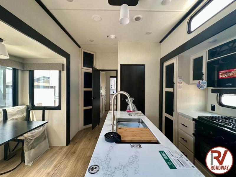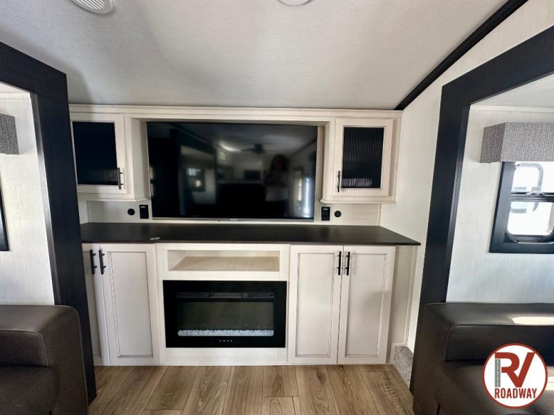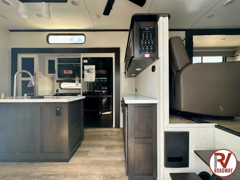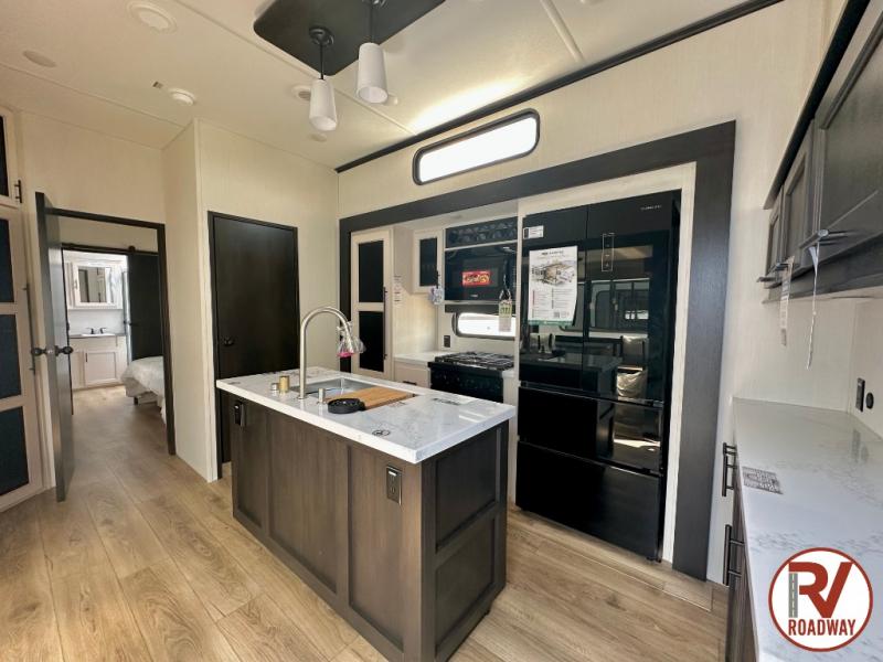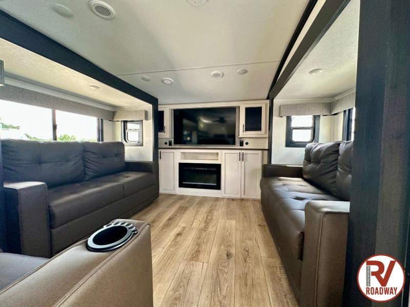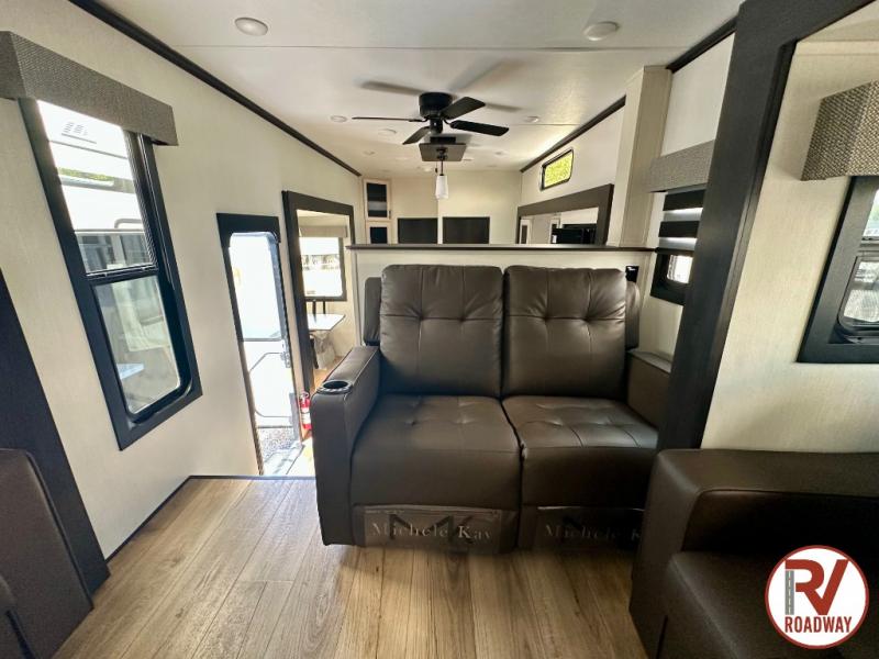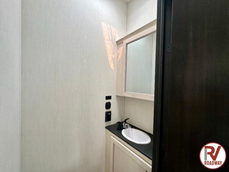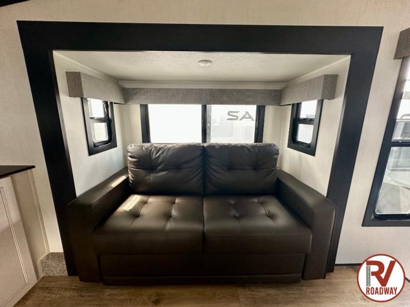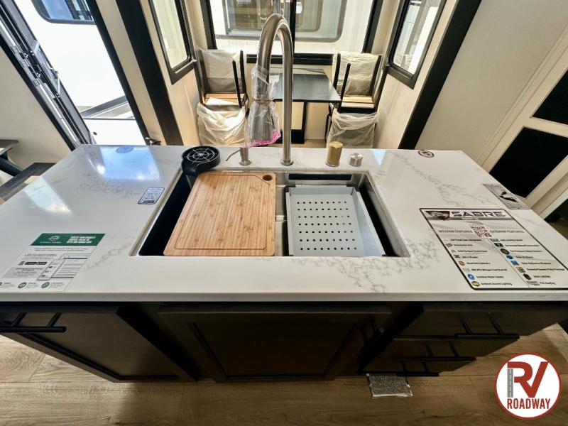 This Sabre fifth wheel with a full and half bath is sure to be a crowd pleaser! The front living area is the perfect place for everyone to visit each other comfortably on the two tri-fold sofas that can be transformed into extra sleeping spaces, or at the theater seating for complete relaxation. You will also find an entertainment center with a fireplace and a TV. This Sabre has a kitchen filled with convenient features, such as a 12V refrigerator with French doors, a kitchen island, and a lighted pantry with motion sensors. The rear master suite has access to its very own full bathroom with a double-sink vanity for two to get ready at once, and a wardrobe with washer and dryer prep for convenience!