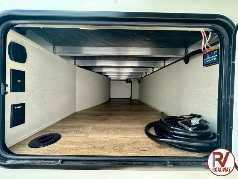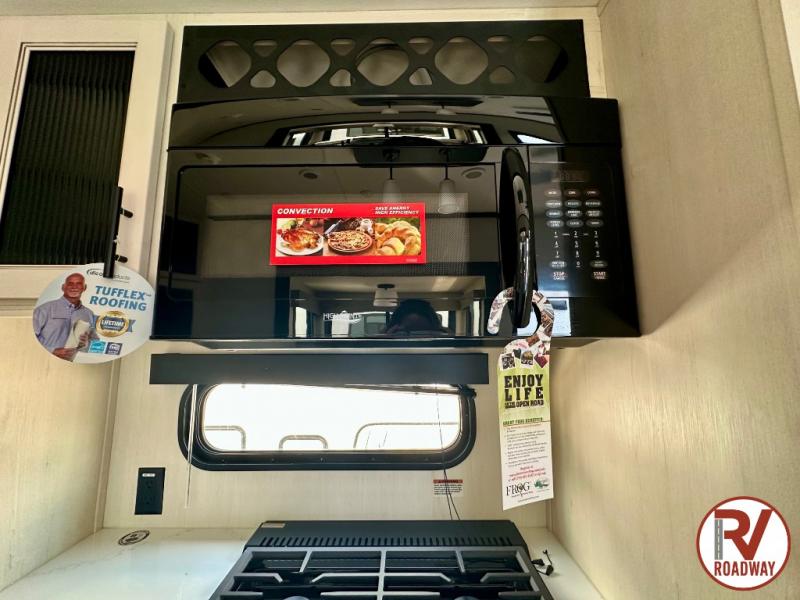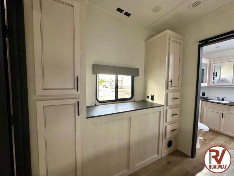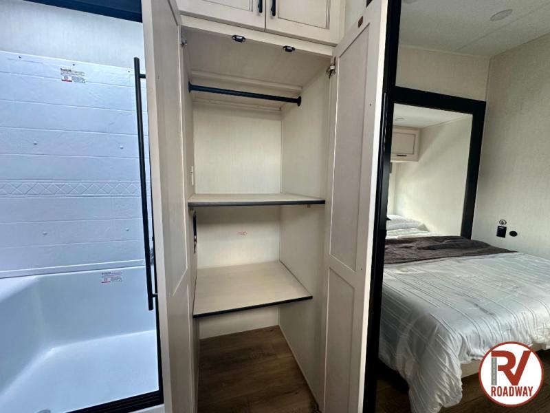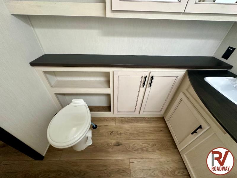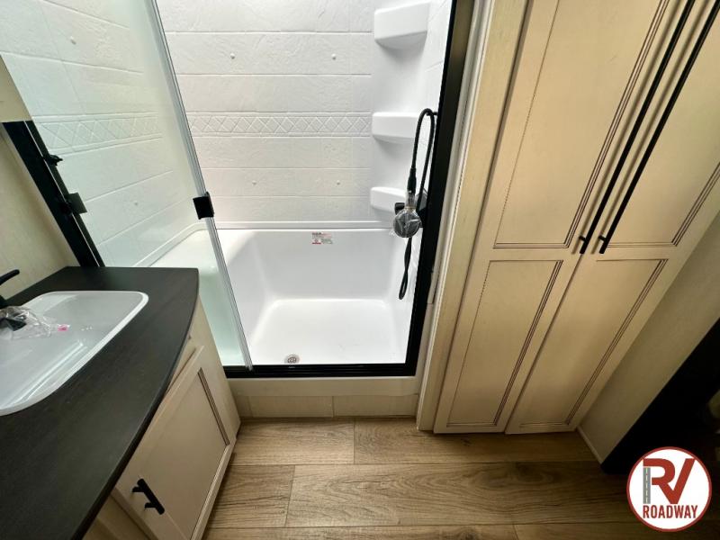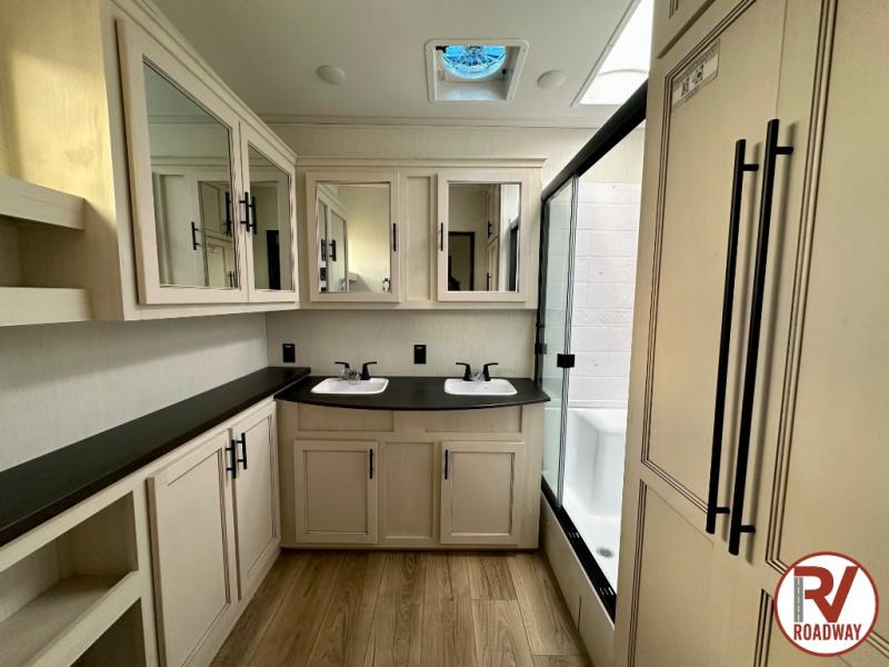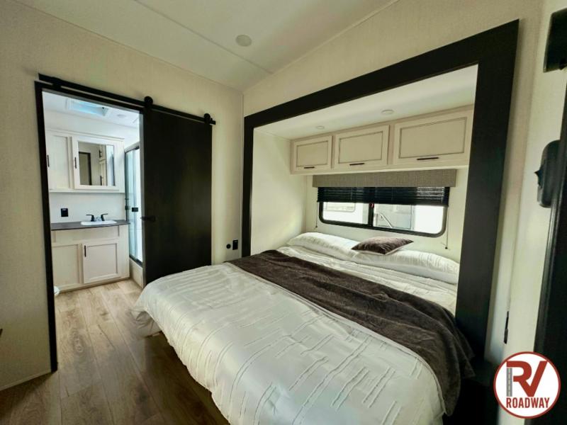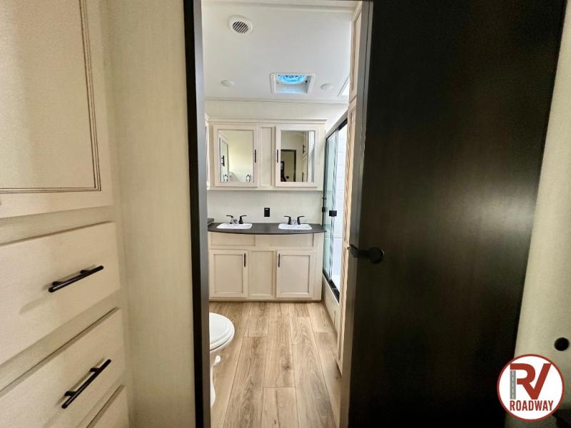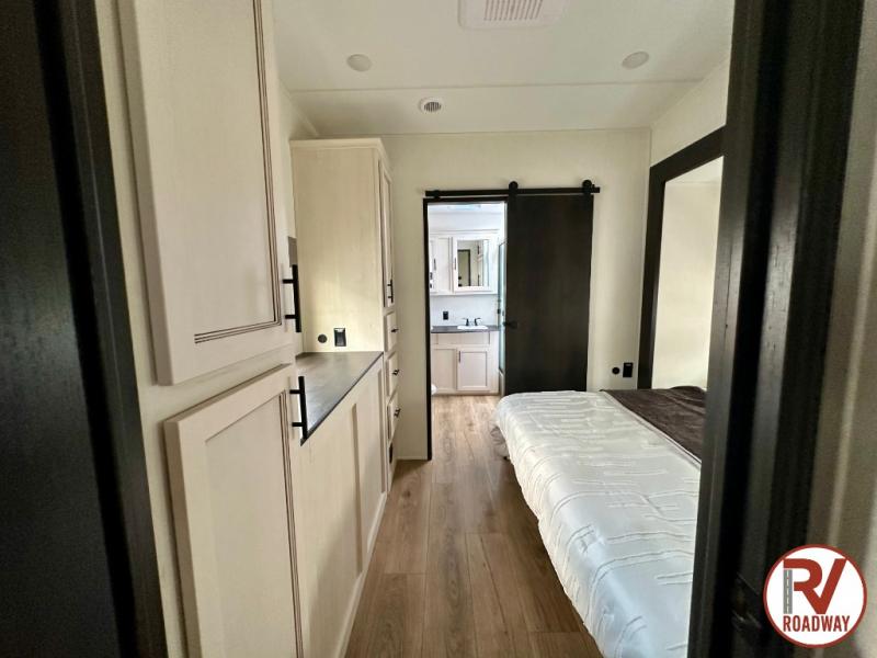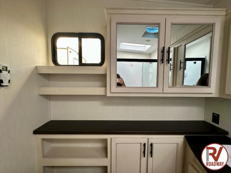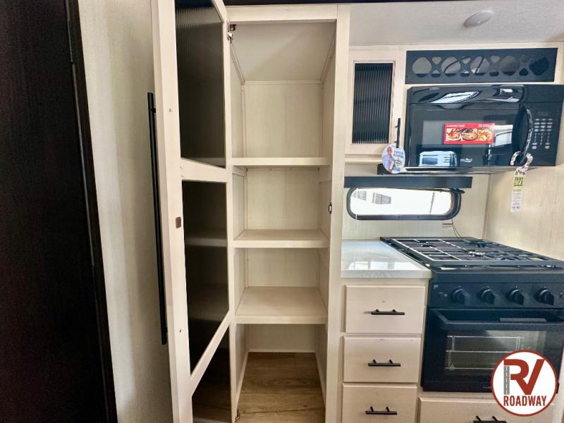 This Sabre fifth wheel with a full and half bath is sure to be a crowd pleaser! The front living area is the perfect place for everyone to visit each other comfortably on the two tri-fold sofas that can be transformed into extra sleeping spaces, or at the theater seating for complete relaxation. You will also find an entertainment center with a fireplace and a TV. This Sabre has a kitchen filled with convenient features, such as a 12V refrigerator with French doors, a kitchen island, and a lighted pantry with motion sensors. The rear master suite has access to its very own full bathroom with a double-sink vanity for two to get ready at once, and a wardrobe with washer and dryer prep for convenience!