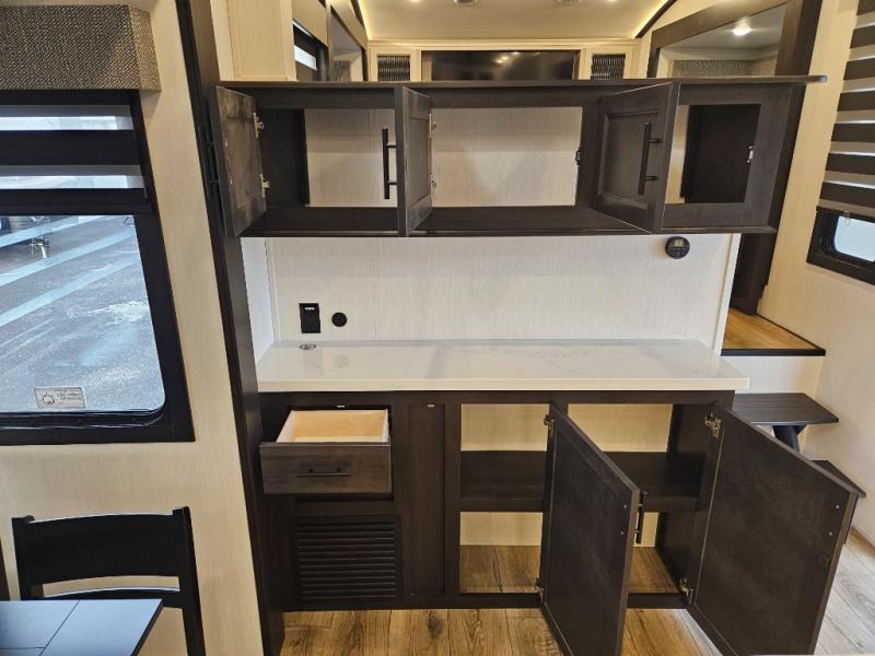 Chef’s Dream Kitchen: The Sabre 37FLL offers a residential-style kitchen with stainless steel appliances, kitchen island, oversized pantry, and plenty of counter space to make cooking on the road easier than ever.