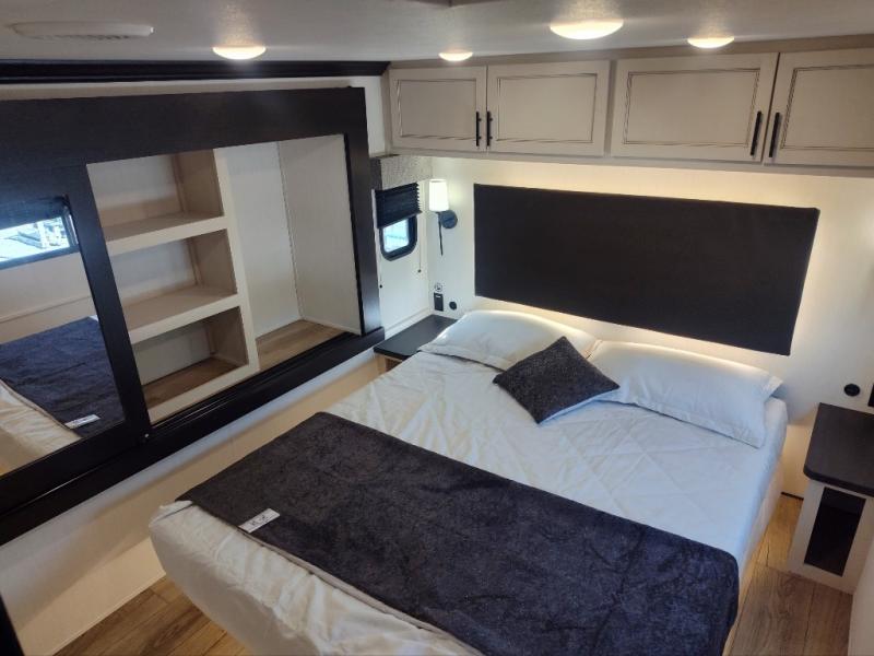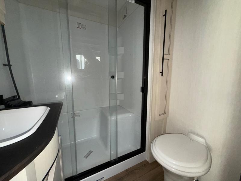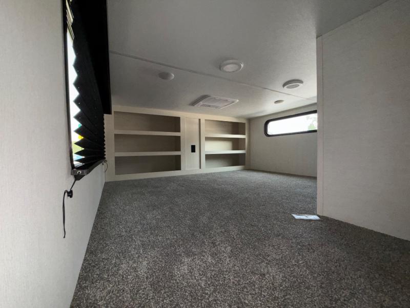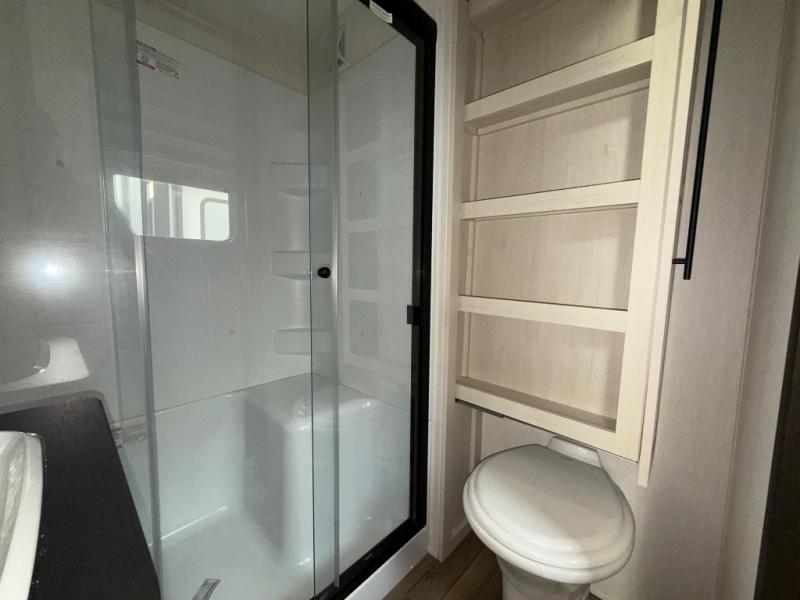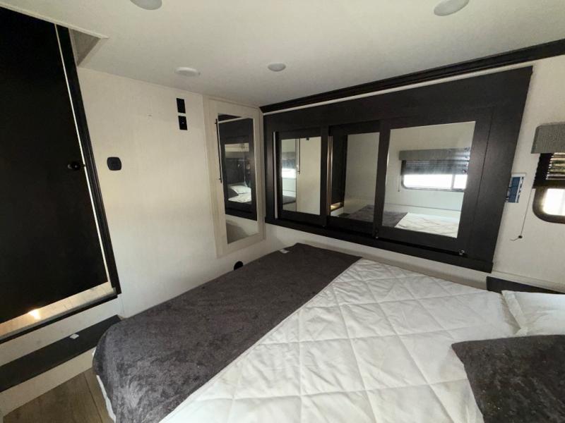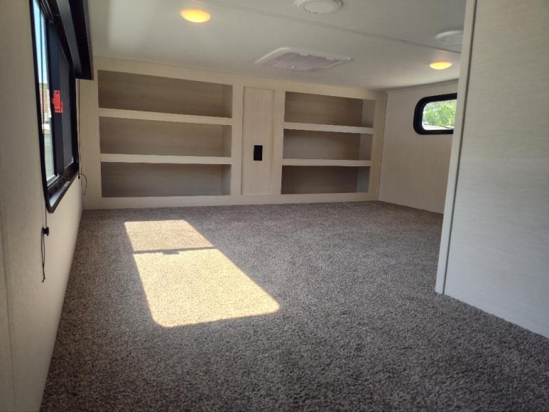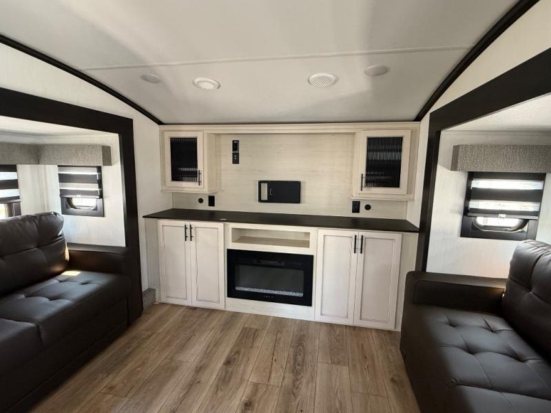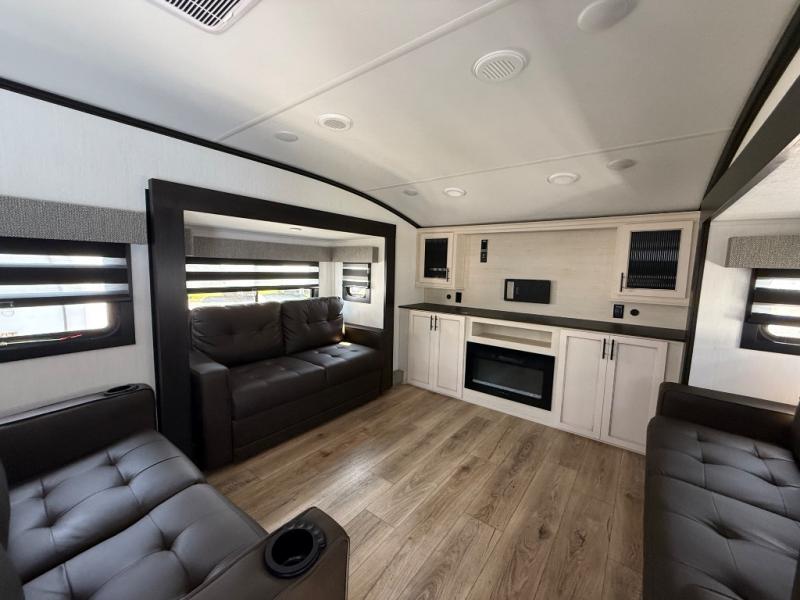 There is only one word that can describe this Sabre fifth wheel fabulous! You will be amazed by the amount of comfort and convenience that is scattered all throughout this model for you and your family or friends. From the tri-fold sofa slides and theater seating to the rear bedroom with its camper king bed and wardrobe slide out, you will always have a place to relax and unwind. Not only that, but there is also a double loft area up above the bedroom and bath which has sleeping space, storage, a wardrobe, and railing for safety. The cook will enjoy the 12V refrigerator with French doors and pantry for all of your food storage needs, and the table with chairs is the perfect place to sit down and enjoy a delicious meal or play board games.