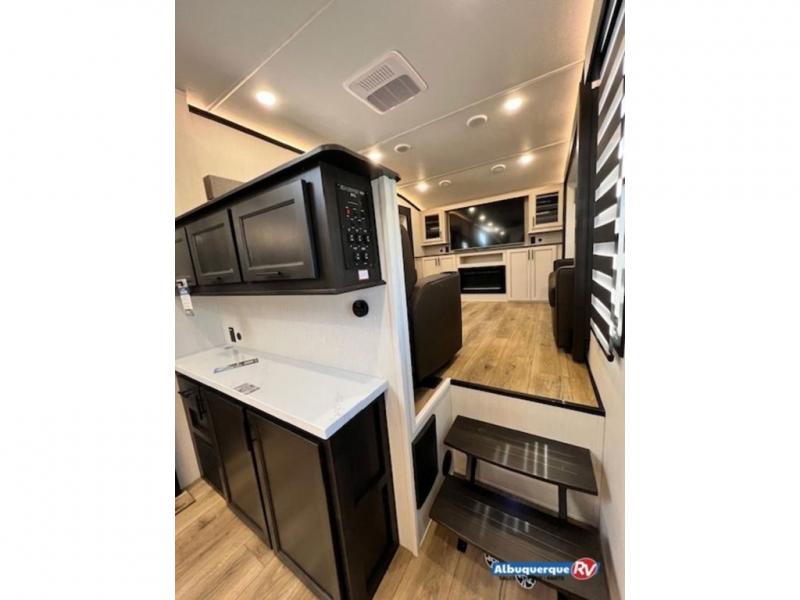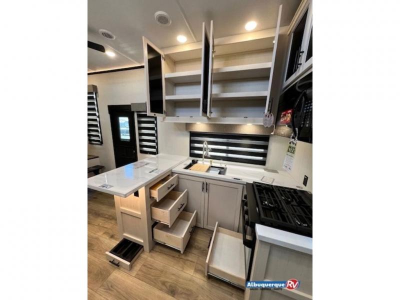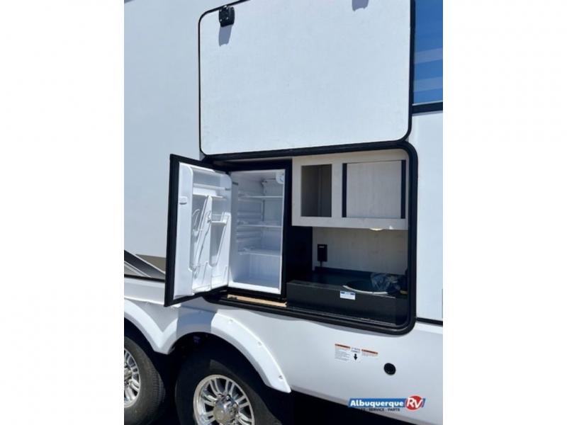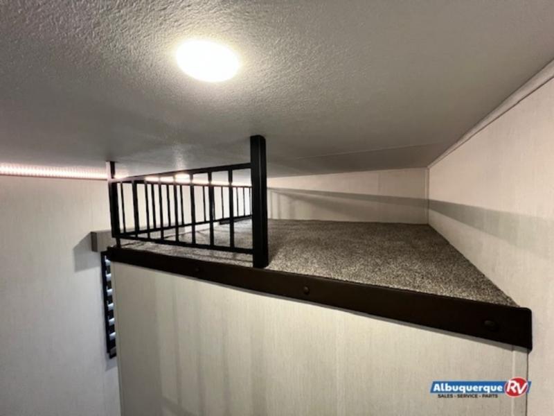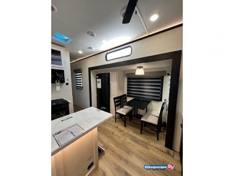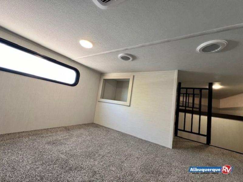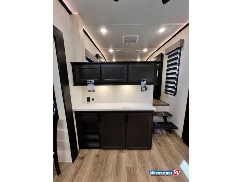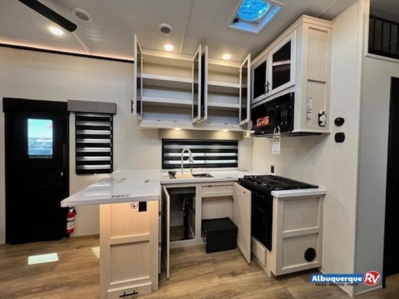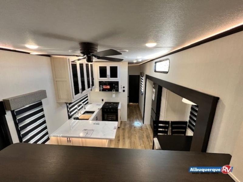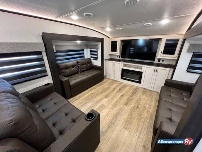 There is only one word that can describe this Sabre fifth wheel; fabulous! You will be amazed by the amount of comfort and convenience that is scattered all throughout this model for you and your family or friends. From the tri-fold sofa slides and theater seating to the rear bedroom with its camper king bed and wardrobe slide out, you will always have a place to relax and unwind. Not only that, but there is also a double loft area up above the bedroom and bath which has sleeping space, storage, a wardrobe, and railing for safety. The cook will enjoy the 12V refrigerator with French doors and pantry for all of your food storage needs, and the table with chairs is the perfect place to sit down and enjoy a delicious meal or play board games.