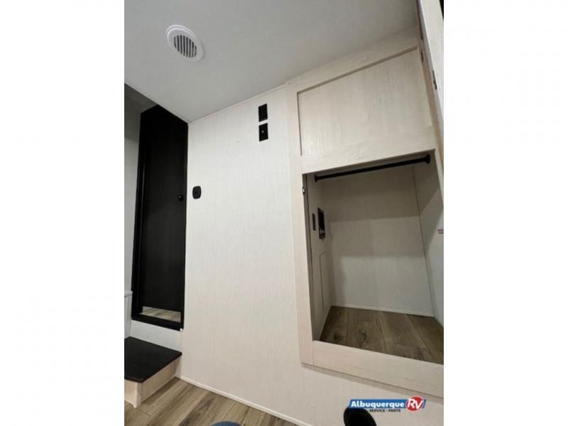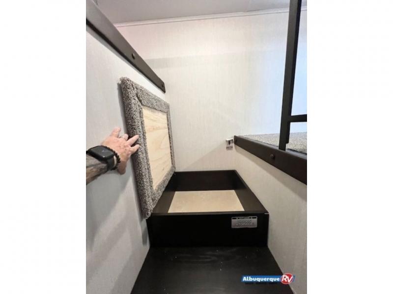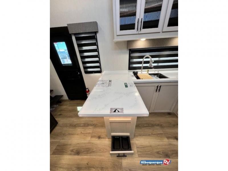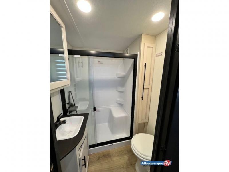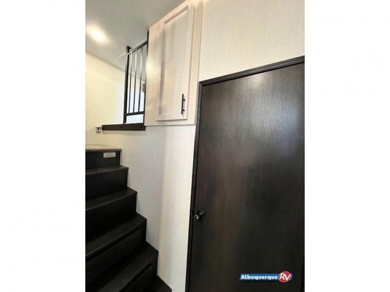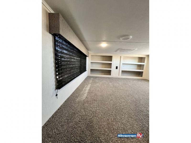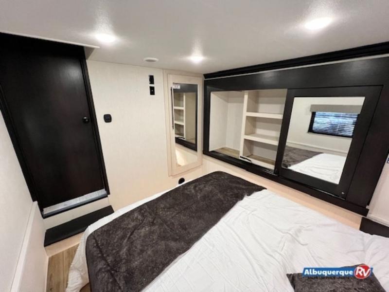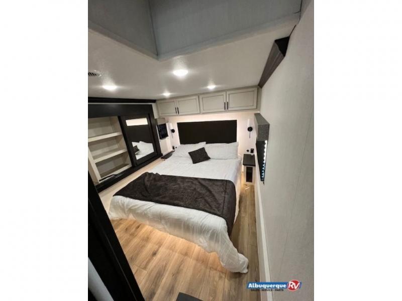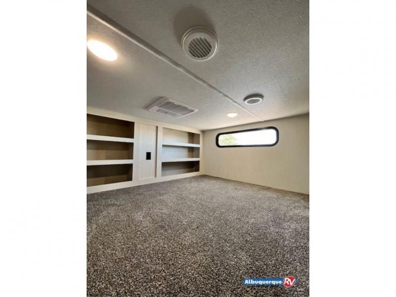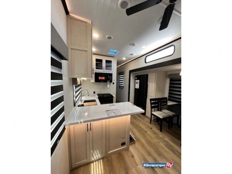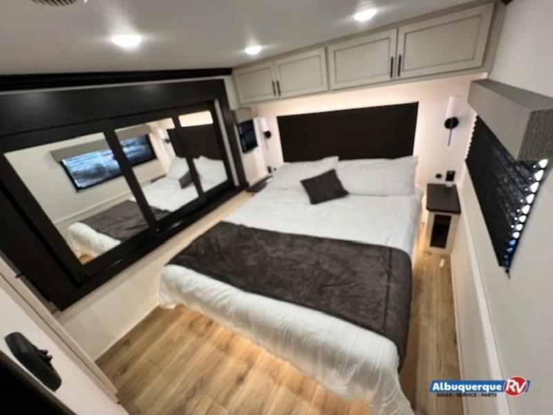 There is only one word that can describe this Sabre fifth wheel; fabulous! You will be amazed by the amount of comfort and convenience that is scattered all throughout this model for you and your family or friends. From the tri-fold sofa slides and theater seating to the rear bedroom with its camper king bed and wardrobe slide out, you will always have a place to relax and unwind. Not only that, but there is also a double loft area up above the bedroom and bath which has sleeping space, storage, a wardrobe, and railing for safety. The cook will enjoy the 12V refrigerator with French doors and pantry for all of your food storage needs, and the table with chairs is the perfect place to sit down and enjoy a delicious meal or play board games.