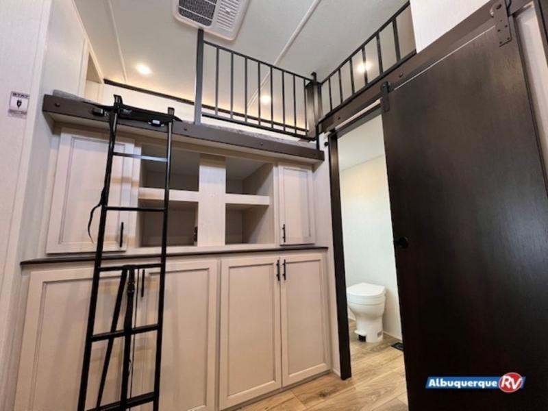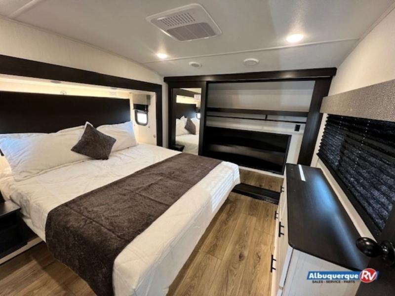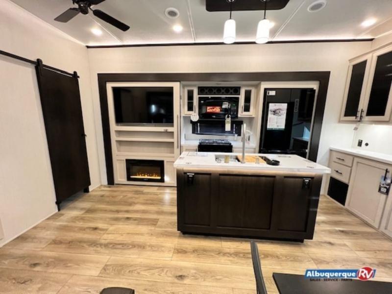 You won't believe all that this fifth wheel has to offer! Enjoy a good night's rest each night on the camper king bed slide in the front private bedroom which also has a front wardrobe with washer and dryer prep, and the rest of your group can sleep in the second bedroom. Inside this bedroom is a slide that houses a tri-fold sofa with a flip-up bunk above it, an entertainment center with storage, and a loft area above it all with two bunks and cabinets. The rear bedroom even has its very own rear full bathroom with a 36" x 24" shower to freshen up in each morning and one of the dual entry doors to the unit. The chef will enjoy using the kitchen island to prepare their best home cooked meals and everyone can gather together at the dinette/sofa combo conveniently across from the entertainment center with a fireplace.