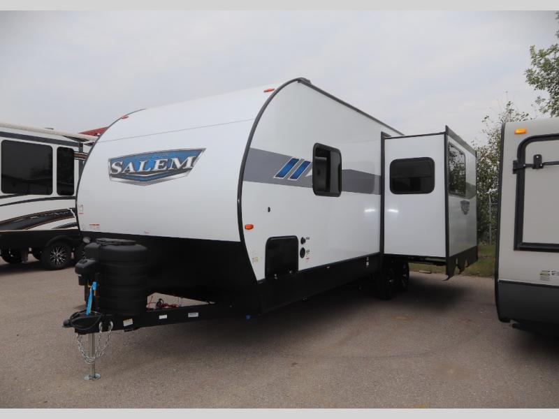 Enjoy years and years of memories with any one of these Forest River Salem travel trailers! They are built with a Dicor PVC roof membrane, a powder coated I-beam frame, and an aerodynamic front radius profile for an easier tow. The triple seal slide out system prevents water from seeping inside and keeps it outside where it belongs. The Best In Class Value Package includes upgraded designer furniture, seamless countertops with no T-mold, and two zone residential soundbars with FM, Bluetooth, HDMI and USB. You will also appreciate the heated and enclosed Accessi-Belly with removable underbelly panels, the power tongue jack with an LED light, and the designated CPAP storage. Some new upgraded features include: a Versa-Tilt bed, a 60K tankless water heater, upgraded showerhead, and so much more!