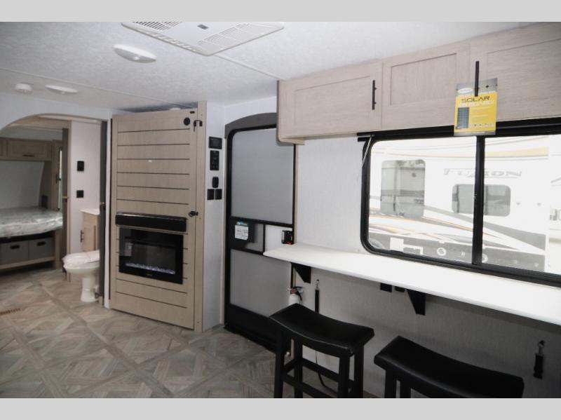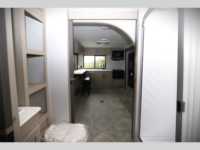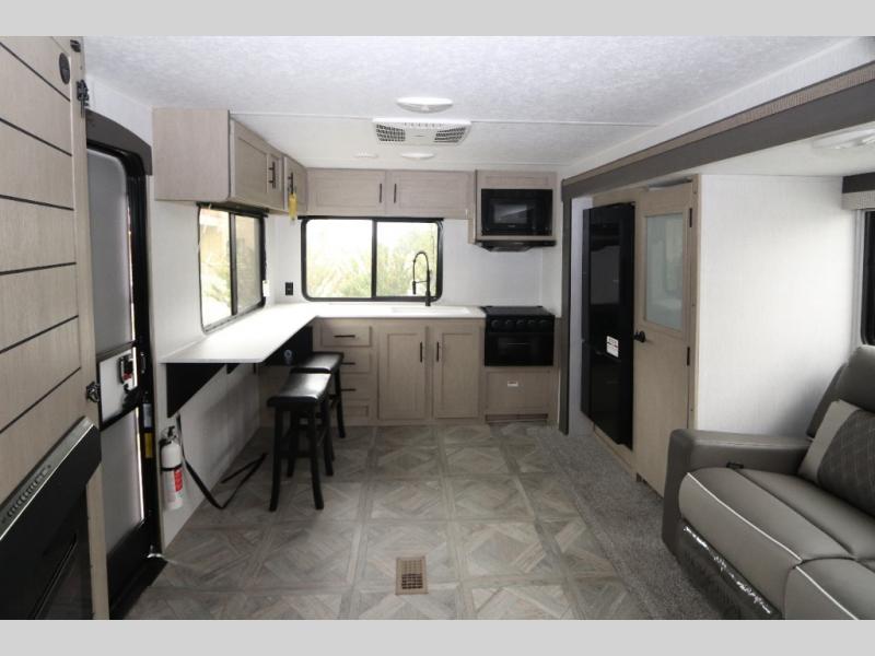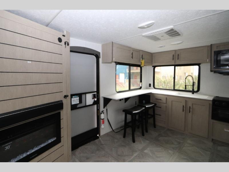 You're going to love cooking in the rear kitchen of this travel trailer! It has everything you need to prepare delicious home cooked meals including a large pantry and oversized fridge, plus there are two bar stools to sit on while you enjoy them. The theater seating is conveniently across from the swiveling entertainment center which has a fireplace and hidden shelves behind it for your games and movies. As you walk-through the bathroom, you will notice a walk-in shower to the left and a toilet and sink to the right. It leads directly into the front private bedroom which has a Versa-Tilt custom king bed to lay your head on at night and wardrobes/nightstands on either side for your items!
