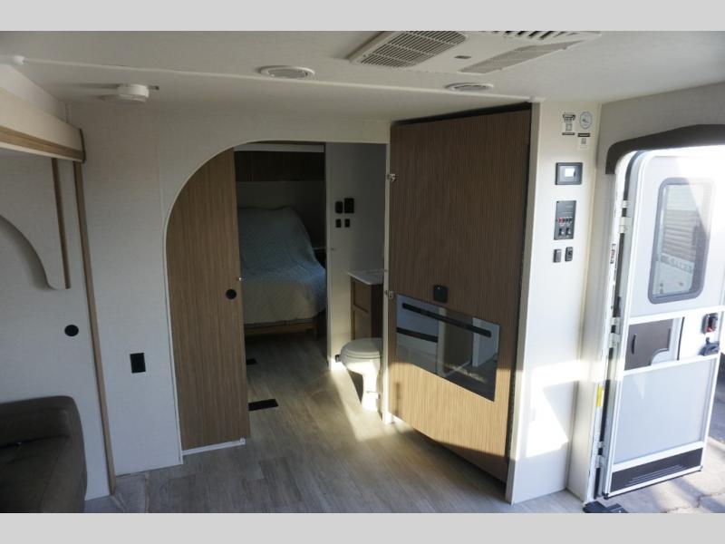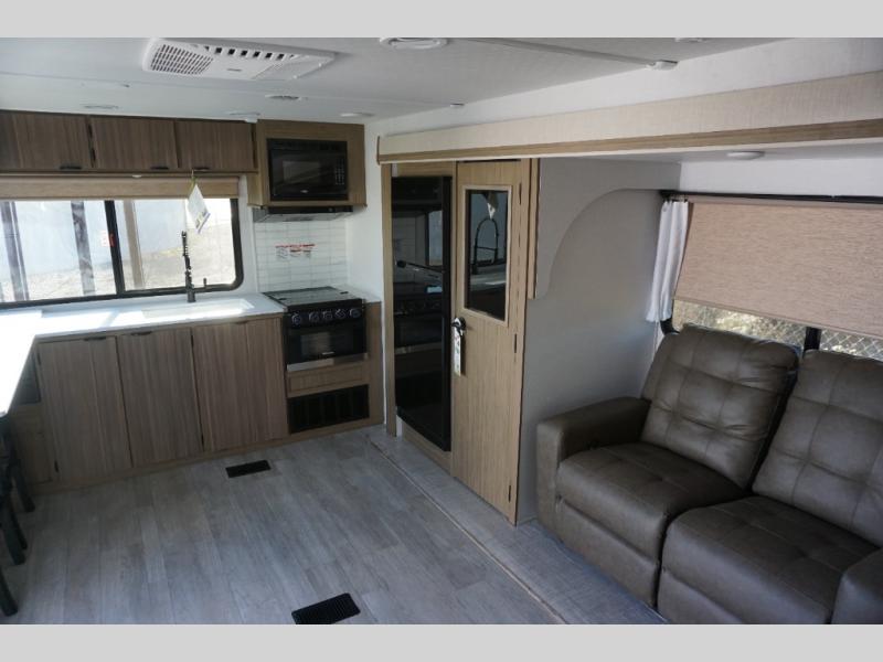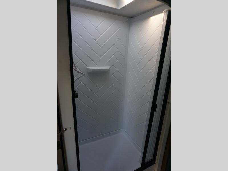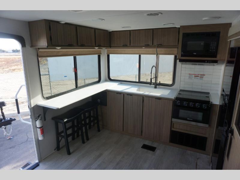 You're going to love cooking in the rear kitchen of this travel trailer! It has everything you need to prepare delicious home cooked meals including a large pantry and oversized fridge, plus there are two bar stools to sit on while you enjoy them. The theater seating is conveniently across from the swiveling entertainment center which has a fireplace and hidden shelves behind it for your games and movies. As you walk-through the bathroom, you will notice a walk-in shower to the left and a toilet and sink to the right. It leads directly into the front private bedroom which has a Versa-Tilt custom king bed to lay your head on at night and wardrobes/nightstands on either side for your items!