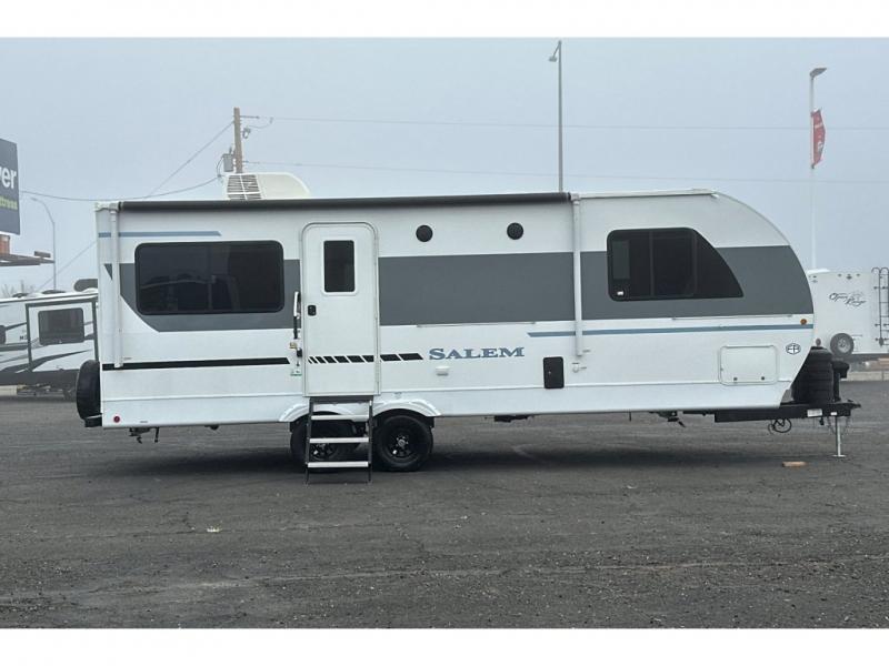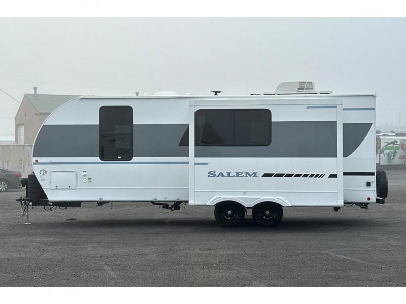 The Salem travel trailers are packed with hassle-free camping amenities! There are a variety of floorplans to choose from between three different regions. The heated and enclosed Accessibelly will help protect against the elements and debris during transport, and the exterior retro/metal redesign is sure to be eye-catching! There are stylish roller shades inside, along with updated backsplash, elegant curtain rods and curtains, plus many more interior comforts! Choose a Salem travel trailer today for quality and value!