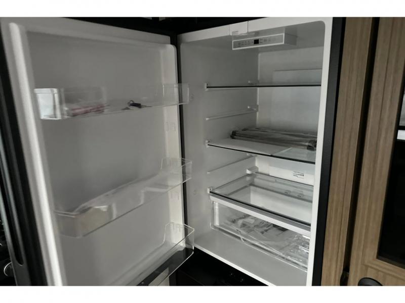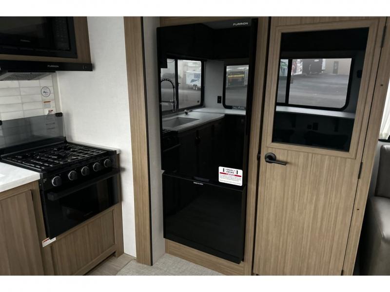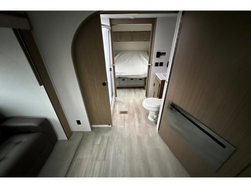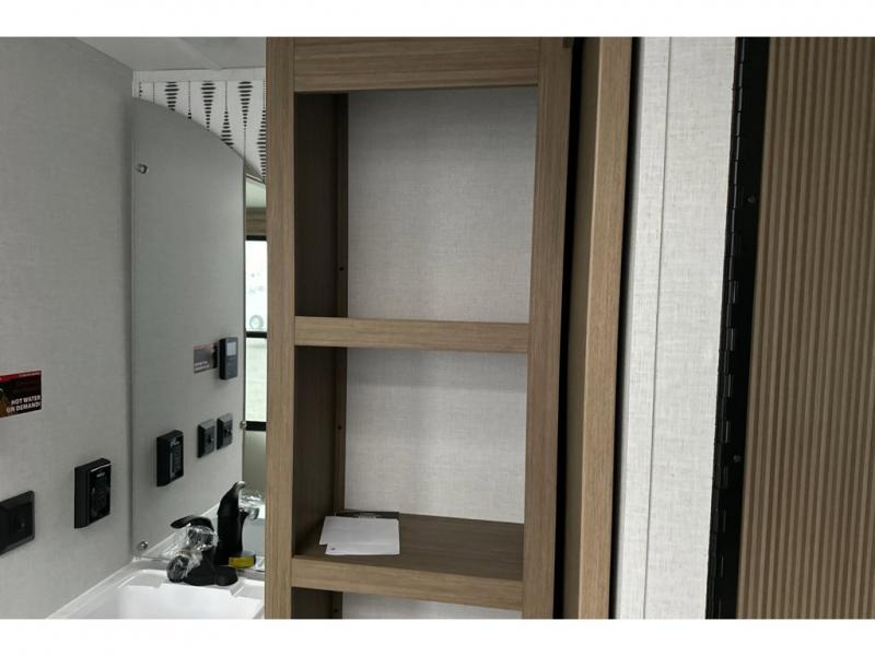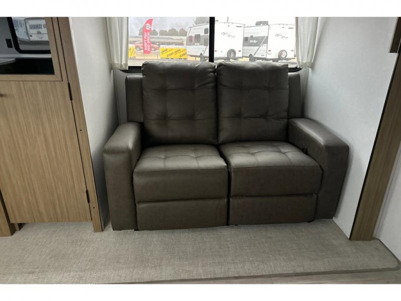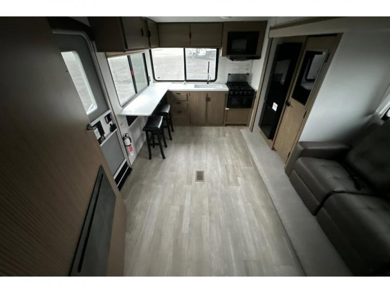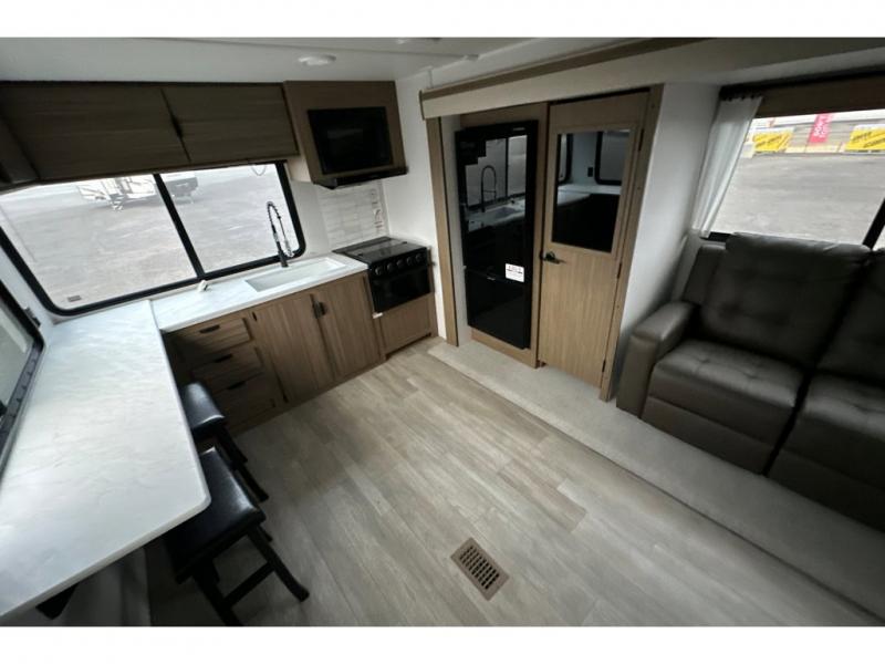 You're going to love cooking in the rear kitchen of this travel trailer! It has everything you need to prepare delicious home cooked meals including a large pantry and oversized fridge, plus there are two bar stools to sit on while you enjoy them. The theater seating is conveniently across from the swiveling entertainment center which has hidden shelves behind it for your games and movies. As you walk through the bathroom, you will notice a walk-in shower to the left and a toilet and sink to the right. It leads directly into the front private bedroom which has a Versa-Tilt custom king bed to lay your head on at night and a closet plus overhead storage for your items!