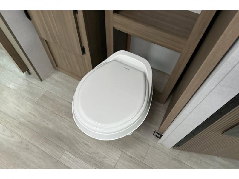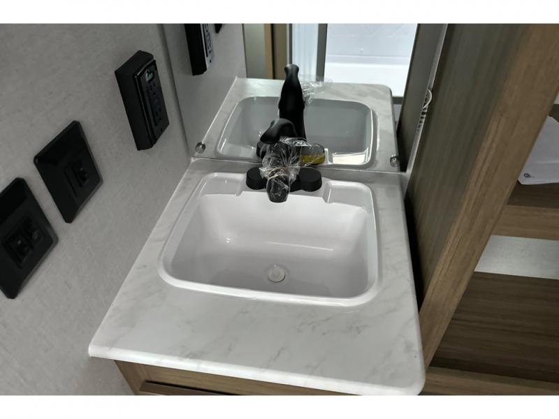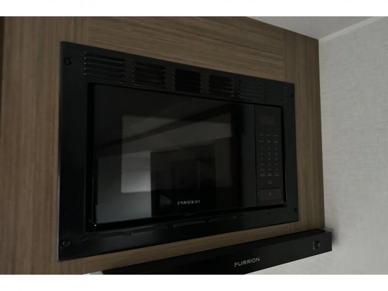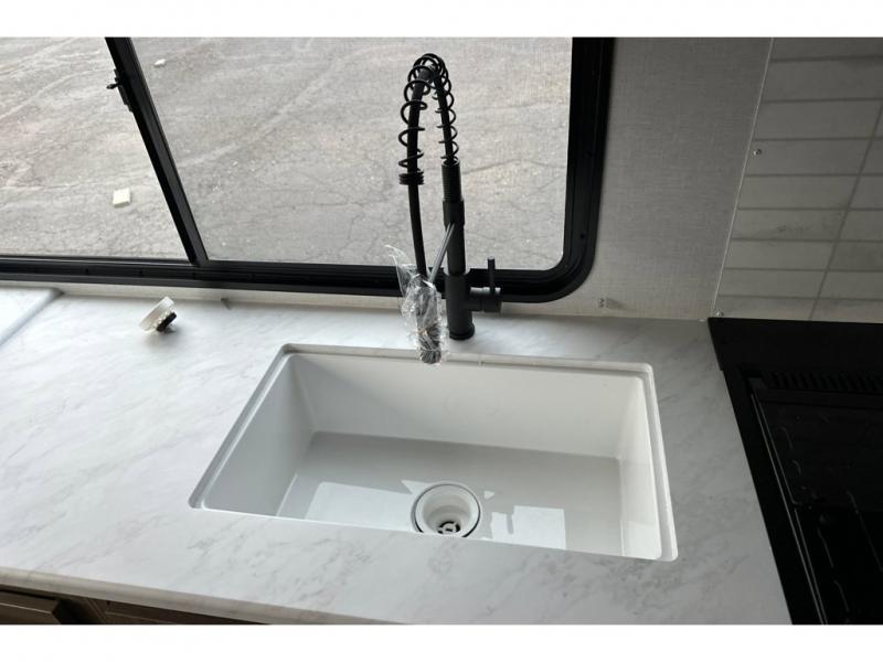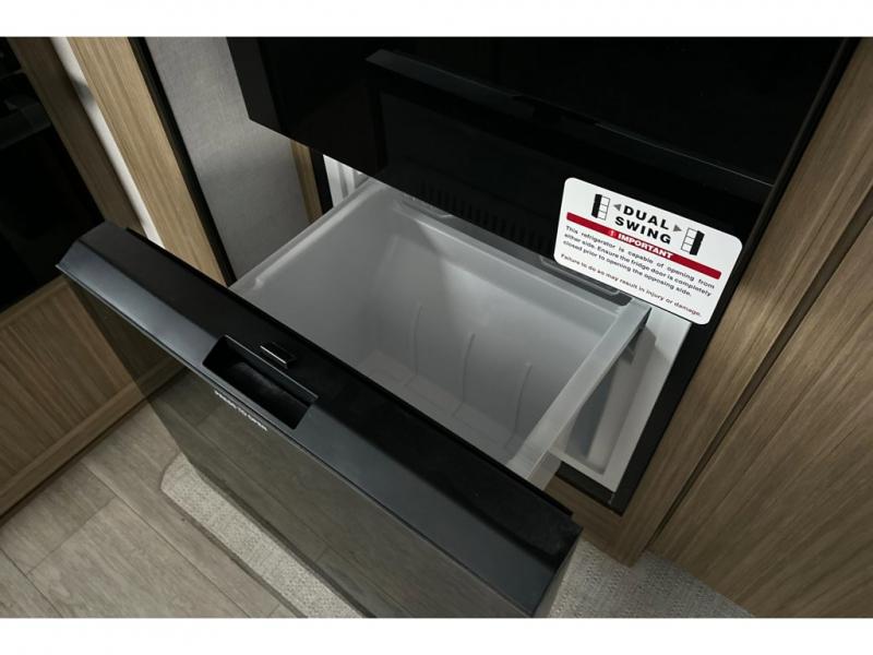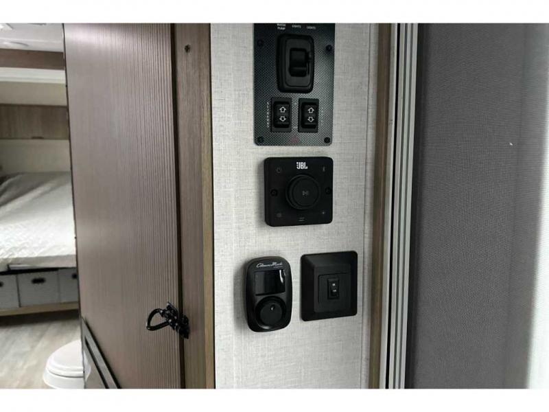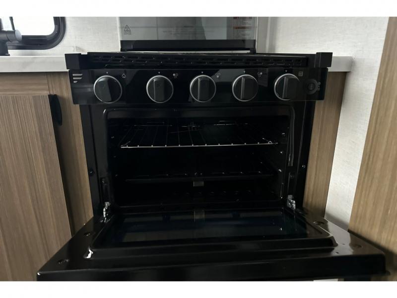 You're going to love cooking in the rear kitchen of this travel trailer! It has everything you need to prepare delicious home cooked meals including a large pantry and oversized fridge, plus there are two bar stools to sit on while you enjoy them. The theater seating is conveniently across from the swiveling entertainment center which has hidden shelves behind it for your games and movies. As you walk through the bathroom, you will notice a walk-in shower to the left and a toilet and sink to the right. It leads directly into the front private bedroom which has a Versa-Tilt custom king bed to lay your head on at night and a closet plus overhead storage for your items!