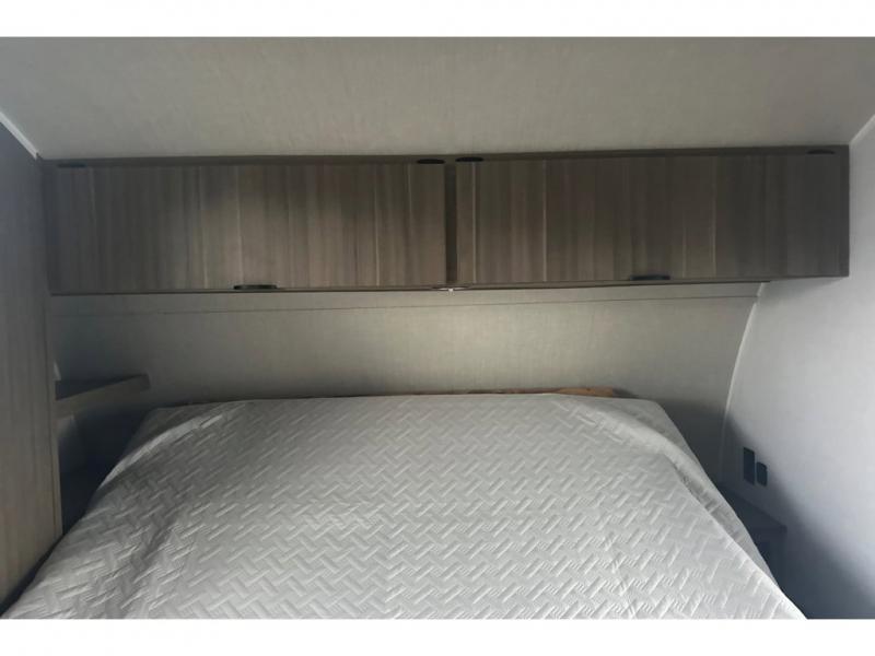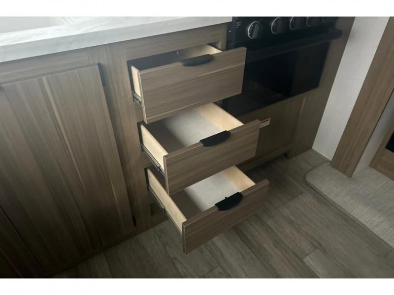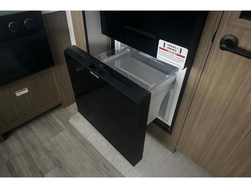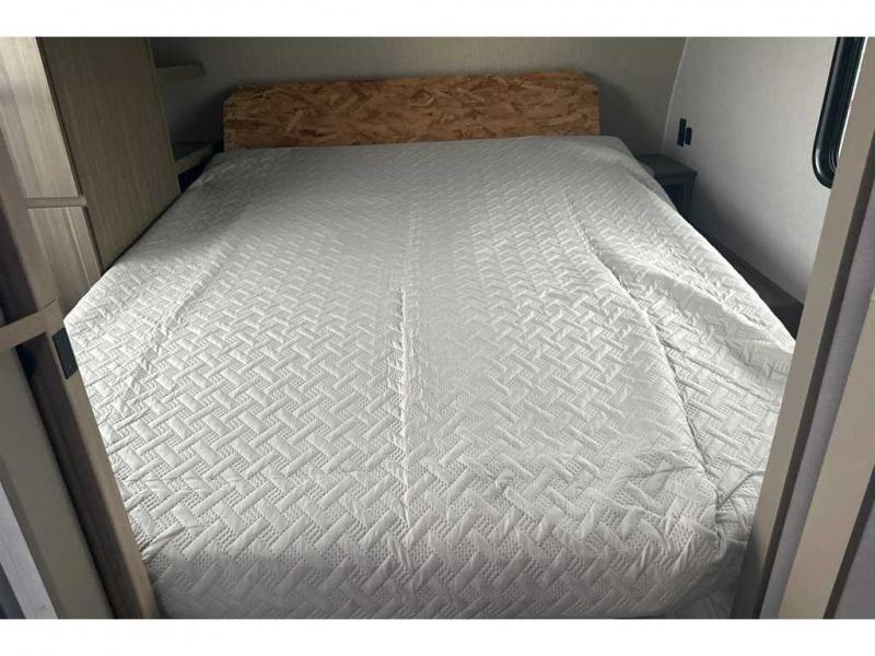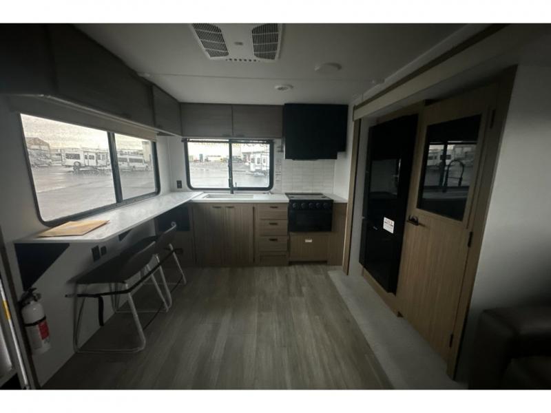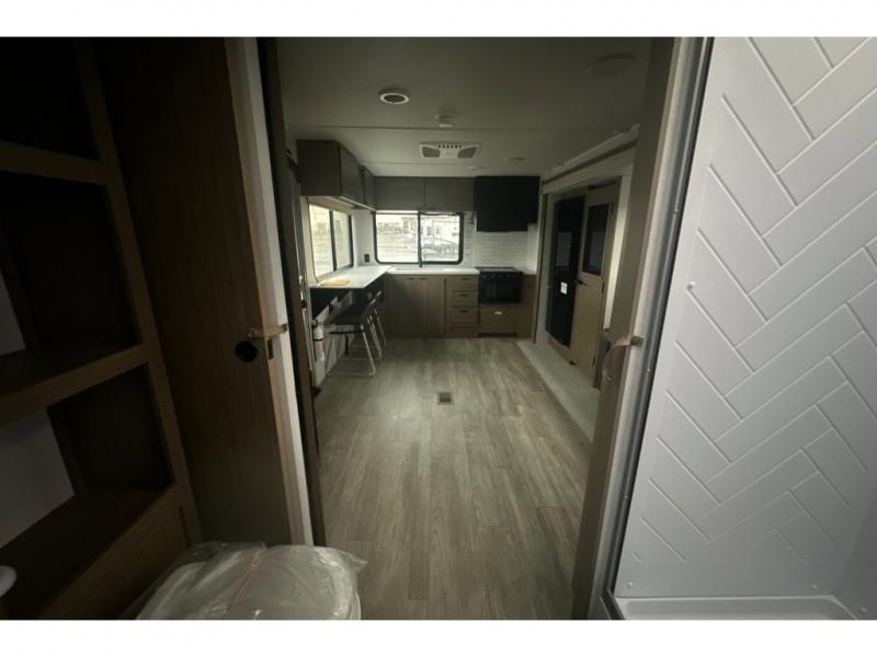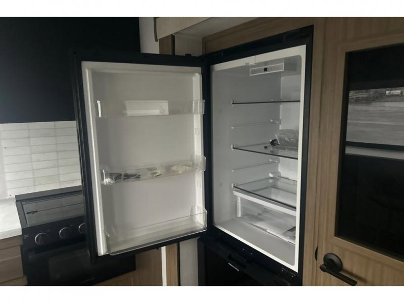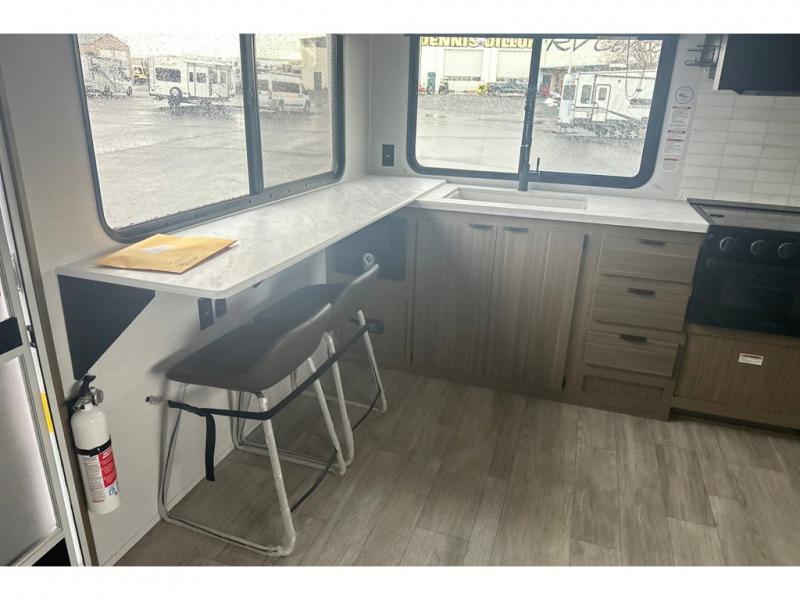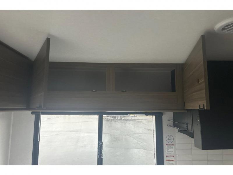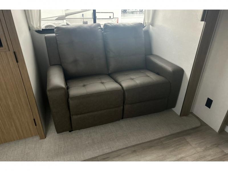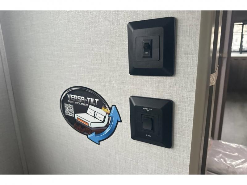 You're going to love cooking in the rear kitchen of this travel trailer! It has everything you need to prepare delicious home cooked meals including a large pantry and oversized fridge, plus there are two bar stools to sit on while you enjoy them. The theater seating is conveniently across from the swiveling entertainment center which has hidden shelves behind it for your games and movies. As you walk through the bathroom, you will notice a walk-in shower to the left and a toilet and sink to the right. It leads directly into the front private bedroom which has a Versa-Tilt custom king bed to lay your head on at night and a closet plus overhead storage for your items!