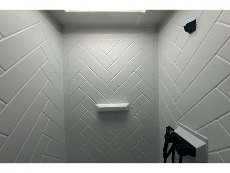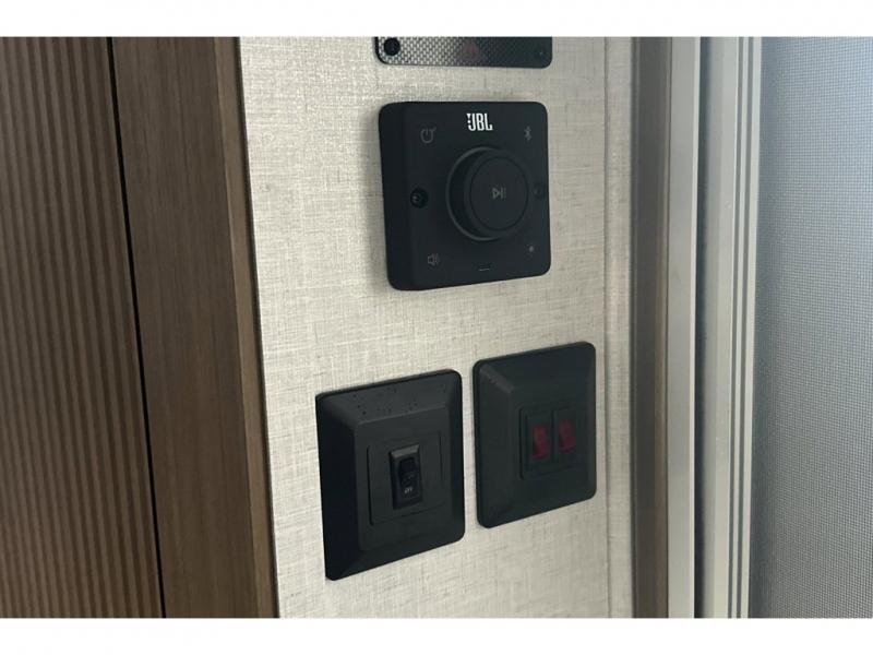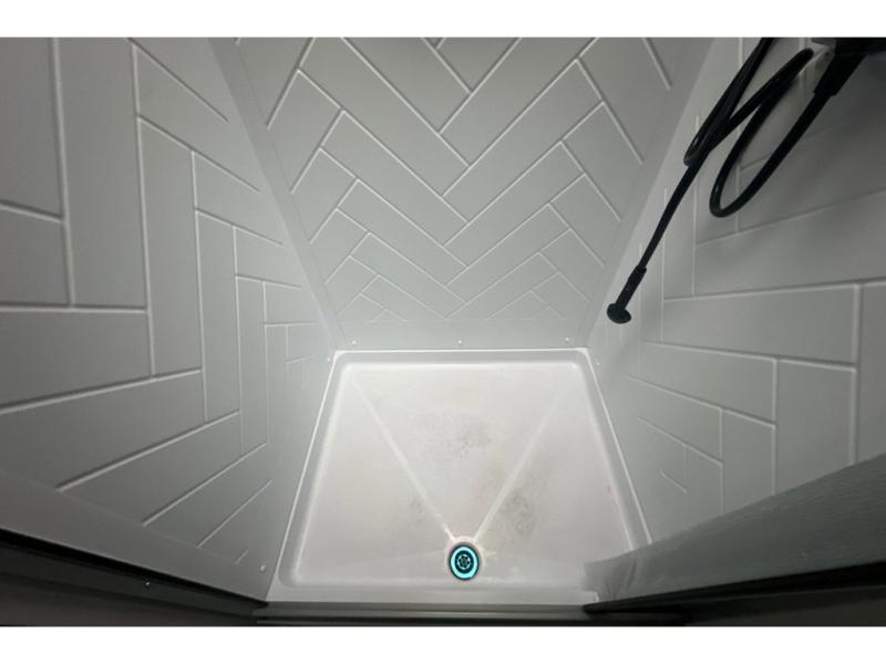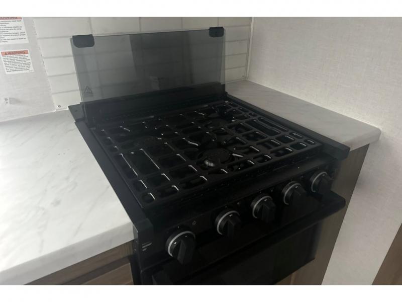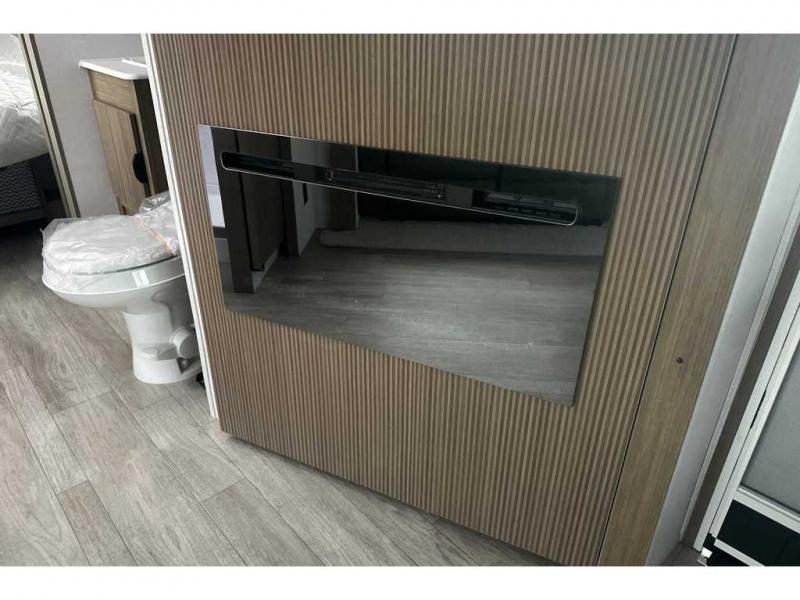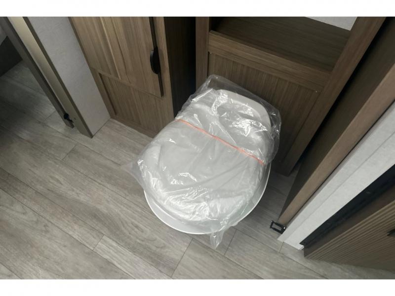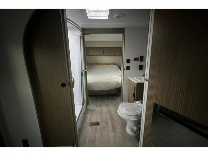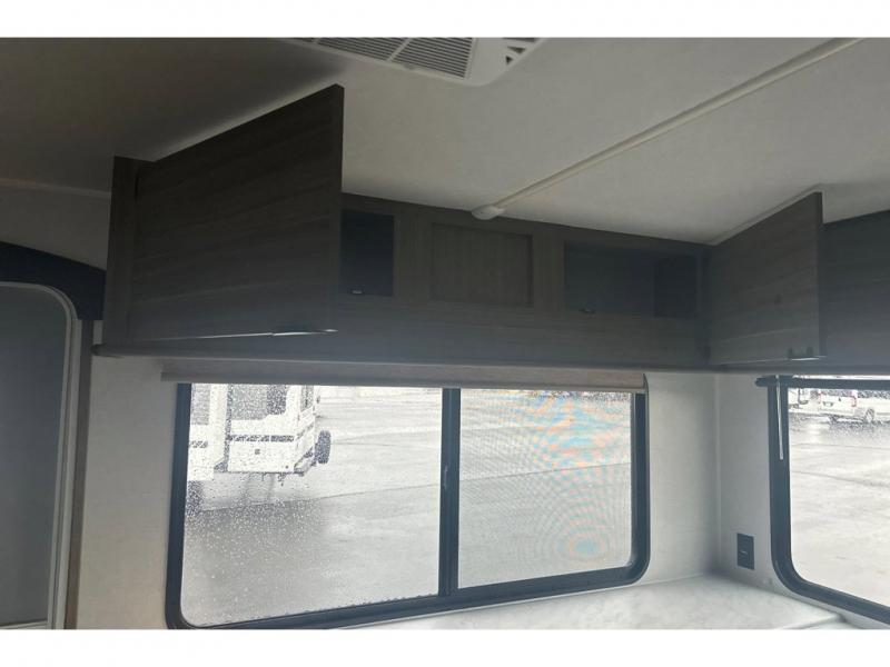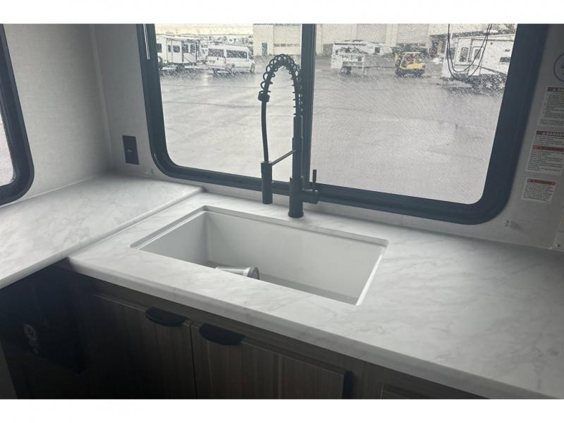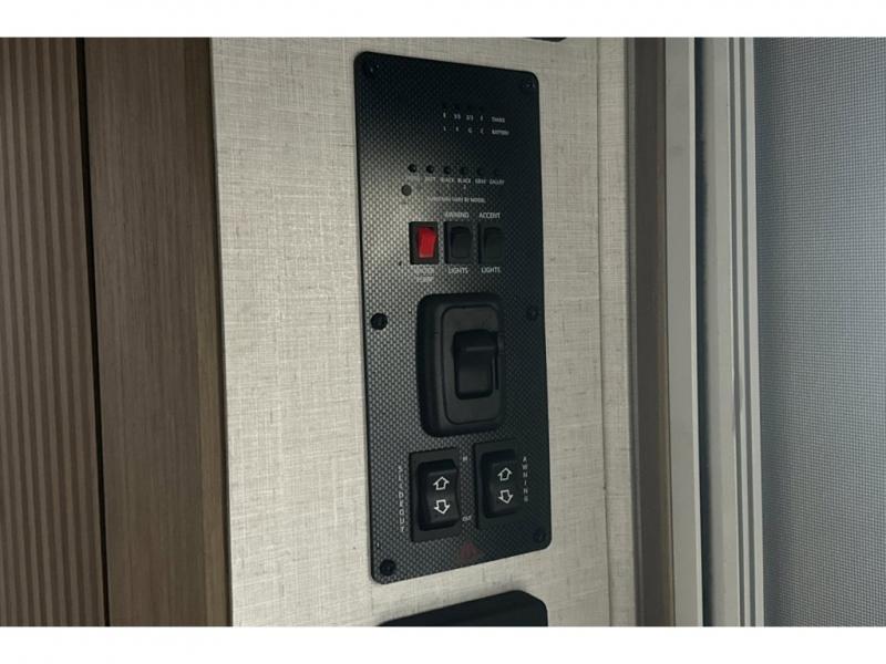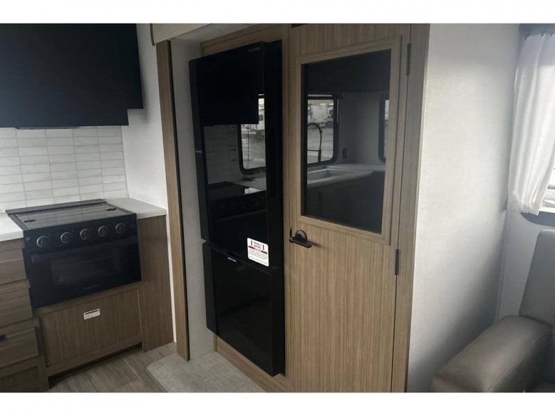 You're going to love cooking in the rear kitchen of this travel trailer! It has everything you need to prepare delicious home cooked meals including a large pantry and oversized fridge, plus there are two bar stools to sit on while you enjoy them. The theater seating is conveniently across from the swiveling entertainment center which has hidden shelves behind it for your games and movies. As you walk through the bathroom, you will notice a walk-in shower to the left and a toilet and sink to the right. It leads directly into the front private bedroom which has a Versa-Tilt custom king bed to lay your head on at night and a closet plus overhead storage for your items!