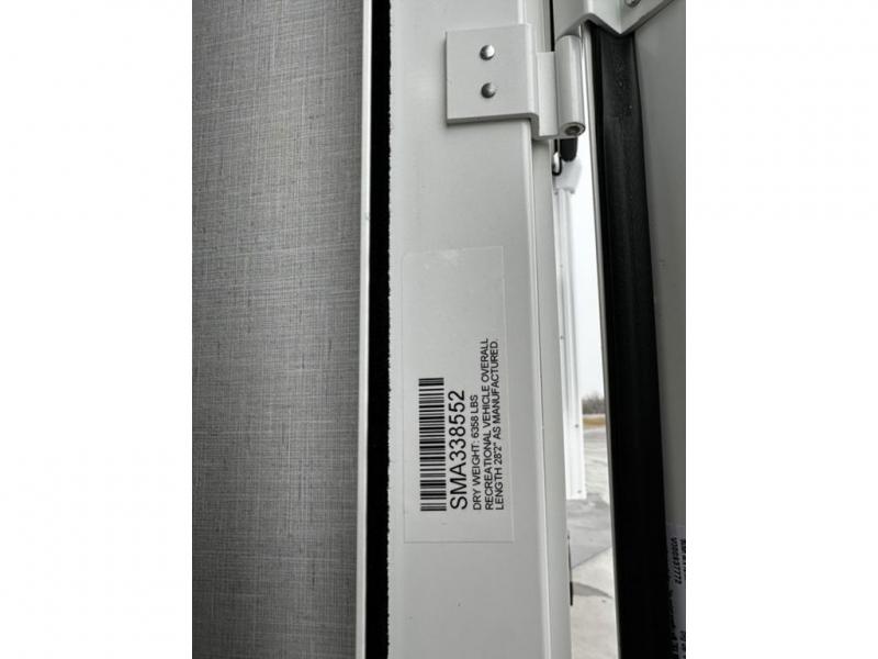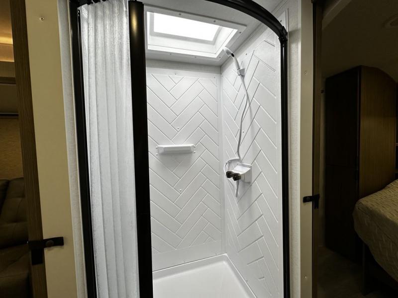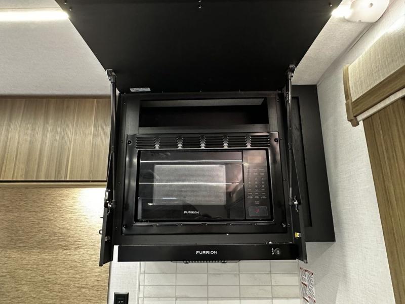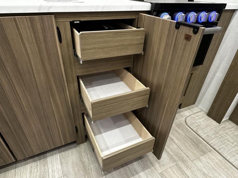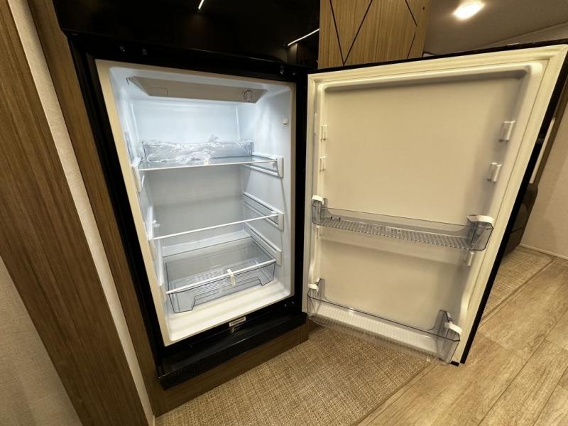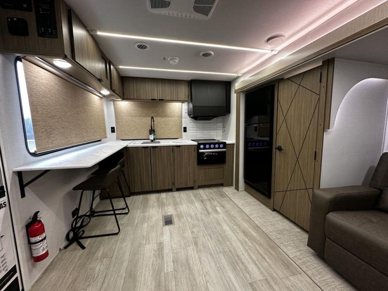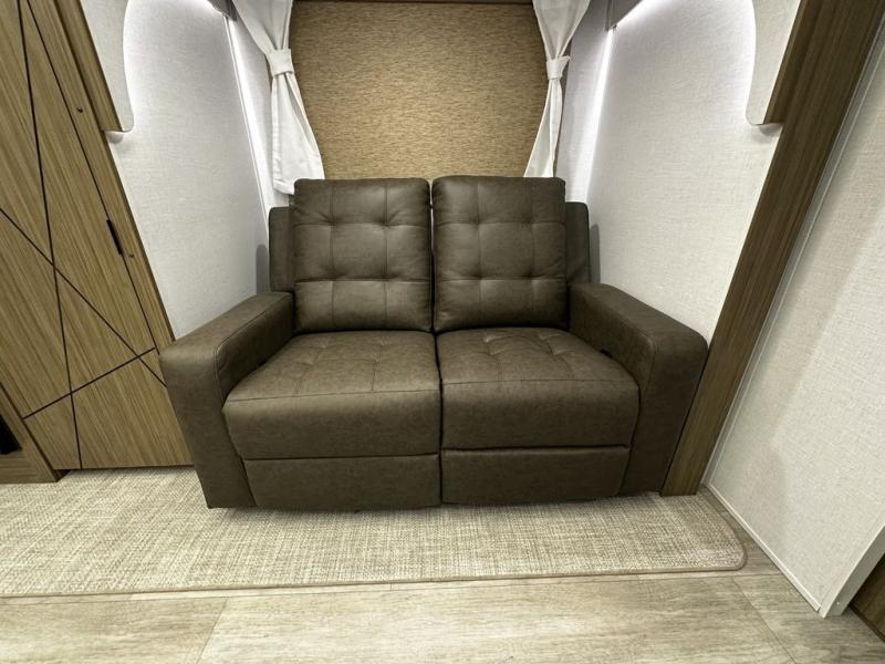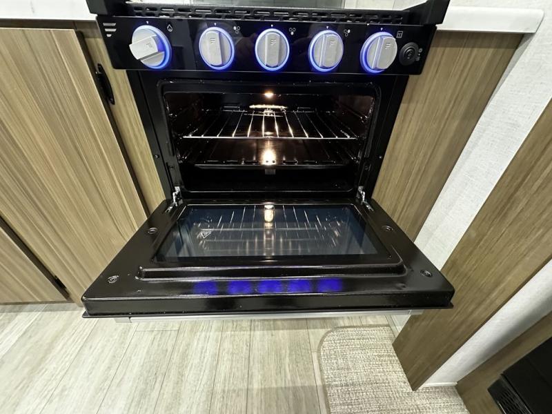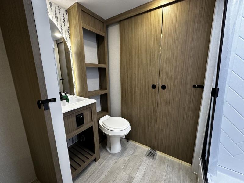 You're going to love cooking in the rear kitchen of this travel trailer! It has everything you need to prepare delicious home cooked meals including a large pantry and oversized fridge, plus there are two bar stools to sit on while you enjoy them. The theater seating is conveniently across from the swiveling entertainment center which has hidden shelves behind it for your games and movies. As you walk through the bathroom, you will notice a walk-in shower to the left and a toilet and sink to the right. It leads directly into the front private bedroom which has a Versa-Tilt custom king bed to lay your head on at night and a closet plus overhead storage for your items!