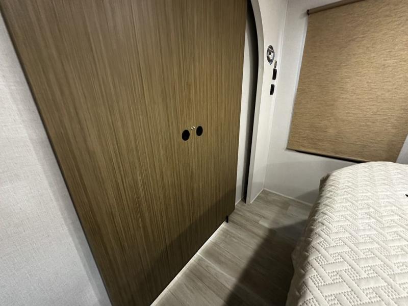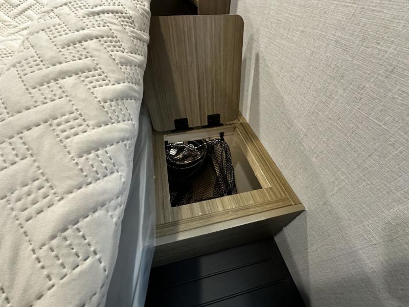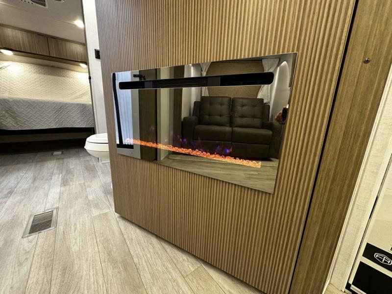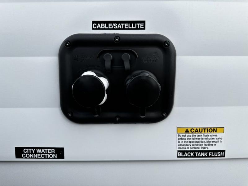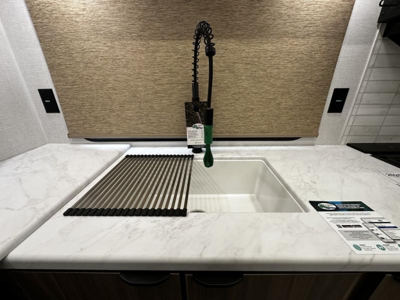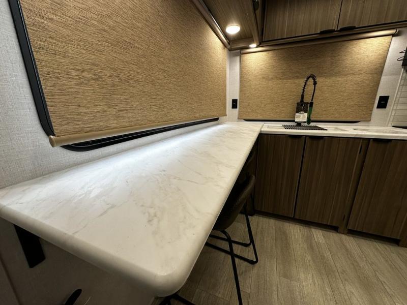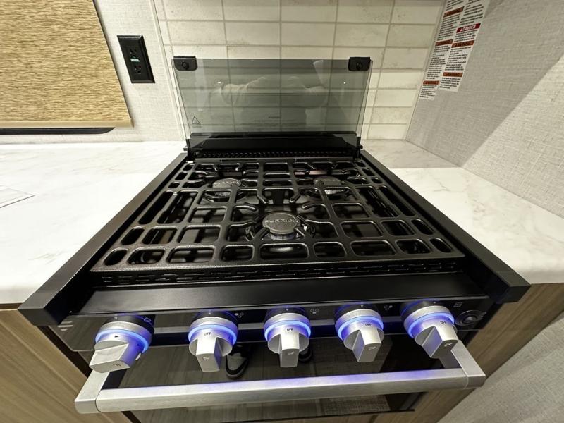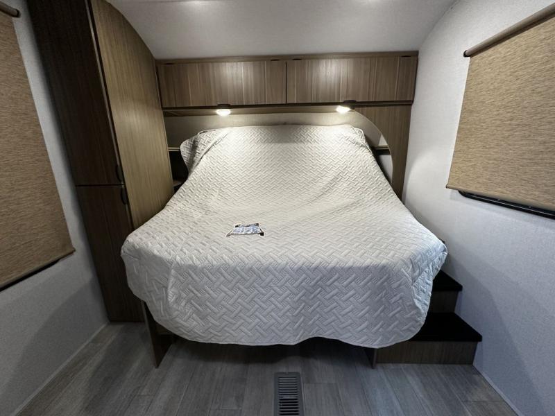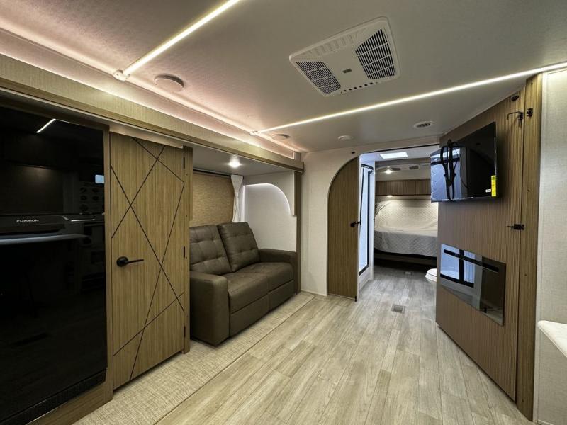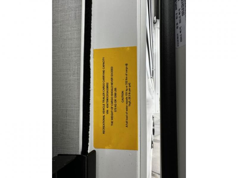 You're going to love cooking in the rear kitchen of this travel trailer! It has everything you need to prepare delicious home cooked meals including a large pantry and oversized fridge, plus there are two bar stools to sit on while you enjoy them. The theater seating is conveniently across from the swiveling entertainment center which has hidden shelves behind it for your games and movies. As you walk through the bathroom, you will notice a walk-in shower to the left and a toilet and sink to the right. It leads directly into the front private bedroom which has a Versa-Tilt custom king bed to lay your head on at night and a closet plus overhead storage for your items!