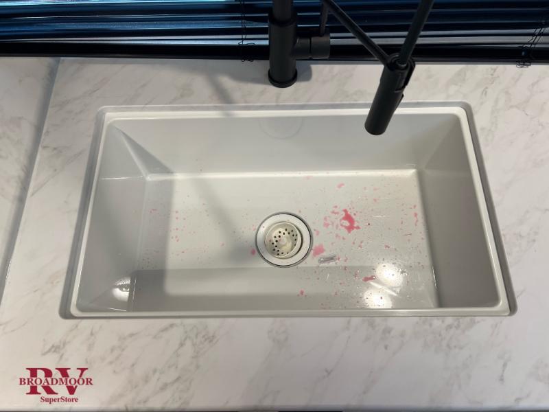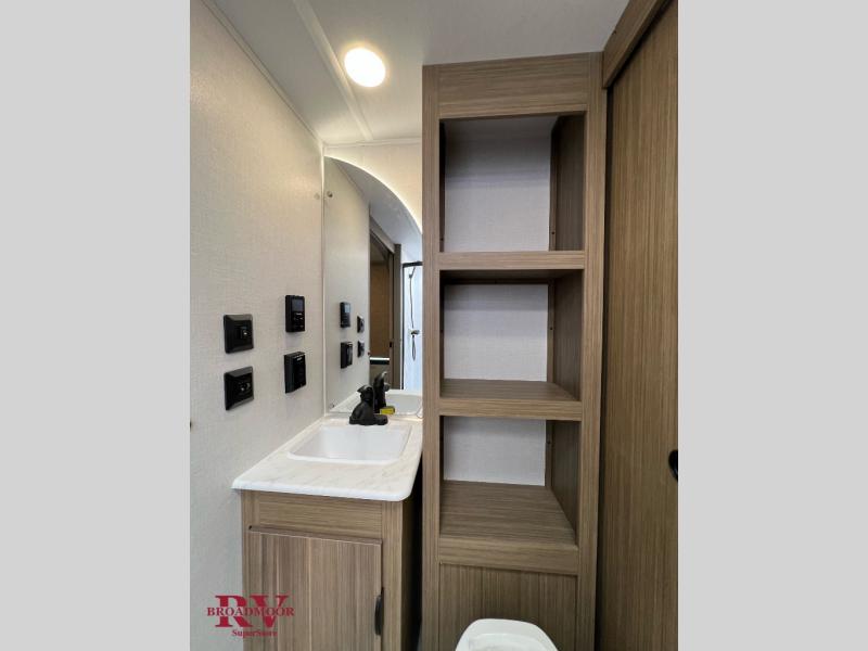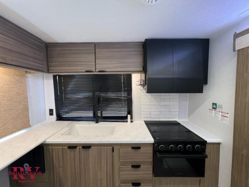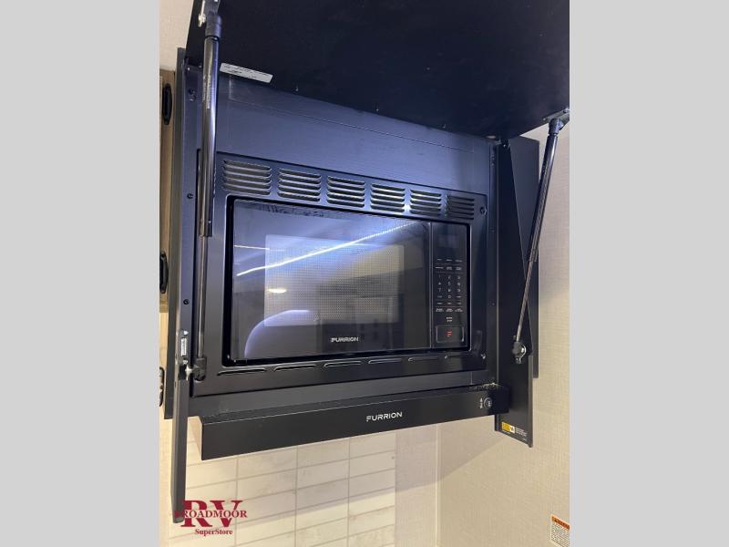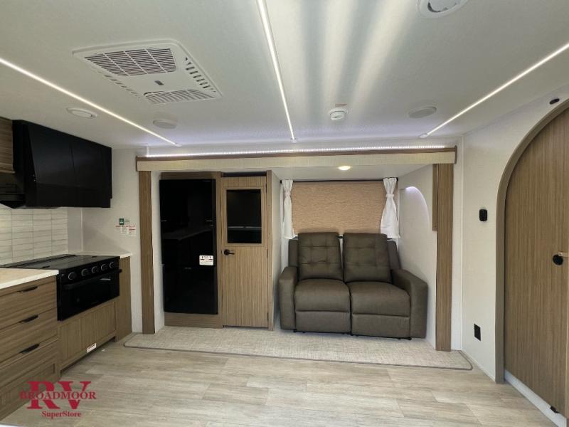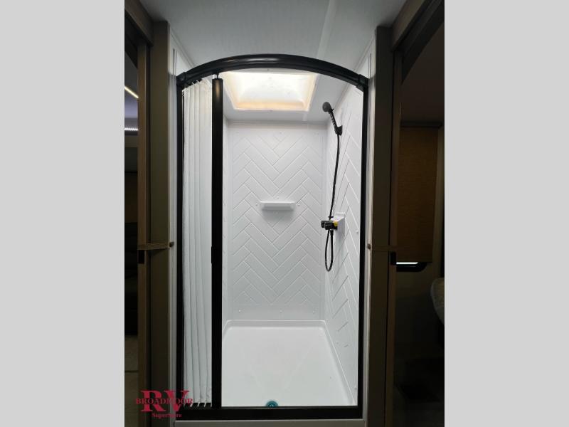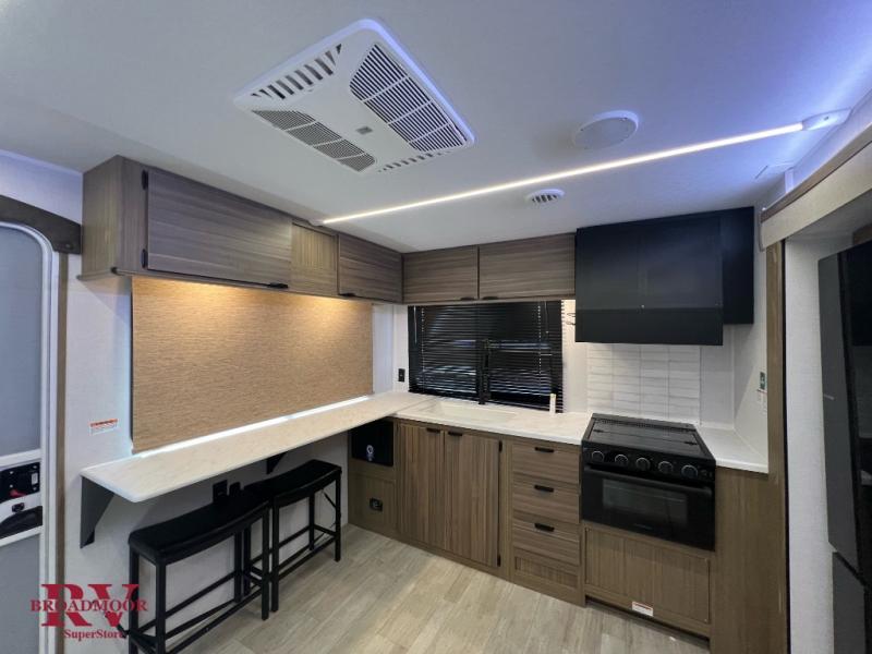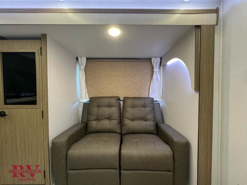 You're going to love cooking in the rear kitchen of this travel trailer! It has everything you need to prepare delicious home cooked meals including a large pantry and oversized fridge, plus there are two bar stools to sit on while you enjoy them. The theater seating is conveniently across from the swiveling entertainment center which has hidden shelves behind it for your games and movies. As you walk through the bathroom, you will notice a walk-in shower to the left and a toilet and sink to the right. It leads directly into the front private bedroom which has a Versa-Tilt custom king bed to lay your head on at night and a closet plus overhead storage for your items!