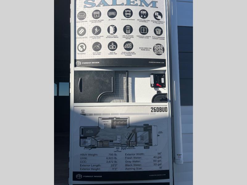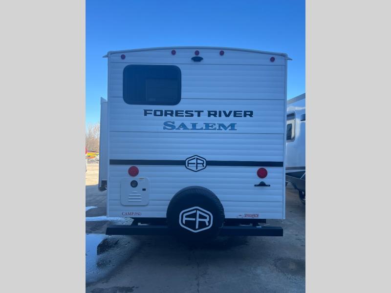 Enjoy years and years of memories with any one of these Forest River Salem travel trailers! They are built with a Dicor PVC roof membrane, a powder coated I-beam frame, and an aerodynamic front radius profile for an easier tow. The triple seal slide out system prevents water from seeping inside and keeps it outside where it belongs. The Best In Class Value Package includes upgraded designer furniture, seamless countertops with no T-mold, and two zone residential soundbars with FM, Bluetooth, HDMI and USB. You will also appreciate the heated and enclosed Accessi-Belly with removable underbelly panels, the power tongue jack with an LED light, and the designated CPAP storage. Some new upgraded features include: a Versa-Tilt bed, a 60K tankless water heater, upgraded showerhead, and so much more!