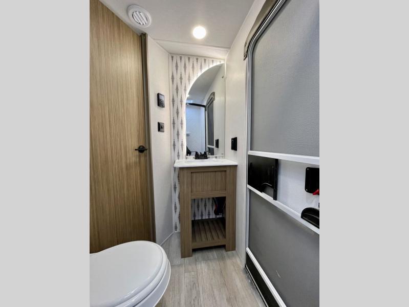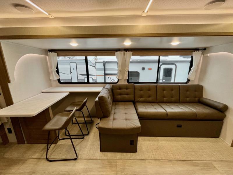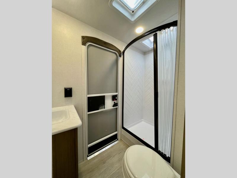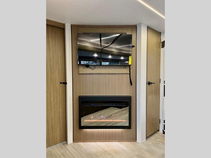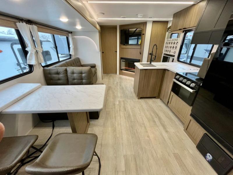 As you get away for the weekend to enjoy nature's beauty, you'll be so glad that you chose to bring this Salem travel trailer along! The full kitchen with its cooktop, microwave and walk-in pantry will allow you to prep meals whenever it is convenient for you, and the large slide that contains the functional Versa Flex table with chairs provides a place to dine or work. There is also an L-shaped sofa to relax on across from the fireplace! Your kids will be able to invite a friend or two because of the double-size bunks that are in the back, and since these bunks are right next to the full bathroom with a walk-in shower, your kids won't have to search far in the middle of the night.