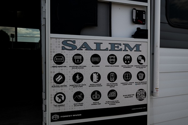 The Salem travel trailers are packed with hassle-free camping amenities! There are a variety of floorplans to choose from between three different regions. The heated and enclosed Accessibelly will help protect against the elements and debris during transport, and the exterior retro/metal redesign is sure to be eye-catching! There are stylish roller shades inside, along with updated backsplash, elegant curtain rods and curtains, plus many more interior comforts! Choose a Salem travel trailer today for quality and value!