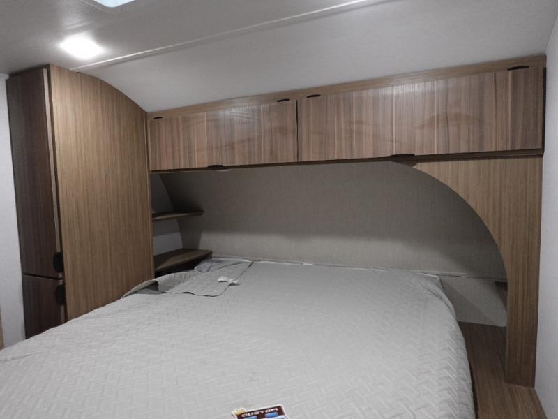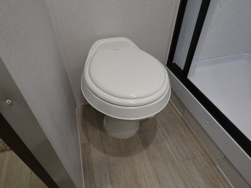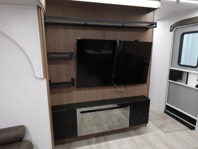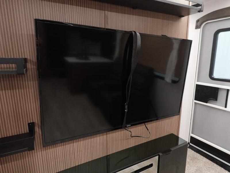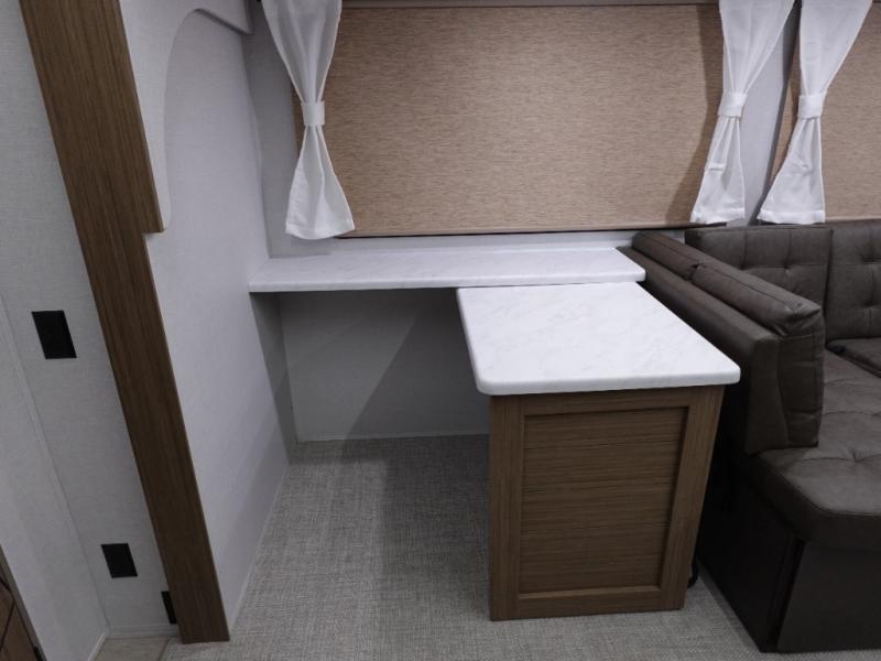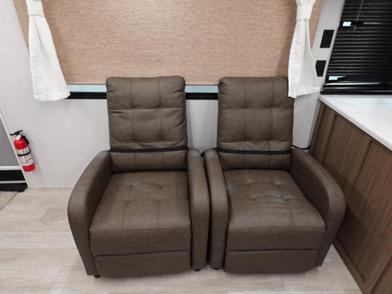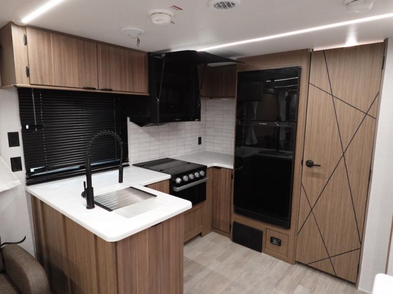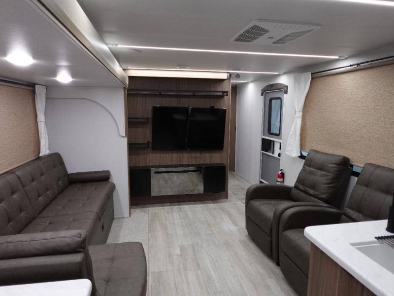 With a spacious kitchen and panoramic windows, this travel trailer is sure to stand out! The L-shaped sofa, dual lounge chairs, and Versa Flex table give you many seating options. You can either cook a delicious meal in the rear kitchen or you can use the exterior camp kitchen to breathe in some fresh air while you cook. After a fun-filled day, you can rinse off in the walk-in shower then head to the front private bedroom, grab your pajamas from the closet, and lay down on the custom king bed with Versa Tilt for a good night's rest!