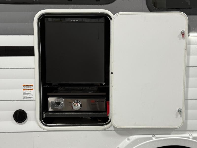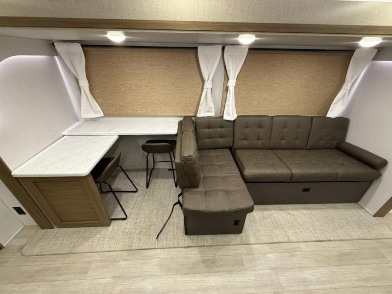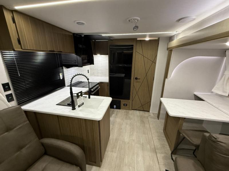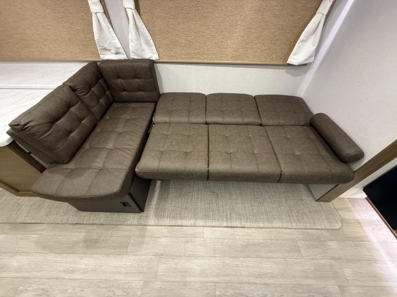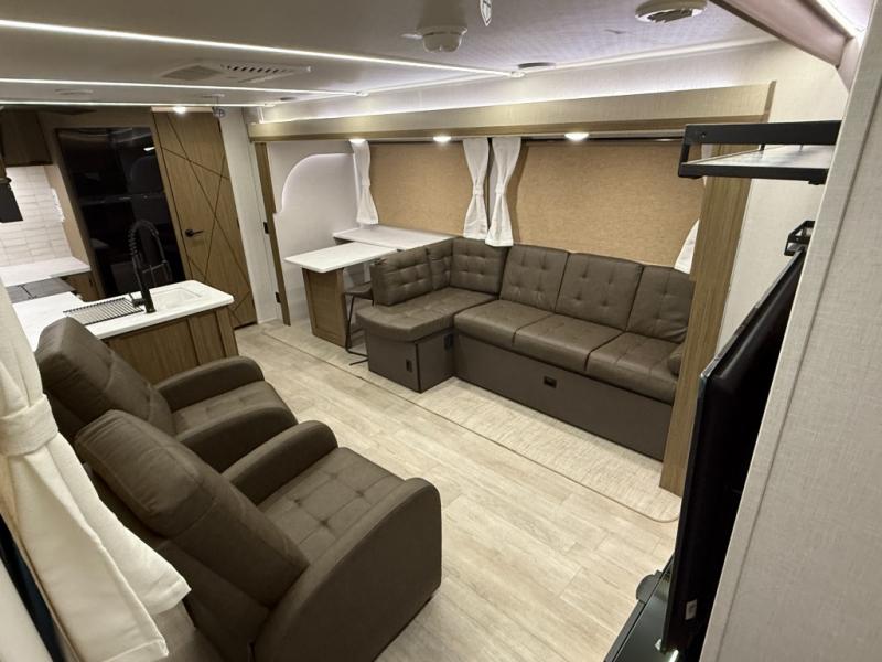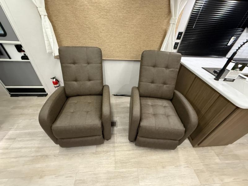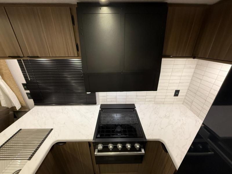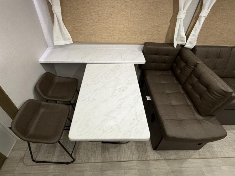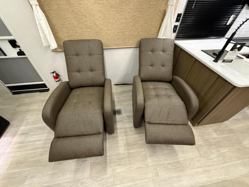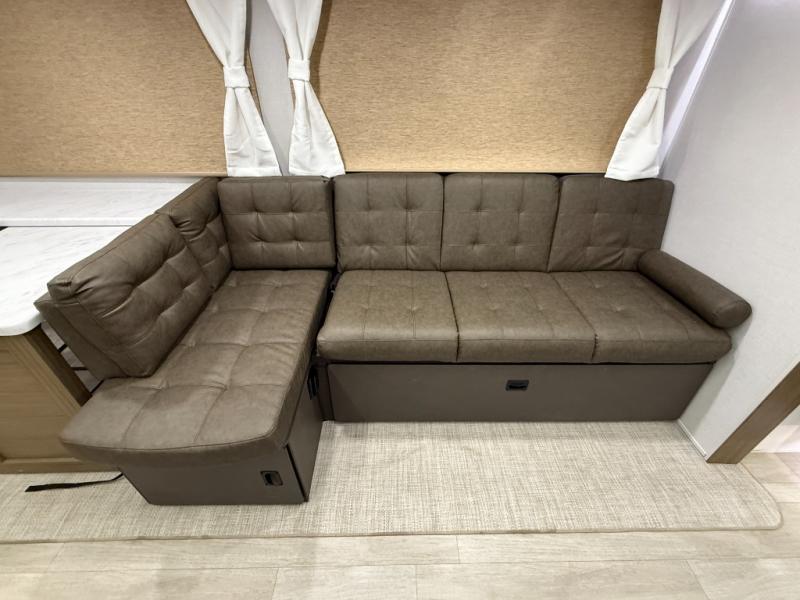 With a spacious kitchen and panoramic windows, this travel trailer is sure to stand out! The L-shaped sofa, dual lounge chairs, and Versa Flex table give you many seating options. You can either cook a delicious meal in the rear kitchen or you can use the exterior camp kitchen to breathe in some fresh air while you cook. After a fun-filled day, you can rinse off in the walk-in shower then head to the front private bedroom, grab your pajamas from the closet, and lay down on the custom king bed with Versa Tilt for a good night's rest!