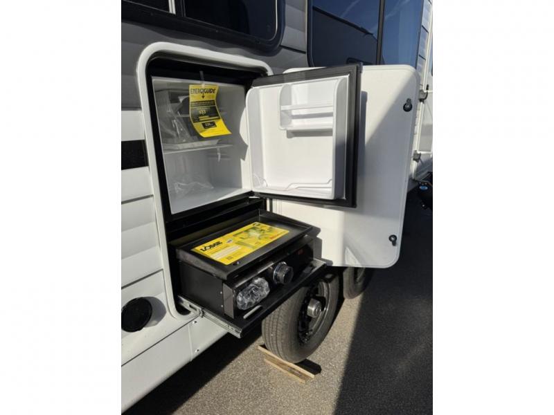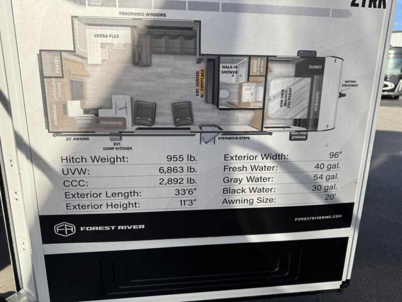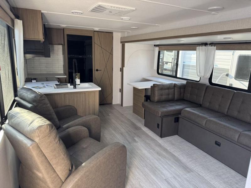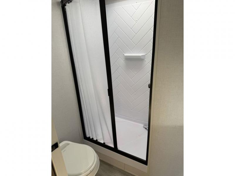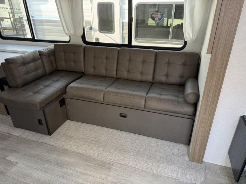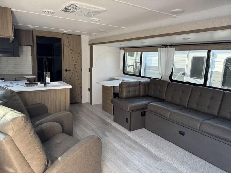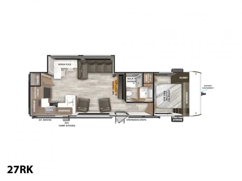 With a spacious kitchen and panoramic windows, this travel trailer is sure to stand out! The L-shaped sofa, dual lounge chairs, and Versa Flex table give you many seating options. You can either cook a delicious meal in the rear kitchen or you can use the exterior camp kitchen to breathe in some fresh air while you cook. After a fun-filled day, you can rinse off in the walk-in shower then head to the front private bedroom, grab your pajamas from the closet, and lay down on the custom king bed with Versa Tilt for a good night's rest!