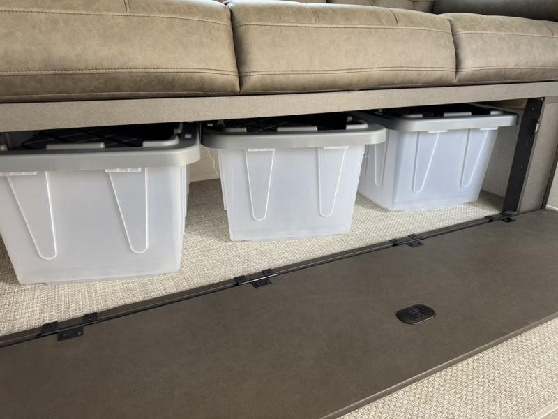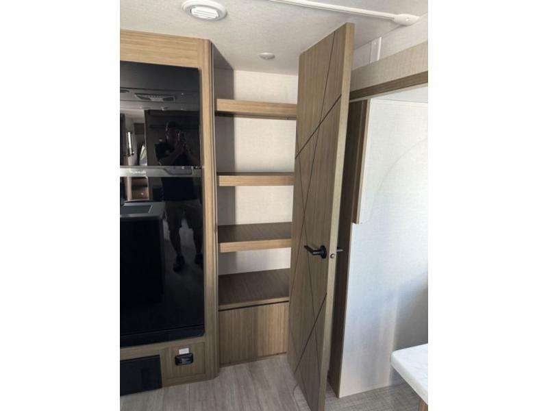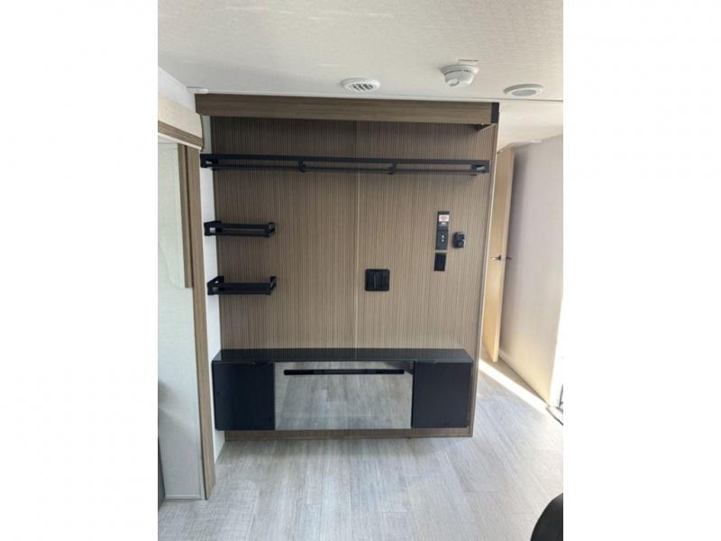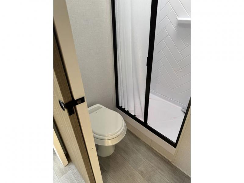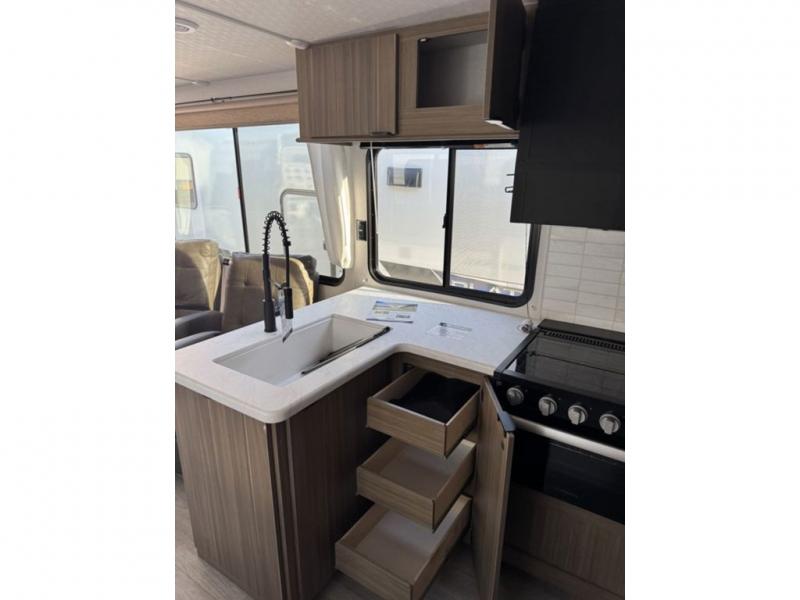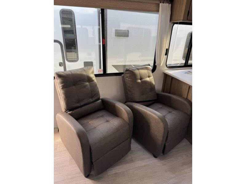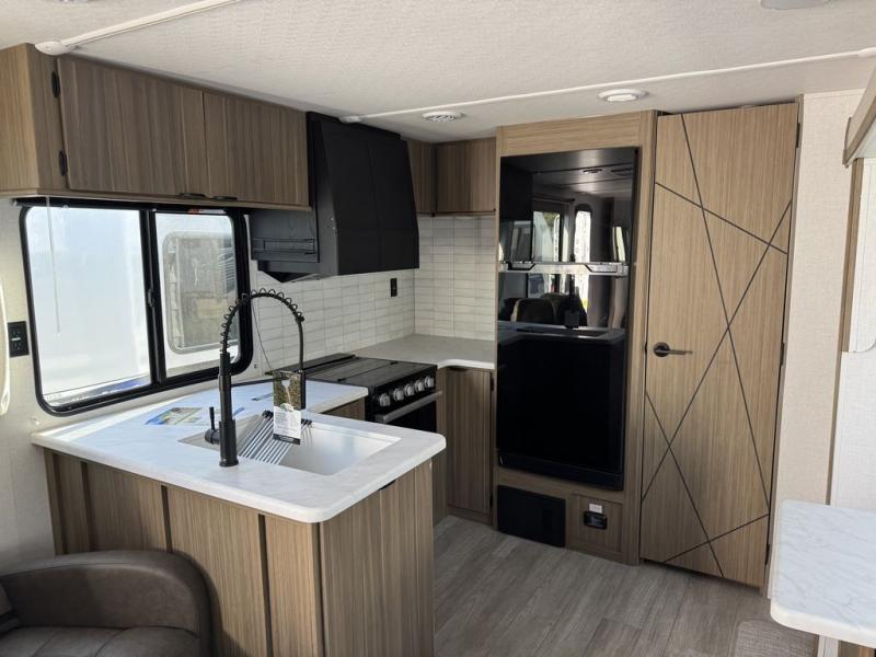 With a spacious kitchen and panoramic windows, this travel trailer is sure to stand out! The L-shaped sofa, dual lounge chairs, and Versa Flex table give you many seating options. You can either cook a delicious meal in the rear kitchen or you can use the exterior camp kitchen to breathe in some fresh air while you cook. After a fun-filled day, you can rinse off in the walk-in shower then head to the front private bedroom, grab your pajamas from the closet, and lay down on the custom king bed with Versa Tilt for a good night's rest!