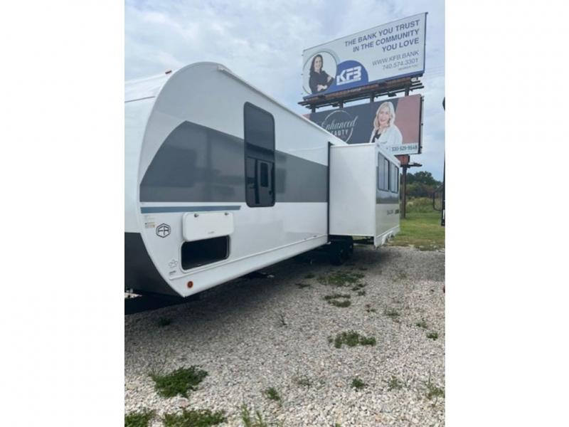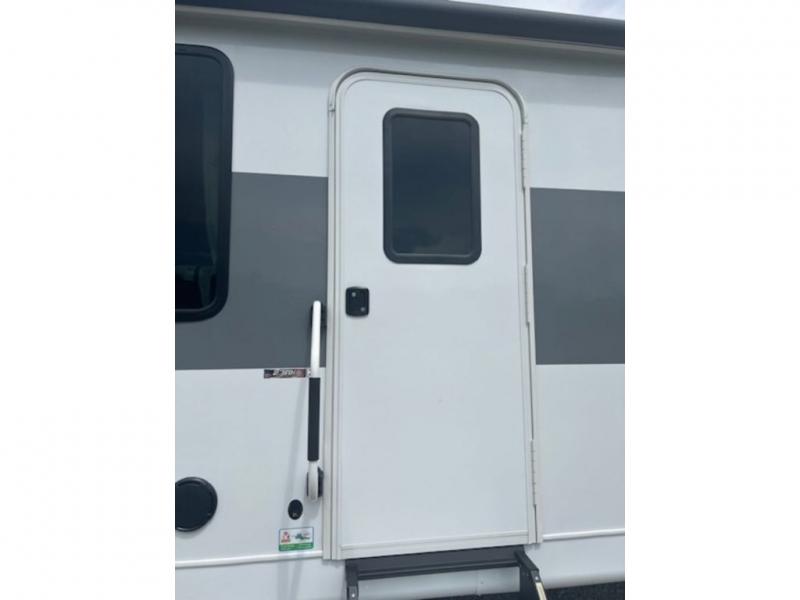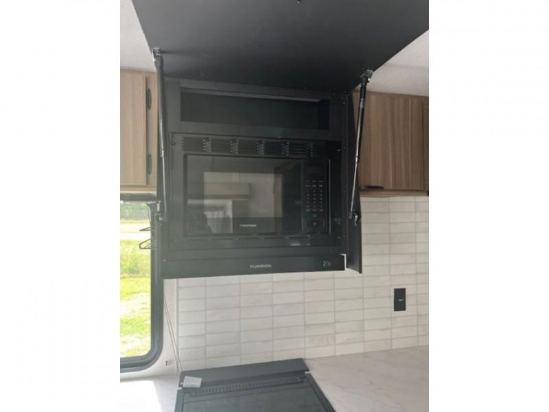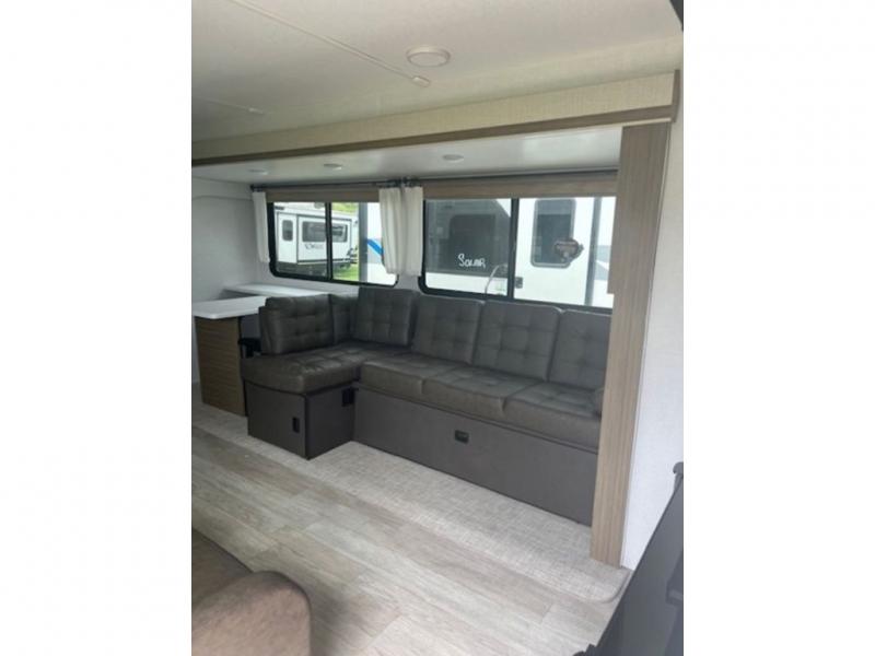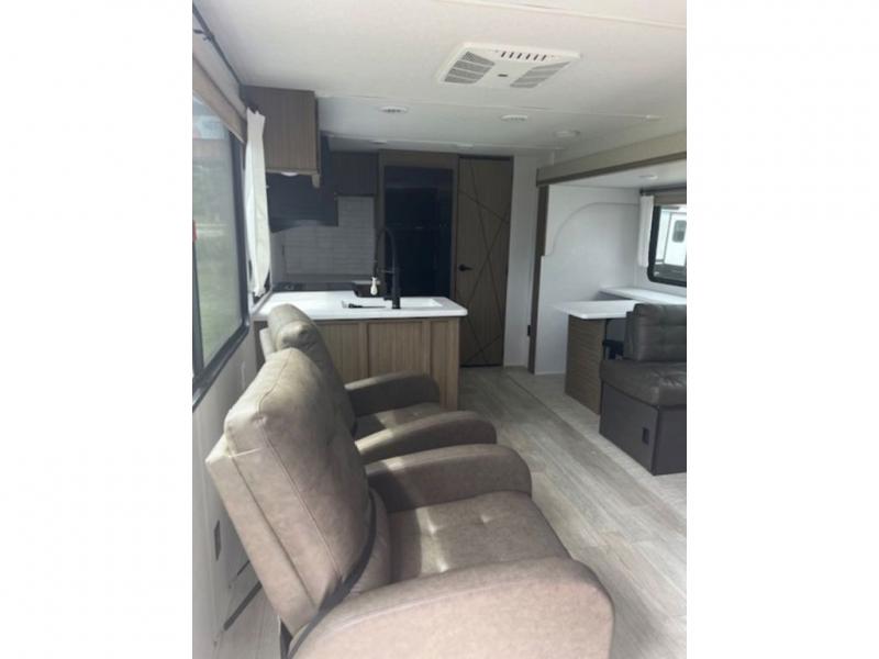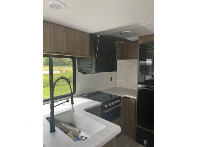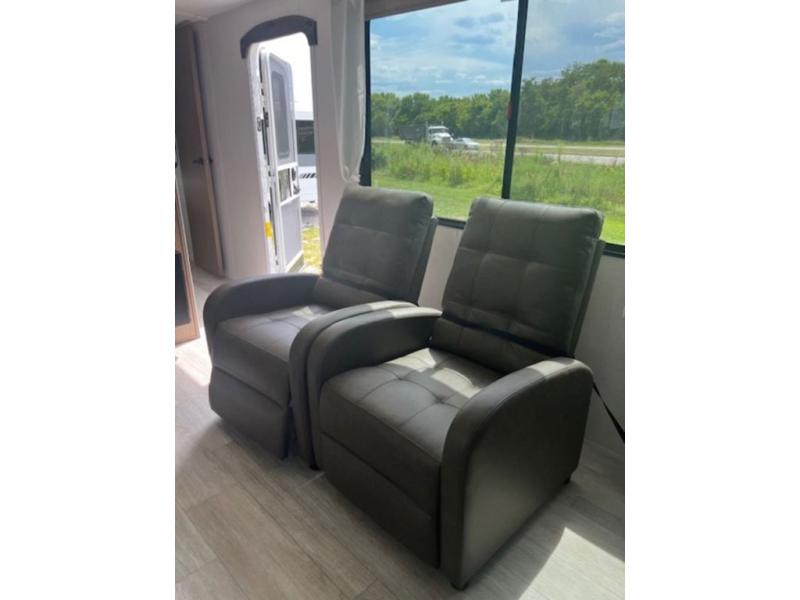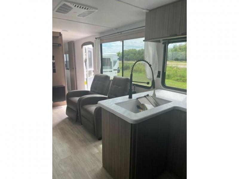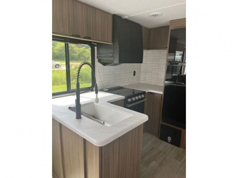 With a spacious kitchen and panoramic windows, this travel trailer is sure to stand out! The L-shaped sofa, dual lounge chairs, and Versa Flex table give you many seating options. You can either cook a delicious meal in the rear kitchen or you can use the exterior camp kitchen to breathe in some fresh air while you cook outdoors. After a fun-filled day, you can rinse off in the walk-in shower then head to the front private bedroom where you will find a Versa-Tilt custom king bed for a good night's rest!