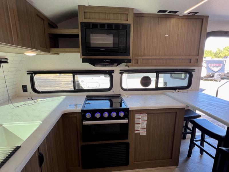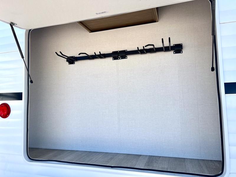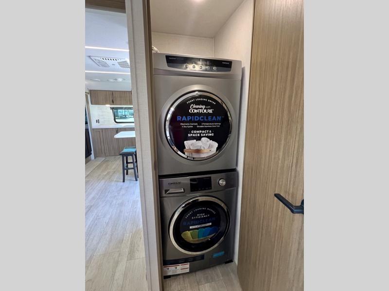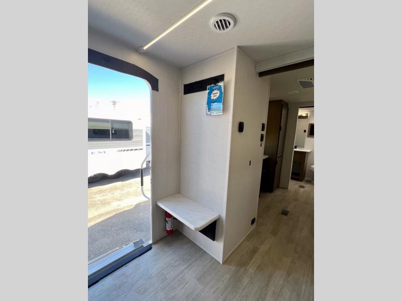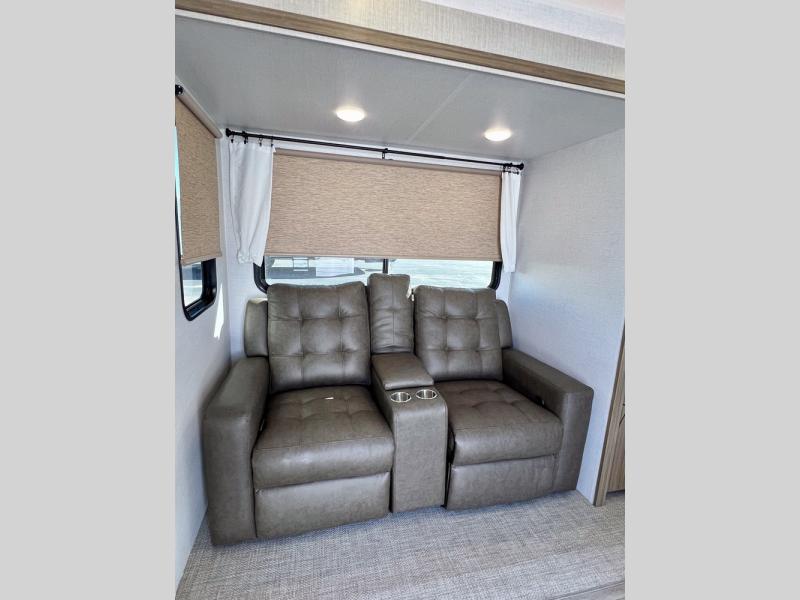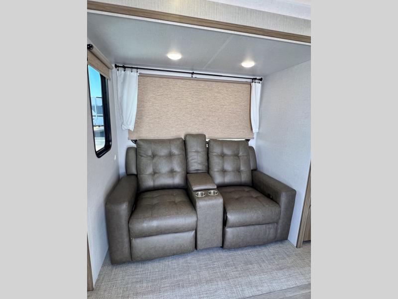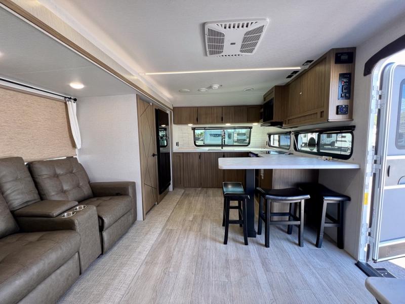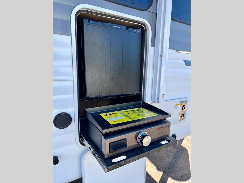 You will fall in love with this travel trailer as soon as you walk through the door! One of the dual entry doors leads directly into the front kitchen and living area which has theater seating, four bar stools to enjoy meals at the countertop, plus a bench right at the entrance to make putting your shoes on easier. Inside the master suite is a Versa-Tilt custom king bed slide across from a dresser with TV prep, an area with washer and dryer prep option, and access to the full rear bathroom. You will find a walk-in shower to freshen up in each morning, recessed storage, and the second entrance/exit door to the unit. You even have an exterior camp kitchen to prepare meals outdoors, a 20' awning to protect you rain or shine and a Versa garage for your items!
