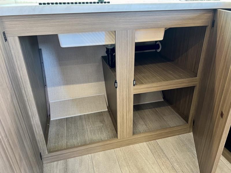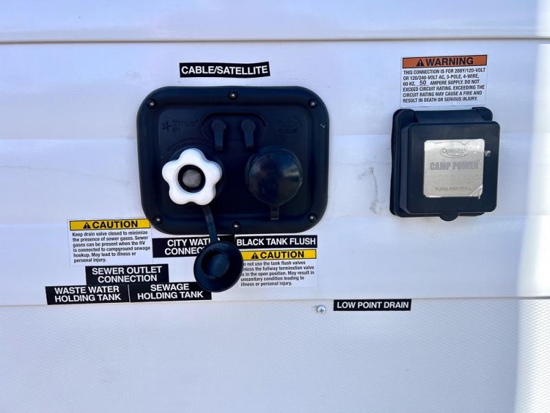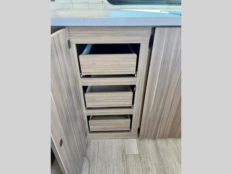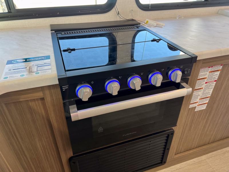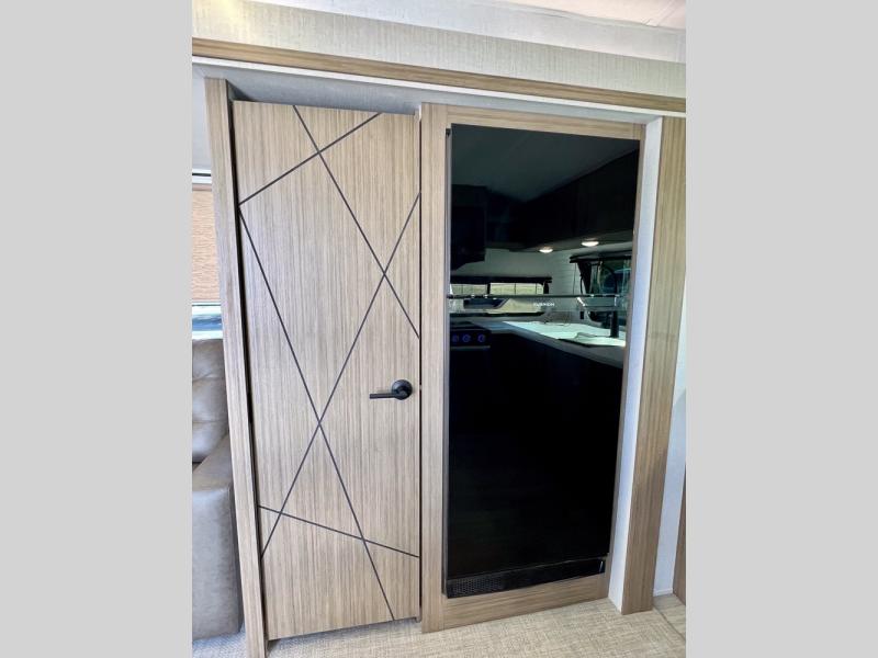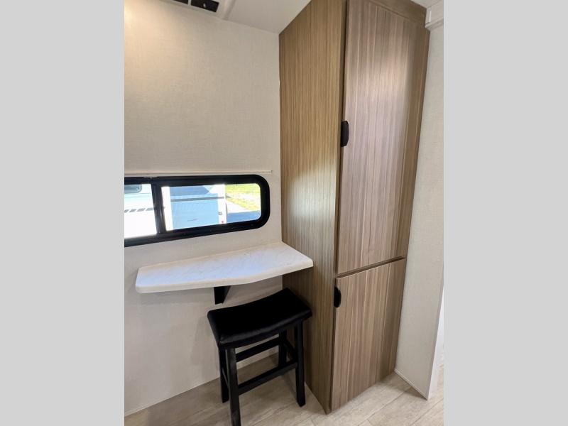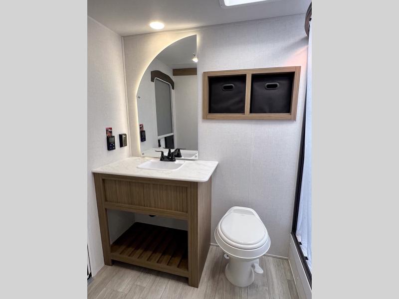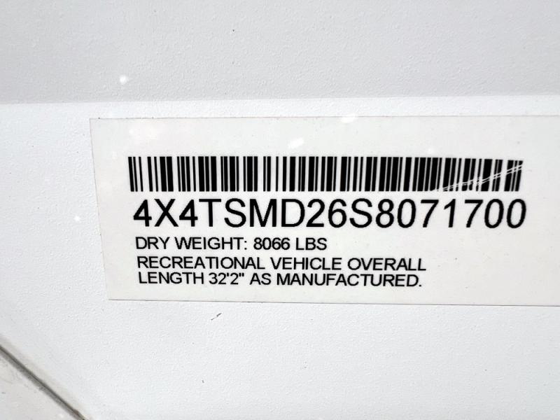 You will fall in love with this travel trailer as soon as you walk through the door! One of the dual entry doors leads directly into the front kitchen and living area which has theater seating, four bar stools to enjoy meals at the countertop, plus a bench right at the entrance to make putting your shoes on easier. Inside the master suite is a Versa-Tilt custom king bed slide across from a dresser with TV prep, an area with washer and dryer prep option, and access to the full rear bathroom. You will find a walk-in shower to freshen up in each morning, recessed storage, and the second entrance/exit door to the unit. You even have an exterior camp kitchen to prepare meals outdoors, a 20' awning to protect you rain or shine and a Versa garage for your items!