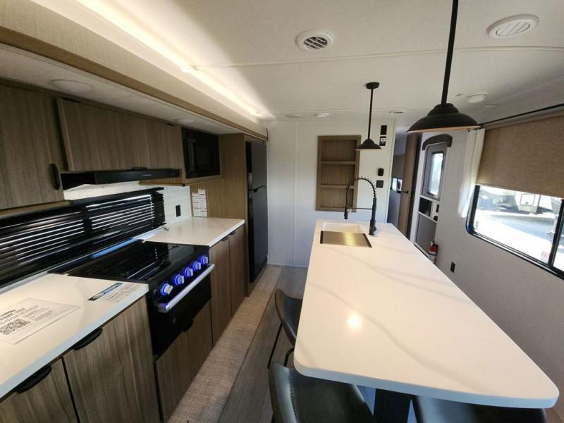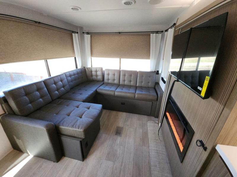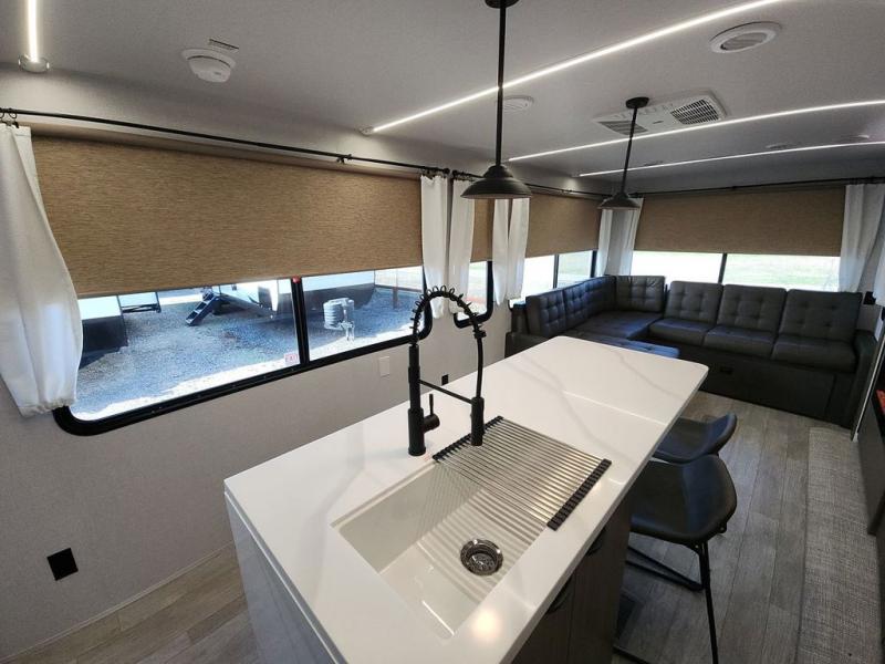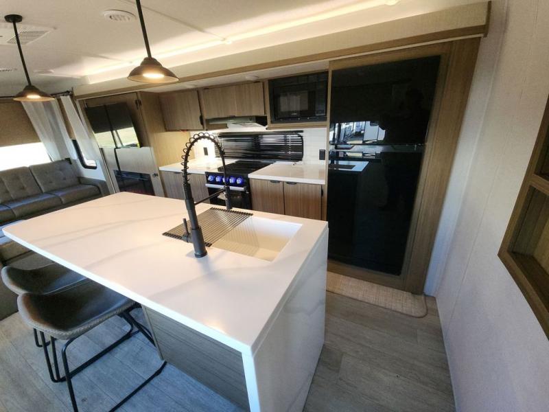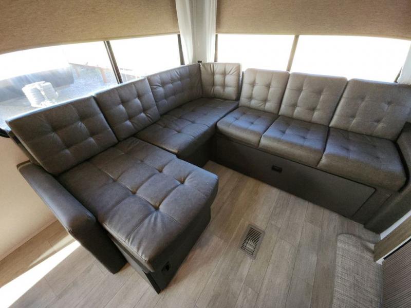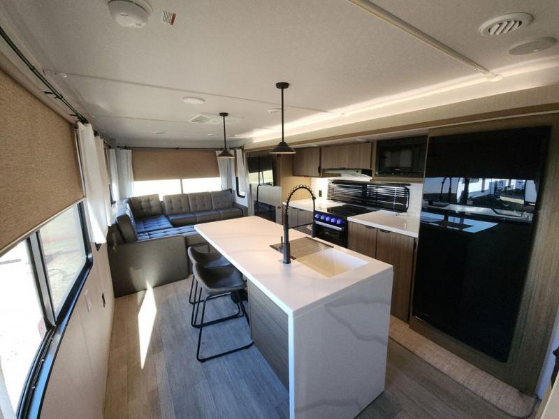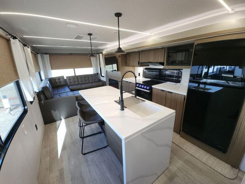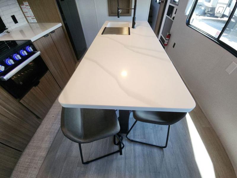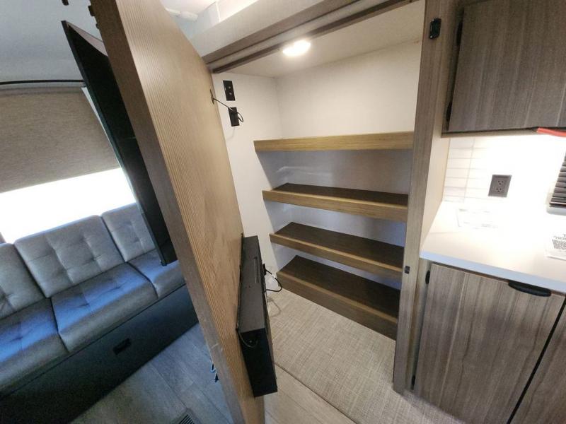 The perfect couple's coach with a view! This Salem View features a kitchen island and four bar stools for dining and prep space. A sectional sofa across the back of the unit provides ample seating to relax and enjoy a good book or the entertainment center. Behind the entertainment center, you will find hidden storage space with shelves so everything can be tucked out of sight, and an oversized refrigerator will provide enough space for your perishables while you are on vacation as well. A full bath is conveniently located near the main entry featuring StepAbove entry steps. The bath provides a walk-in shower, vanity with sink, toilet, and linen storage. In the private front bedroom, a Versa-Tilt custom king bed will allow you a relaxing and comfortable night's rest, and once again, a great view out the dual opposing windows. On the outside, an awning offers additional living space protected from the elements, and a spacious pass-through storage compartment will allow you to stow away your camp chairs and outdoor equipment and games easily for transport.