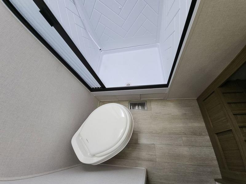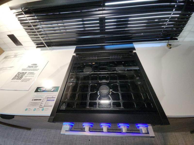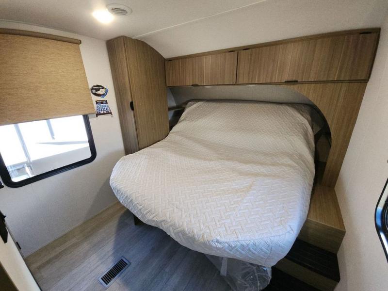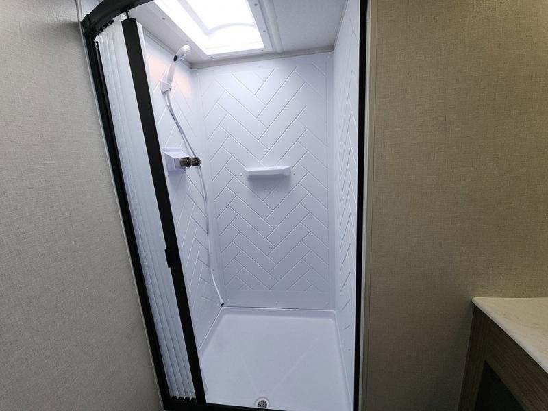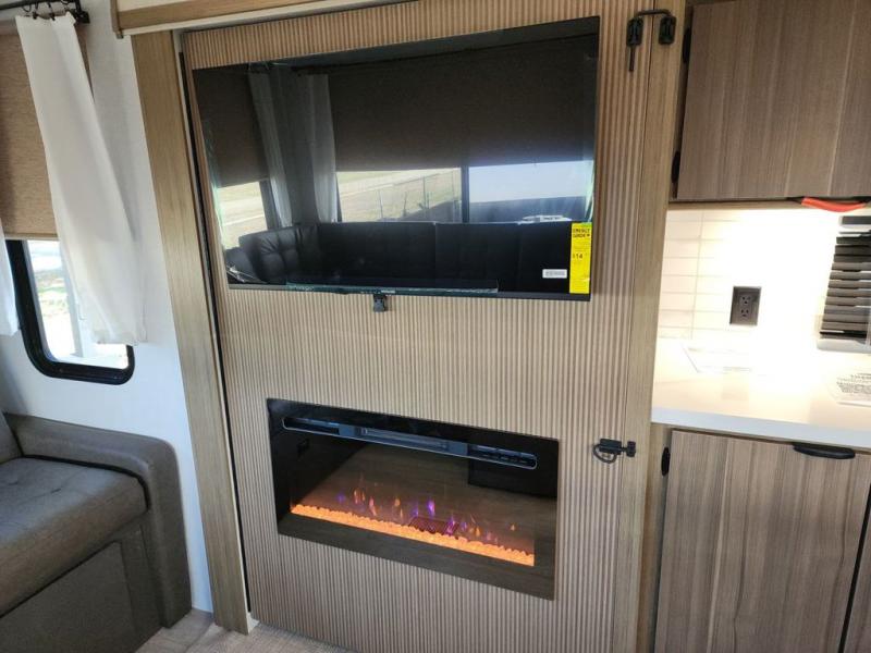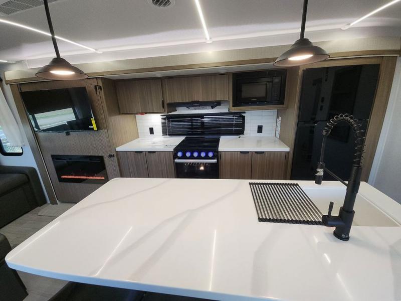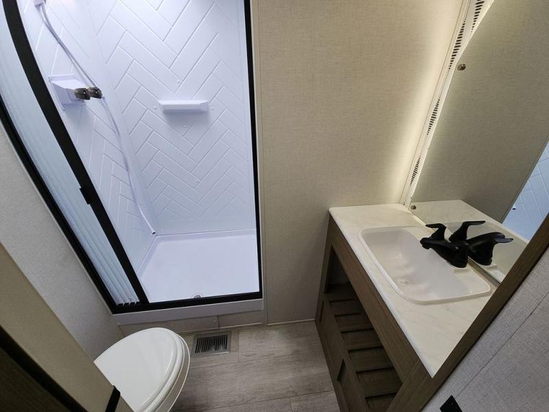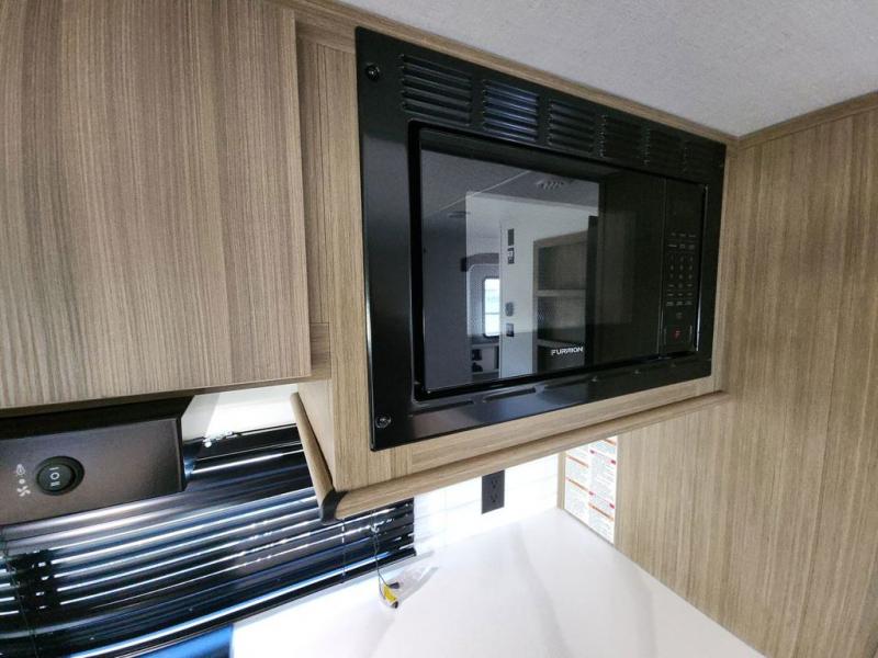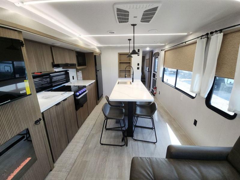 The perfect couple's coach with a view! This Salem View features a kitchen island and four bar stools for dining and prep space. A sectional sofa across the back of the unit provides ample seating to relax and enjoy a good book or the entertainment center. Behind the entertainment center, you will find hidden storage space with shelves so everything can be tucked out of sight, and an oversized refrigerator will provide enough space for your perishables while you are on vacation as well. A full bath is conveniently located near the main entry featuring StepAbove entry steps. The bath provides a walk-in shower, vanity with sink, toilet, and linen storage. In the private front bedroom, a Versa-Tilt custom king bed will allow you a relaxing and comfortable night's rest, and once again, a great view out the dual opposing windows. On the outside, an awning offers additional living space protected from the elements, and a spacious pass-through storage compartment will allow you to stow away your camp chairs and outdoor equipment and games easily for transport.