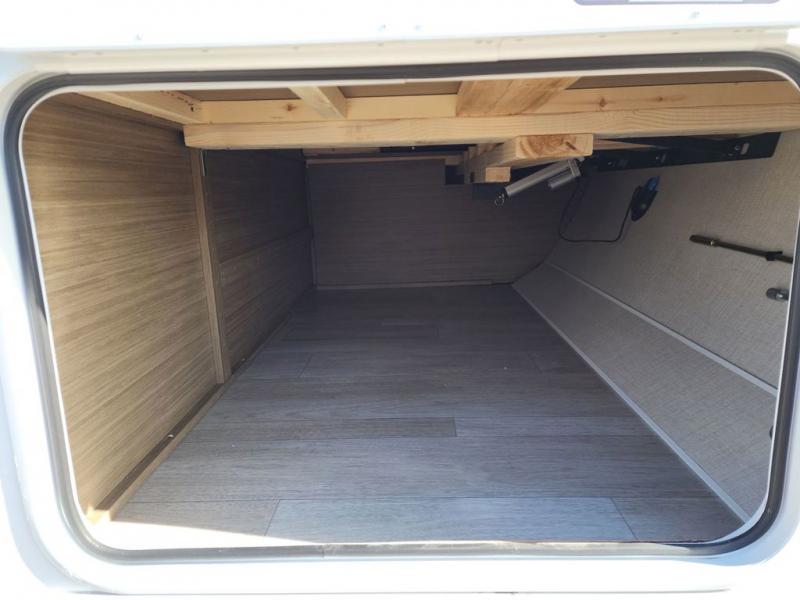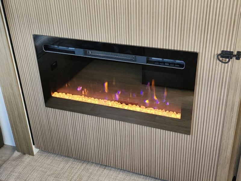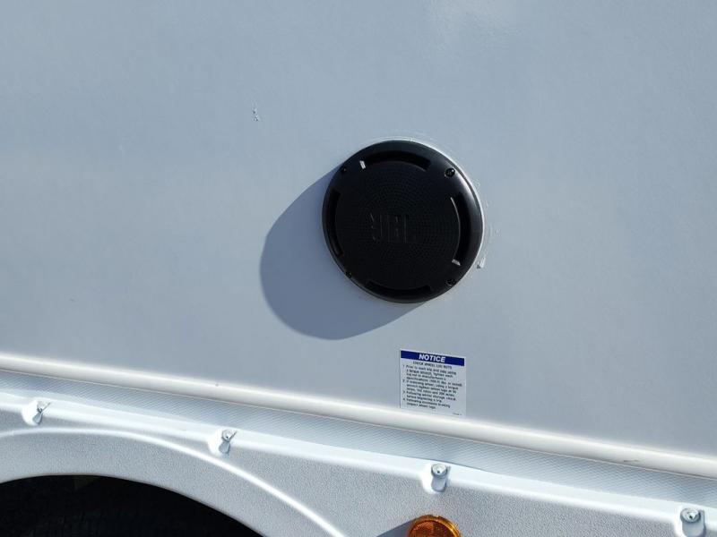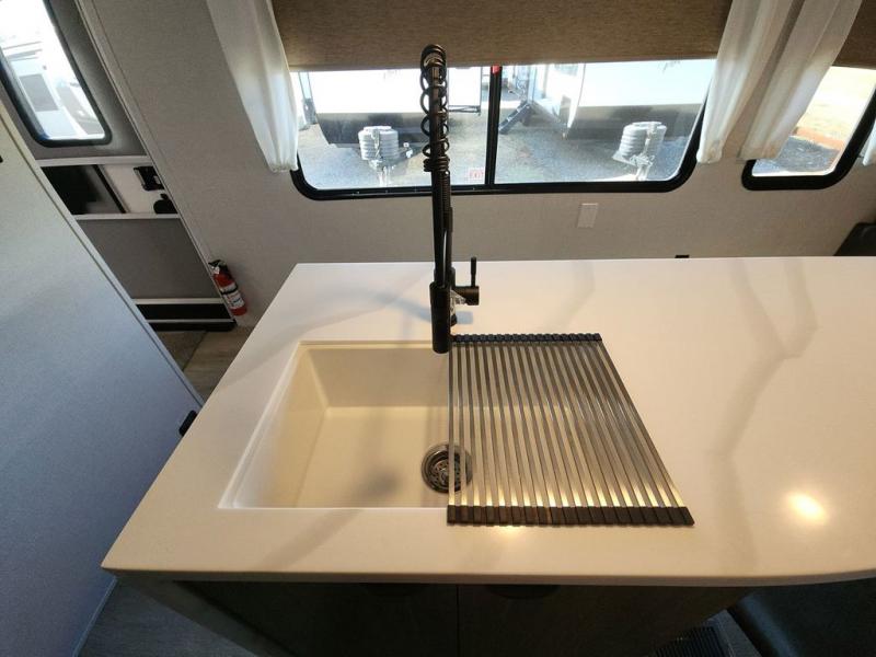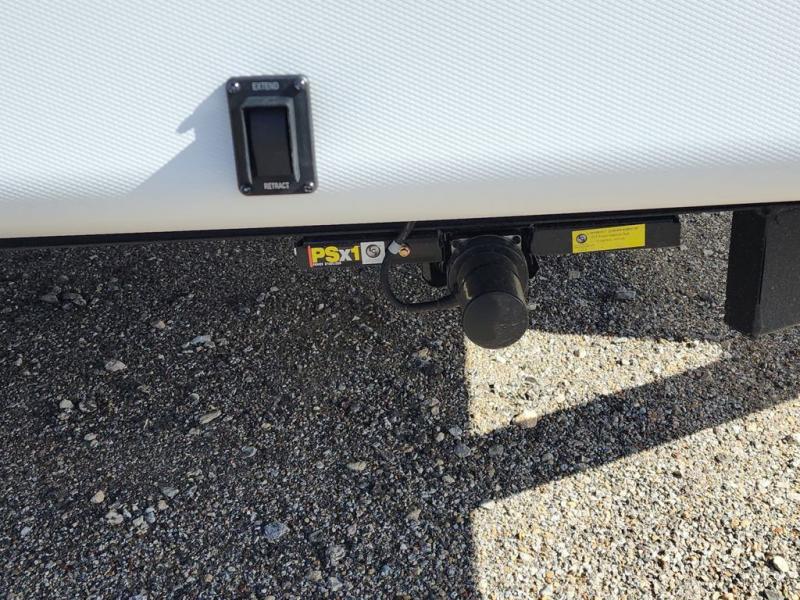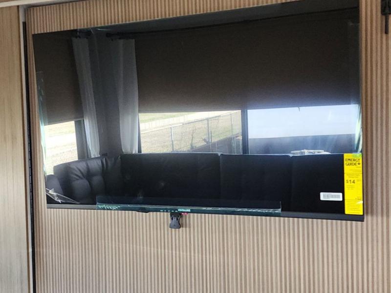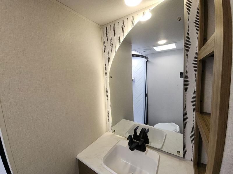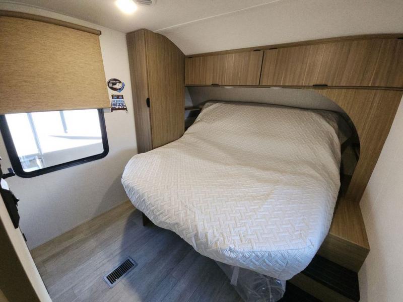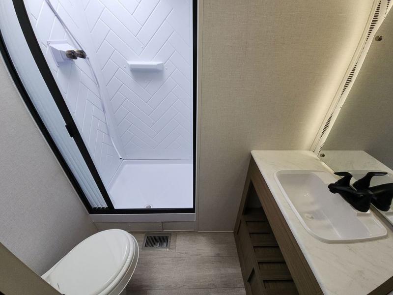The perfect couple's coach with a view! This Salem View features a kitchen island and four bar stools for dining and prep space. A sectional sofa across the back of the unit provides ample seating to relax and enjoy a good book or the entertainment center. Behind the entertainment center, you will find hidden storage space with shelves so everything can be tucked out of sight, and an oversized refrigerator will provide enough space for your perishables while you are on vacation as well. A full bath is conveniently located near the main entry featuring StepAbove entry steps. The bath provides a walk-in shower, vanity with sink, toilet, and linen storage. In the private front bedroom, a Versa-Tilt custom king bed will allow you a relaxing and comfortable night's rest, and once again, a great view out the dual opposing windows. On the outside, an awning offers additional living space protected from the elements, and a spacious pass-through storage compartment will allow you to stow away your camp chairs and outdoor equipment and games easily for transport.