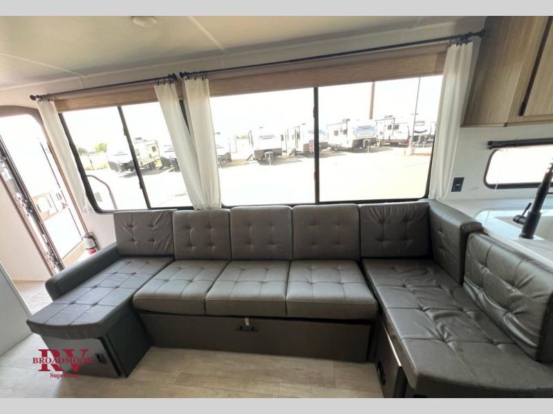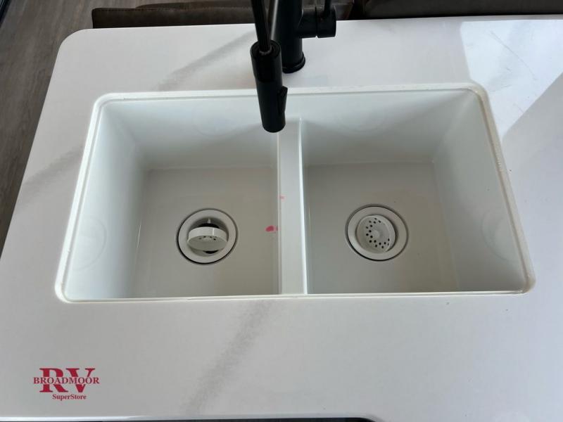 Your family of four will enjoy this Salem View bunk model featuring 105 square feet of window space for unbelievable views of your surroundings. A Versa Slide features a refrigerator, pantry, and entertainment center with a door leading to a bunk space including a set of 30" x 70" bunks with top flip-up bunk, storage cubbies for your things, and a desk with bar stool for any office work that you may need to do while you travel. The rear kitchen area offers 18 linear feet of countertop space with four bar stools, plus a range and double sink. Your refrigerator and pantry will hold all of your perishables and dry goods, and those are nearby within the Versa slide. Up front, a private bedroom with Versa-Tilt custom king bed which provides additional floor space, plus you will find a wardrobe with washer and dryer prep option. A large pass-through storage compartment offers plenty of space for your outdoor gear, and if you enjoy outdoor cooking, you are sure to love the exterior camp kitchen!