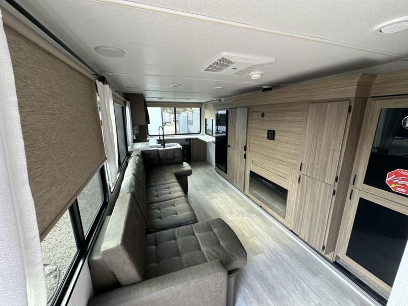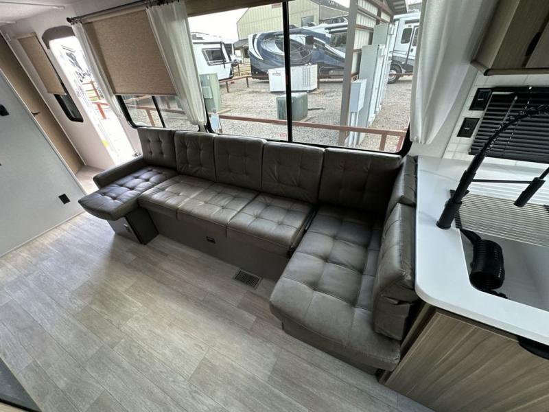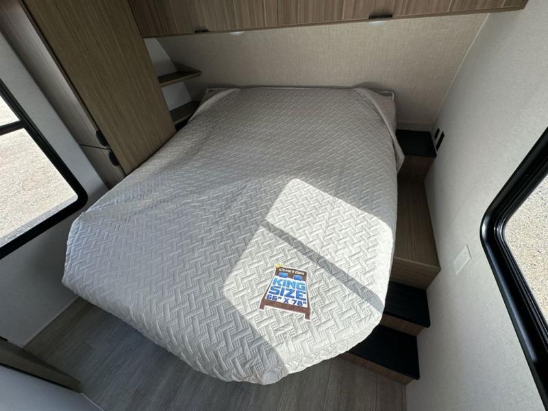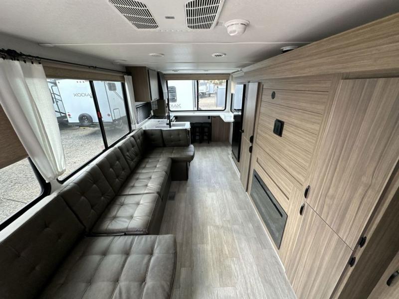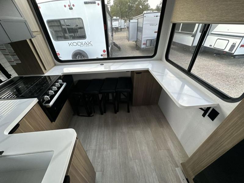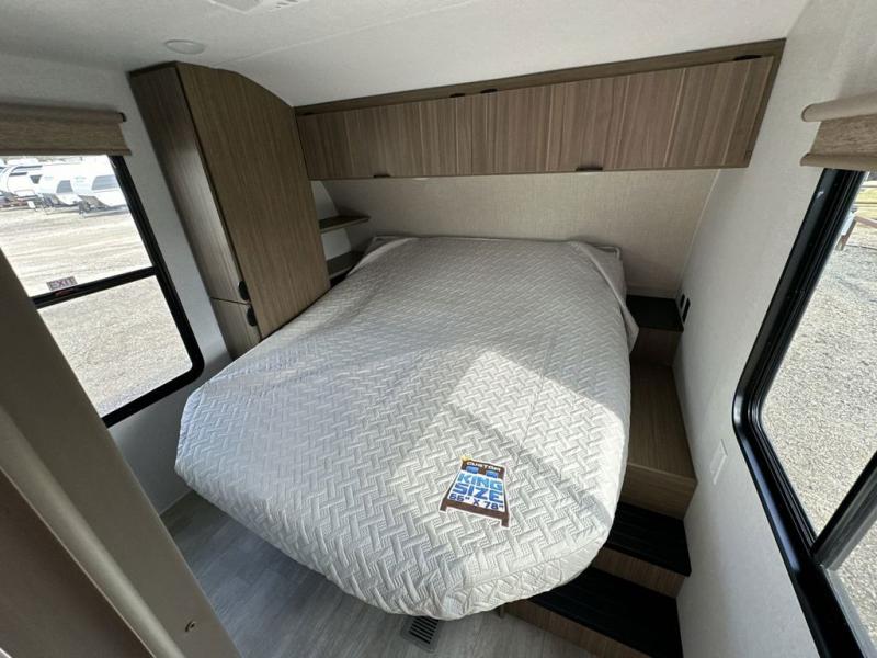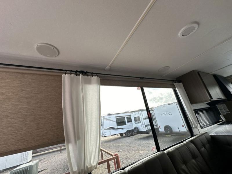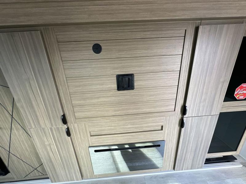 Your family of four will enjoy this Salem View bunk model featuring 105 square feet of window space for unbelievable views of your surroundings. A Versa Slide features a refrigerator, pantry, and entertainment center with a door leading to a bunk space including a set of 30" x 70" bunks with top flip-up bunk, storage cubbies for your things, and a desk with bar stool for any office work that you may need to do while you travel. The rear kitchen area offers 18 linear feet of countertop space with four bar stools, plus a range and double sink. Your refrigerator and pantry will hold all of your perishables and dry goods, and those are nearby within the Versa slide. Up front, a private bedroom with Versa-Tilt custom king bed which provides additional floor space, plus you will find a wardrobe with washer and dryer prep option. A large pass-through storage compartment offers plenty of space for your outdoor gear, and if you enjoy outdoor cooking, you are sure to love the exterior camp kitchen!
