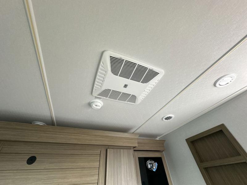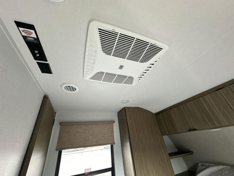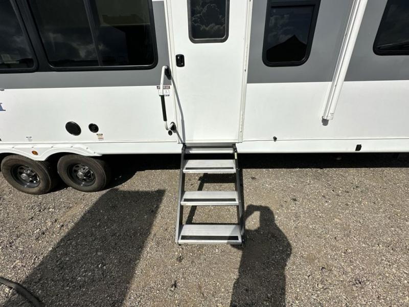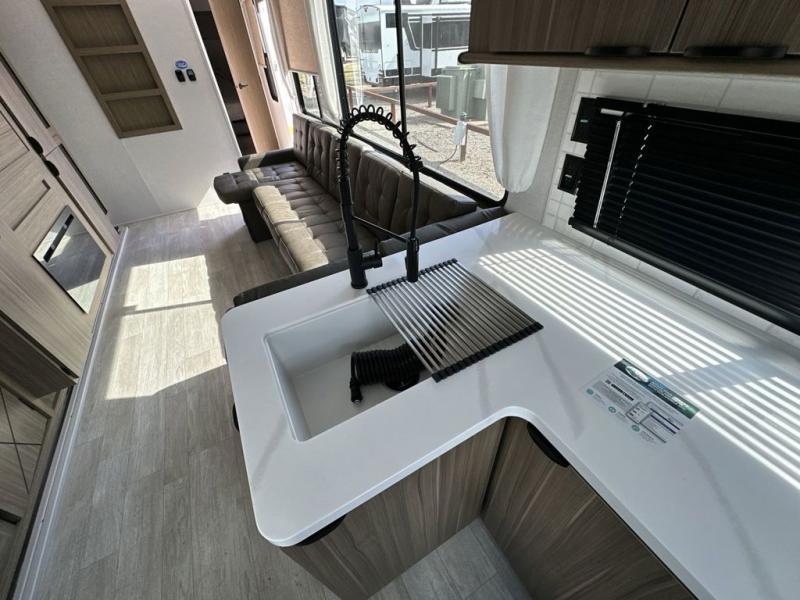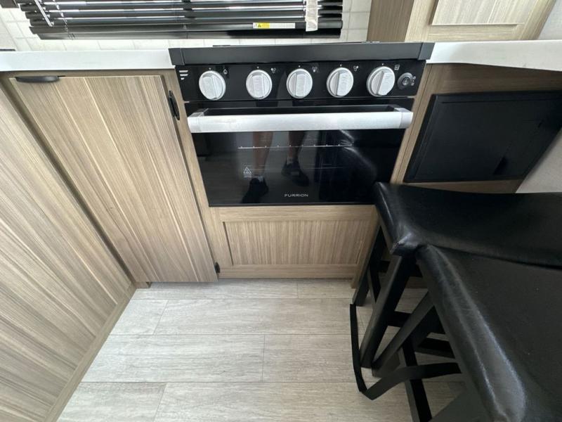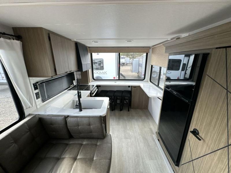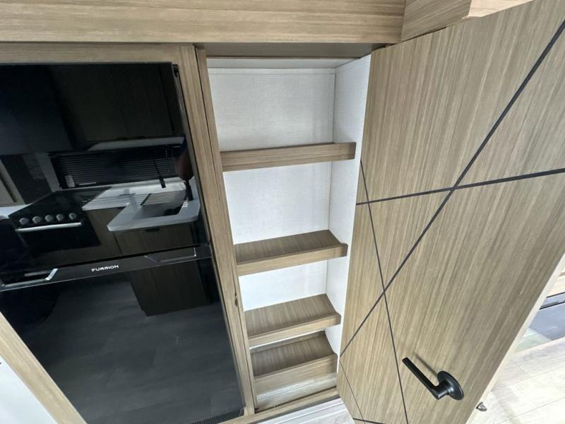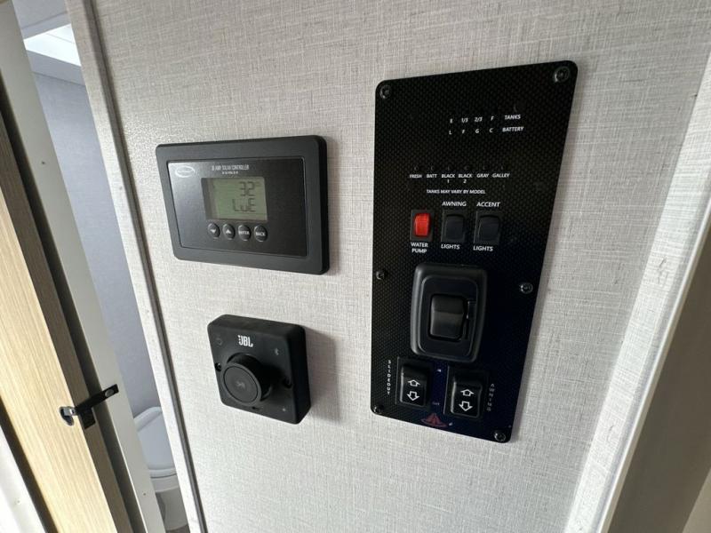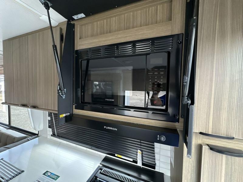 Your family of four will enjoy this Salem View bunk model featuring 105 square feet of window space for unbelievable views of your surroundings. A Versa Slide features a refrigerator, pantry, and entertainment center with a door leading to a bunk space including a set of 30" x 70" bunks with top flip-up bunk, storage cubbies for your things, and a desk with bar stool for any office work that you may need to do while you travel. The rear kitchen area offers 18 linear feet of countertop space with four bar stools, plus a range and double sink. Your refrigerator and pantry will hold all of your perishables and dry goods, and those are nearby within the Versa slide. Up front, a private bedroom with Versa-Tilt custom king bed which provides additional floor space, plus you will find a wardrobe with washer and dryer prep option. A large pass-through storage compartment offers plenty of space for your outdoor gear, and if you enjoy outdoor cooking, you are sure to love the exterior camp kitchen!