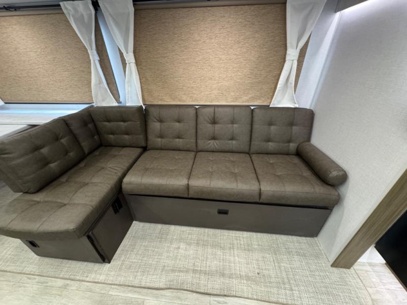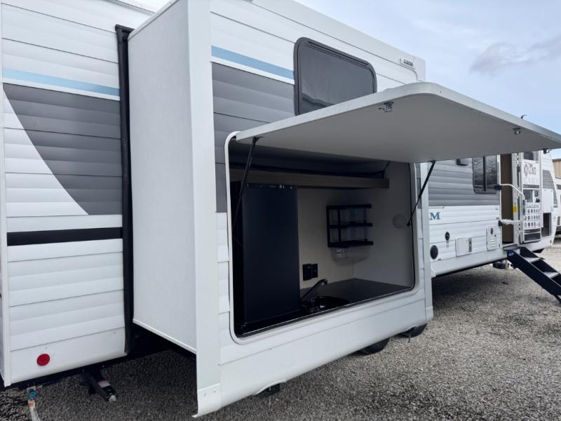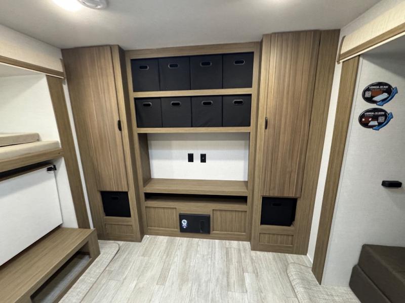The rear private bunkhouse in this Salem travel trailer is super accommodating for your kids or your overnight guests! It has two opposing slides which provide extra floor space and a full-width closet/entertainment center which delivers extra space for backpacks and tennis shoes. The front private bedroom will be perfect for you with its custom king bed and dual closets, and any additional guests can sleep on the L-shaped sofa. There is also a Versa Flex table here to dine at or get some work done. Everyone will enjoy their own space when it's time to freshen up in the full bath with a walk-in shower, and the chef of the group will have all the appliances needed to make meals each day. And don't forget about the outdoor kitchen for outdoor fun!