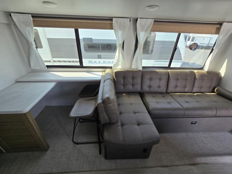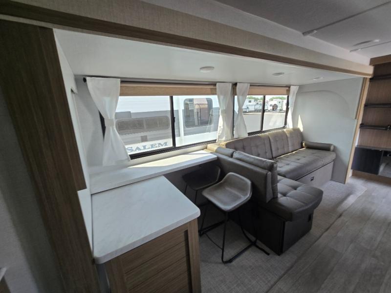 The Salem travel trailers are packed with hassle-free camping amenities! There are a variety of floorplans to choose from between three different regions. The heated and enclosed Accessibelly will help protect against the elements and debris during transport, and the exterior retro/metal redesign is sure to be eye-catching! There are stylish roller shades inside, along with updated backsplash, elegant curtain rods and curtains, plus many more interior comforts! Choose a Salem travel trailer today for quality and value!