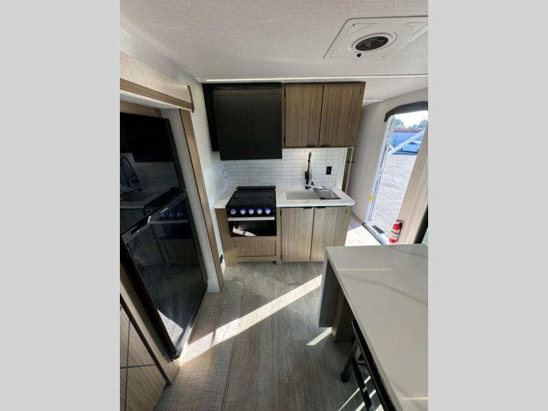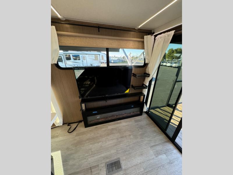 This travel trailer will feel more like home with its rear veranda/porch, dual entry doors, and front private bedroom! There is an outdoor kitchen on the back porch so you can make lunch in the fresh air, and the patio doors lead right into the main living area. Your crew can relax on the L-shaped sofa across from the fireplace, which will make your space more cozy. A kitchen island with four chairs will provide a place to dine at, and there is a spacious pantry and refrigerator for food storage. You will love having your own space in the private bedroom, and the Versa-Tilt custom king bed will let you sit up in bed to read your book at night.