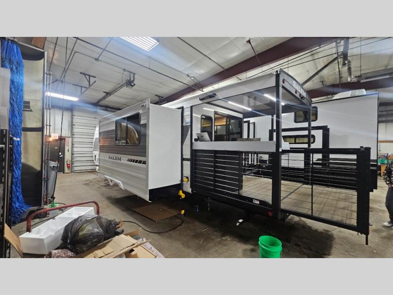 The Salem travel trailers are packed with hassle-free camping amenities! There are a variety of floorplans to choose from between three different regions. The heated and enclosed Accessibelly will help protect against the elements and debris during transport, and the exterior retro/metal redesign is sure to be eye-catching! There are stylish roller shades inside, along with updated backsplash, elegant curtain rods and curtains, plus many more interior comforts! Choose a Salem travel trailer today for quality and value!