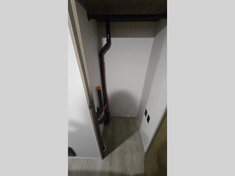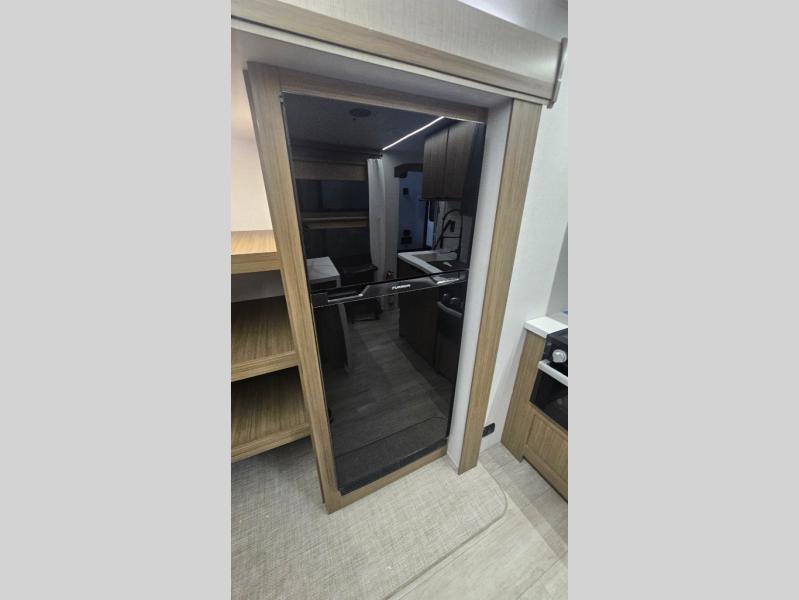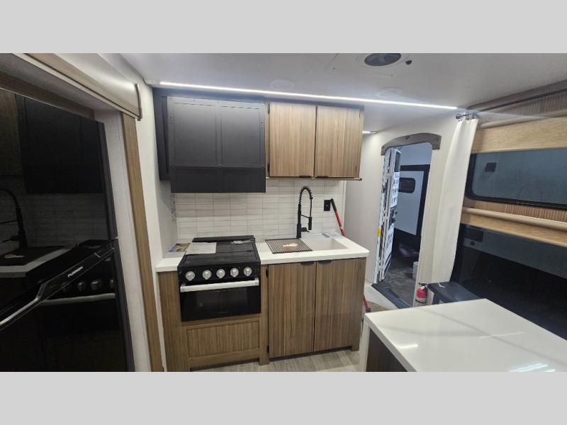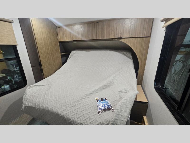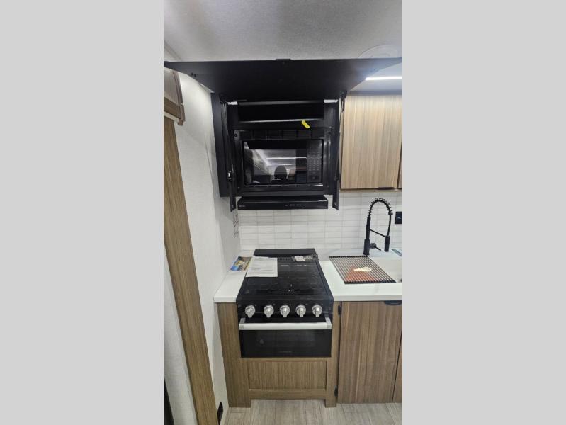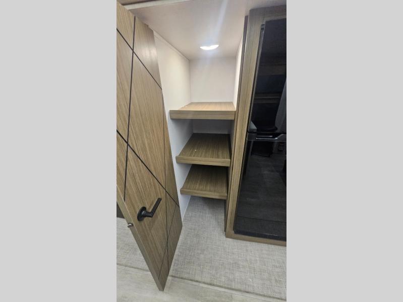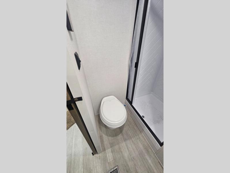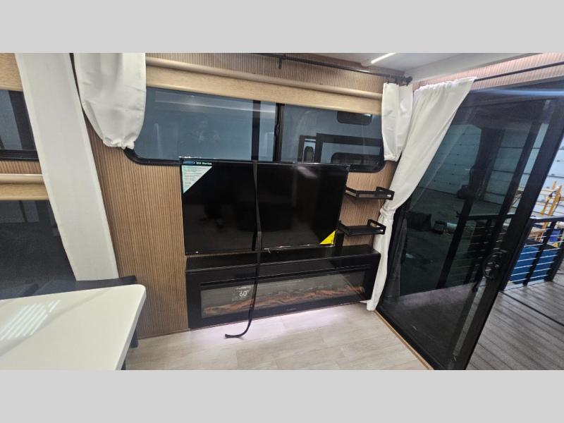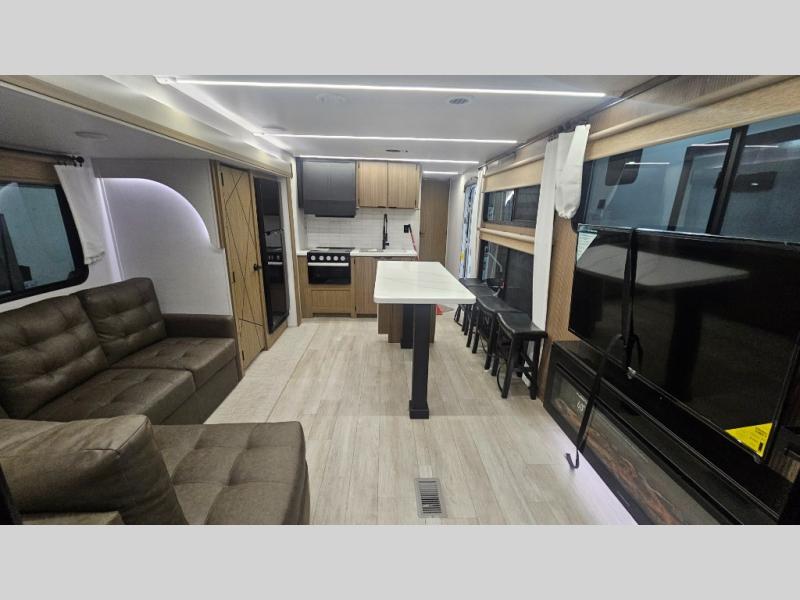 This travel trailer will feel more like home with its rear veranda/porch, dual entry doors, and front private bedroom! There is an outdoor kitchen on the back porch so you can make lunch in the fresh air, and the patio doors lead right into the main living area. Your crew can relax on the L-shaped sofa across from the fireplace, which will make your space more cozy. A kitchen island with four chairs will provide a place to dine at, and there is a spacious pantry and refrigerator for food storage. You will love having your own space in the private bedroom, and the Versa-Tilt custom king bed will let you sit up in bed to read your book at night.