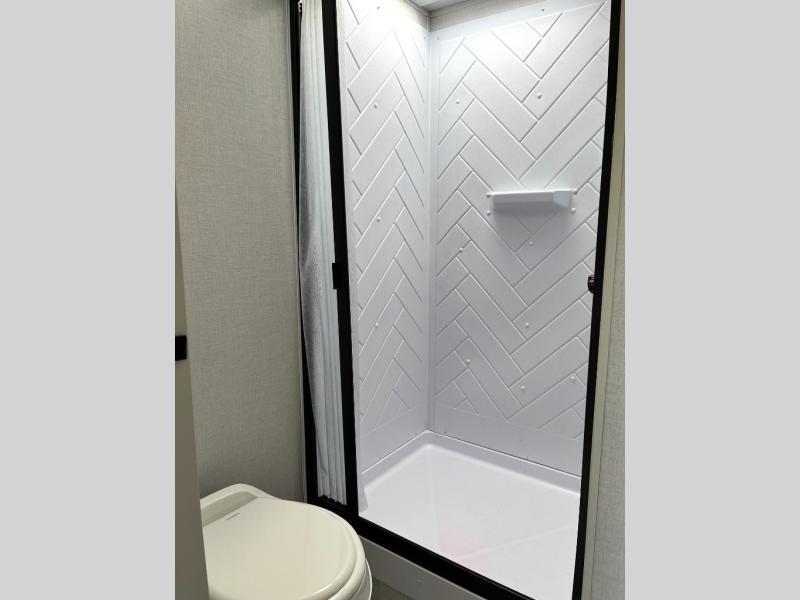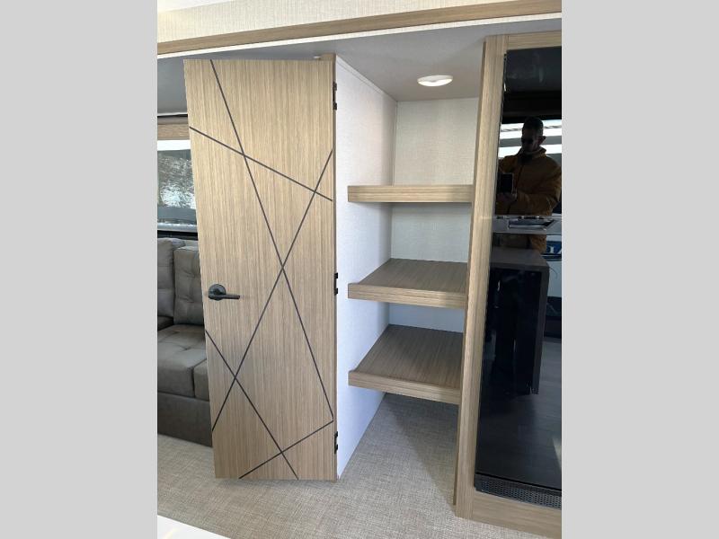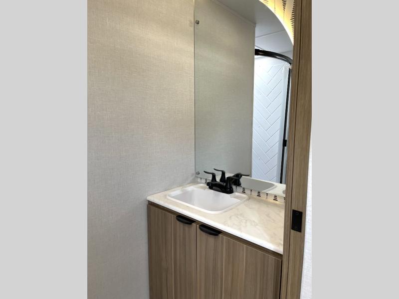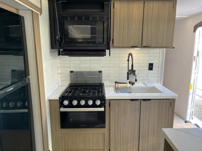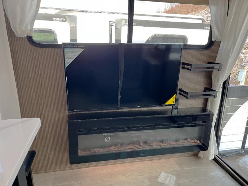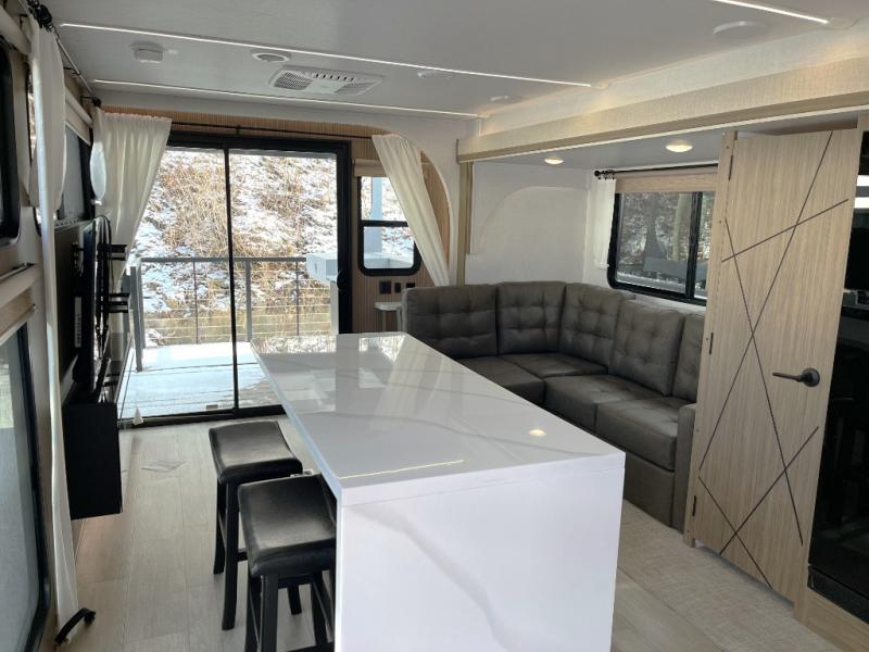 This travel trailer will feel more like home with its rear veranda/porch, dual entry doors, and front private bedroom! There is an outdoor kitchen on the back porch so you can make lunch in the fresh air, and the patio doors lead right into the main living area. Your crew can relax on the L-shaped sofa across from the fireplace, which will make your space more cozy. A kitchen island with four chairs will provide a place to dine at, and there is a spacious pantry and refrigerator for food storage. You will love having your own space in the private bedroom, and the Versa-Tilt custom king bed will let you sit up in bed to read your book at night.