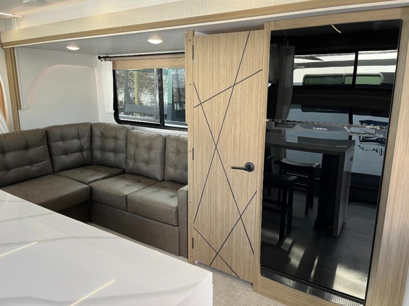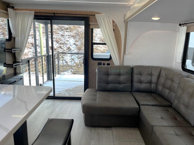 This travel trailer will feel more like home with its rear veranda/porch, dual entry doors, and front private bedroom! There is an outdoor kitchen on the back porch so you can make lunch in the fresh air, and the patio doors lead right into the main living area. Your crew can relax on the L-shaped sofa across from the fireplace, which will make your space more cozy. A kitchen island with four chairs will provide a place to dine at, and there is a spacious pantry and refrigerator for food storage. You will love having your own space in the private bedroom, and the Versa-Tilt custom king bed will let you sit up in bed to read your book at night.