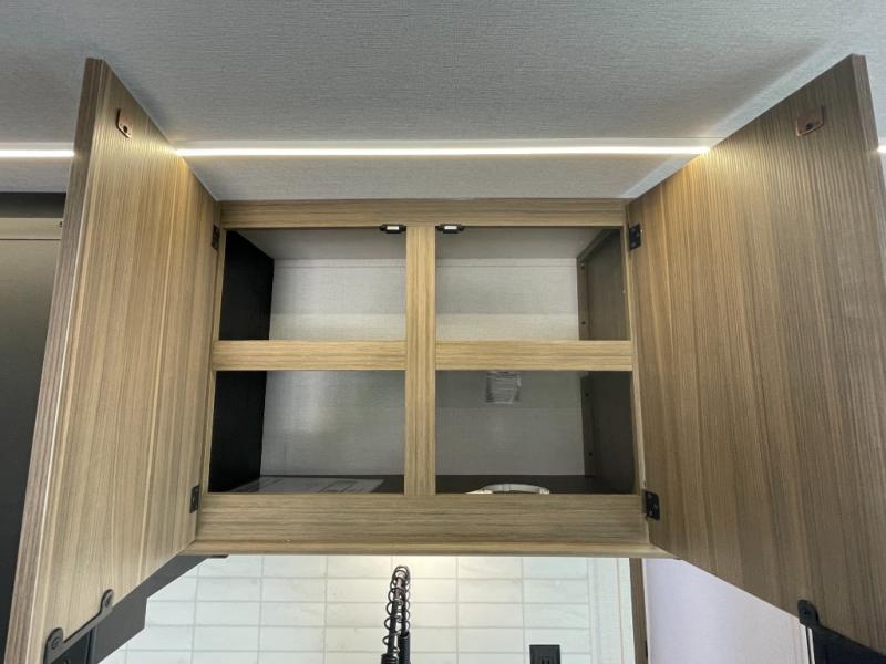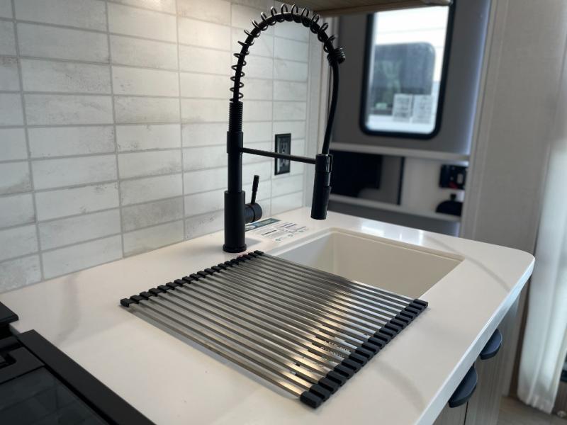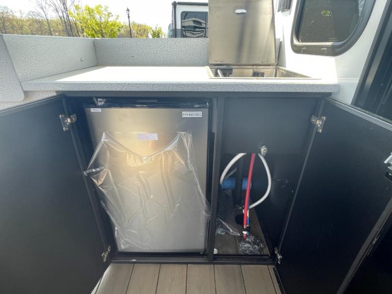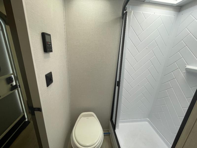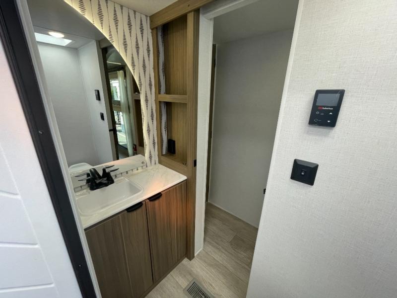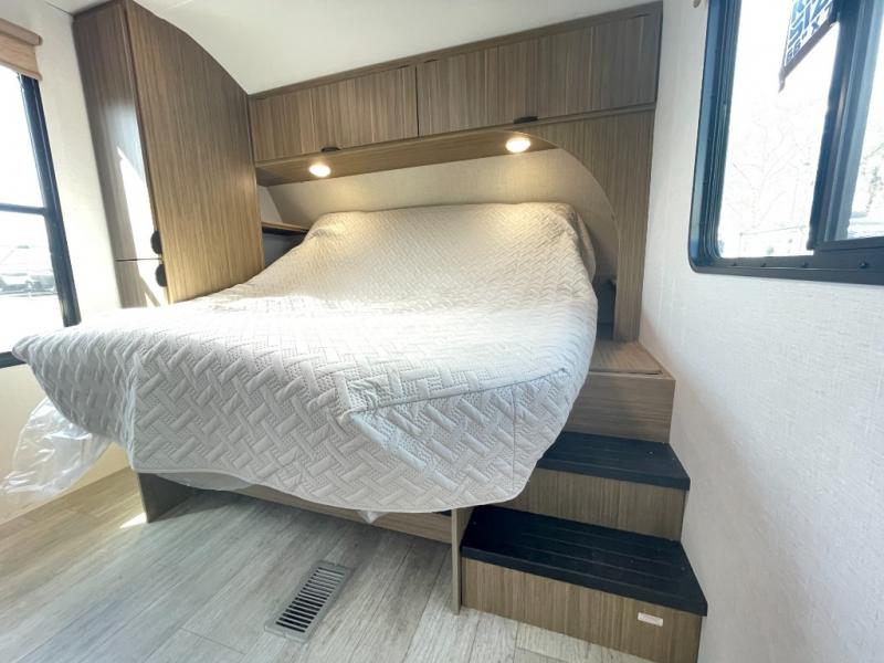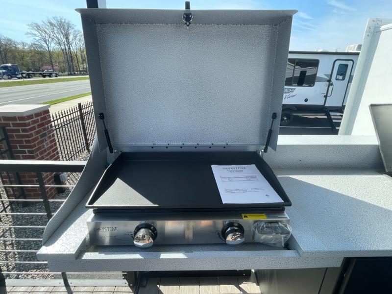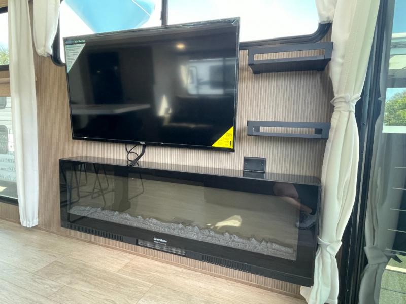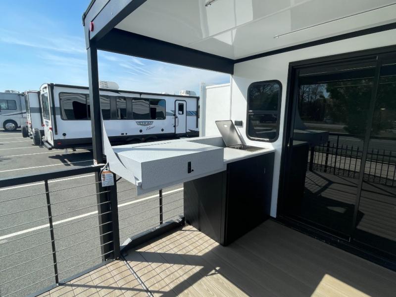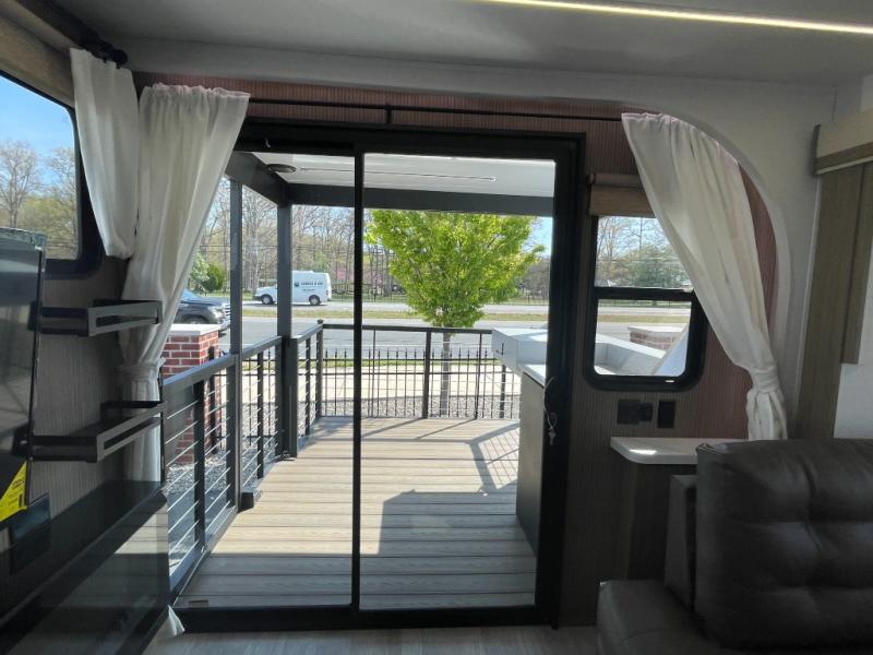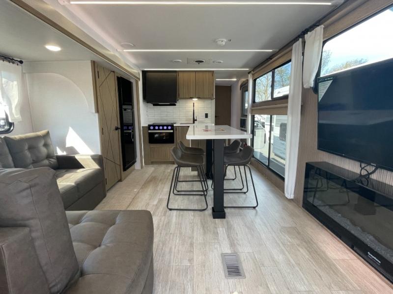 This travel trailer will feel more like home with its rear veranda/porch, dual entry doors, and front private bedroom! There is an outdoor kitchen on the back porch so you can make lunch in the fresh air, and the patio doors lead right into the main living area. Your crew can relax on the L-shaped sofa across from the fireplace, which will make your space more cozy. A kitchen island with four chairs will provide a place to dine at, and there is a spacious pantry and refrigerator for food storage. You will love having your own space in the private bedroom, and the Versa-Tilt custom king bed will let you sit up in bed to read your book at night.