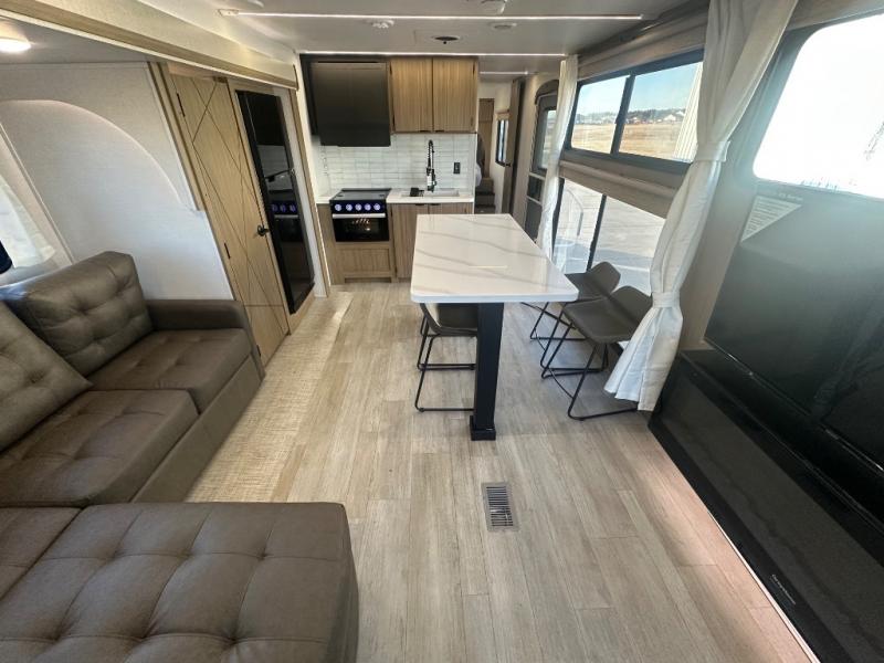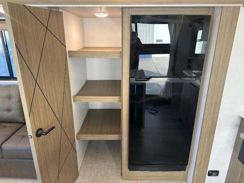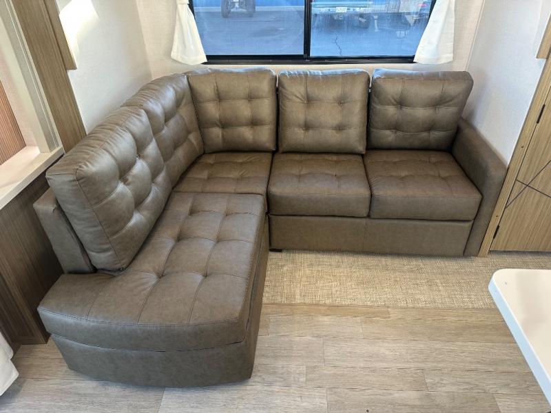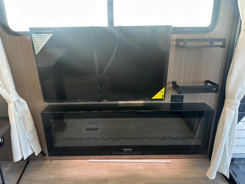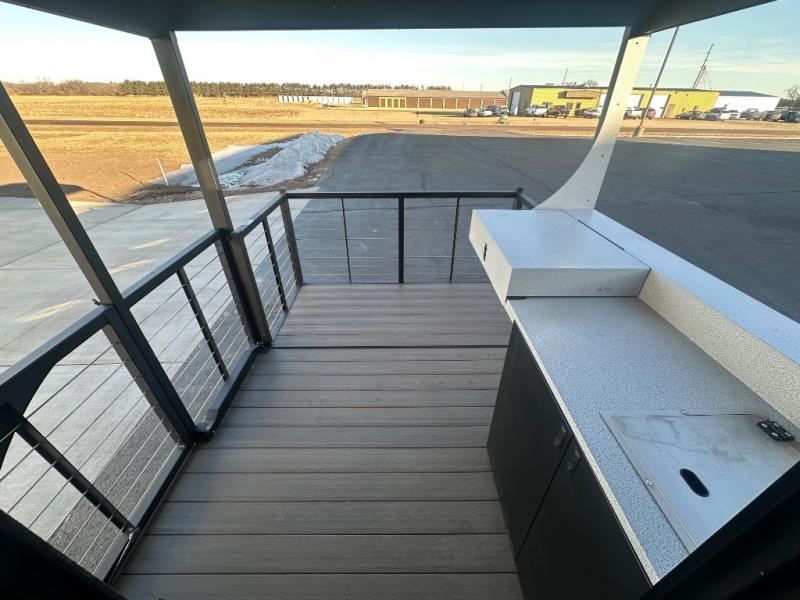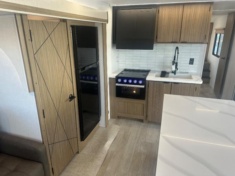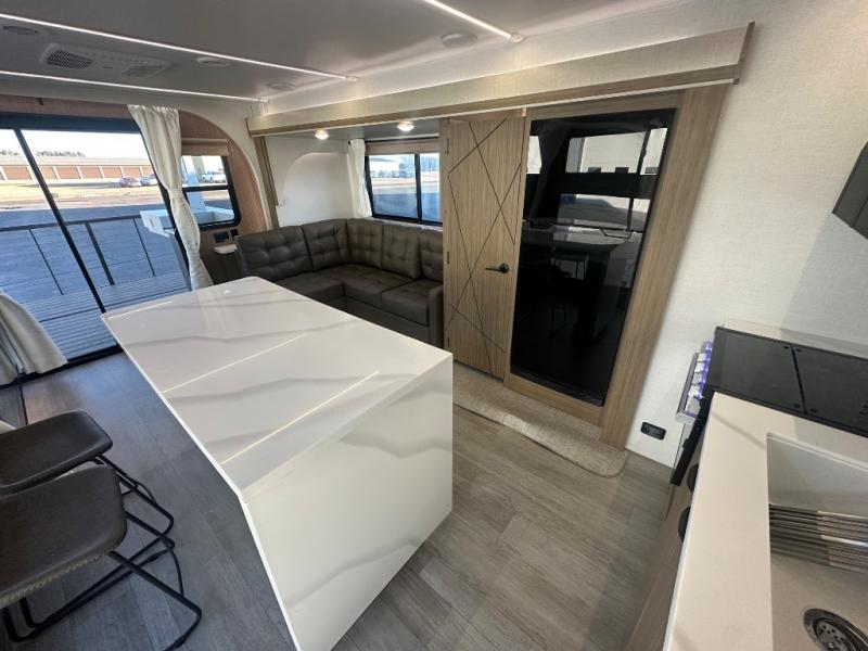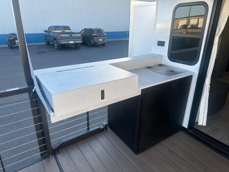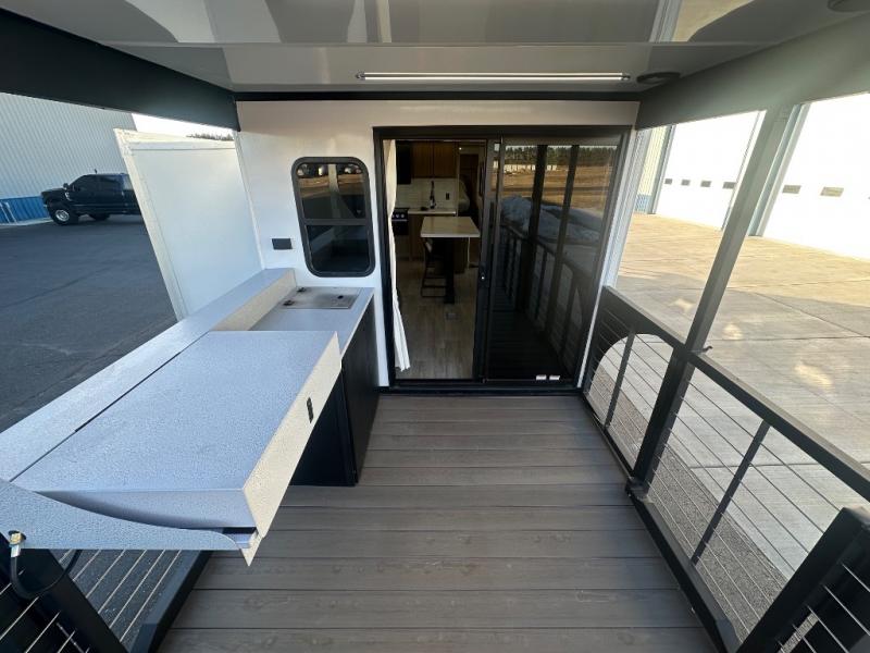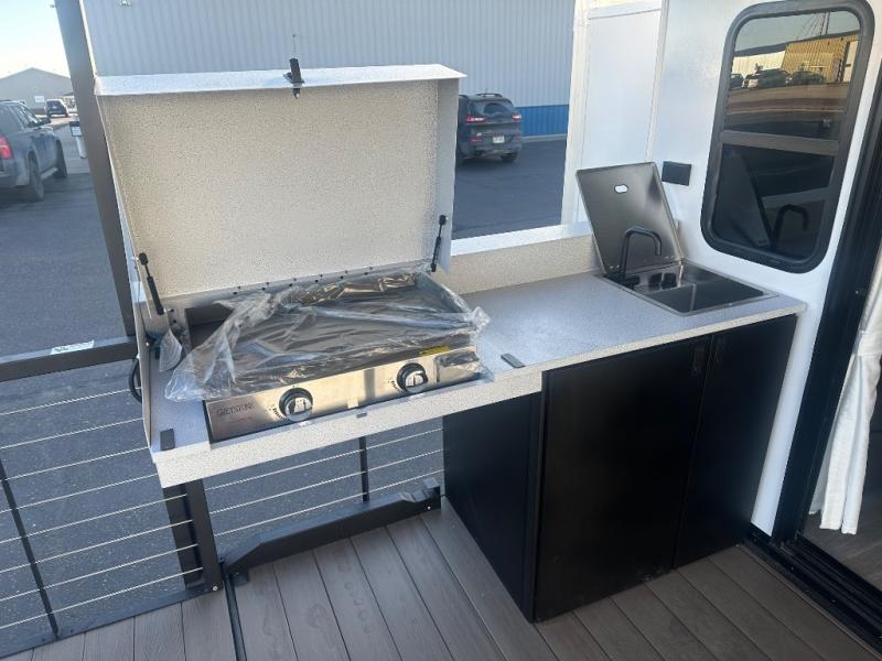 This travel trailer will feel more like home with its rear veranda/porch, dual entry doors, and front private bedroom! There is an outdoor kitchen on the back porch so you can make lunch in the fresh air, and the patio doors lead right into the main living area. Your crew can relax on the L-shaped sofa across from the fireplace, which will make your space more cozy. A kitchen island with four chairs will provide a place to dine at, and there is a spacious pantry and refrigerator for food storage. You will love having your own space in the private bedroom, and the Versa-Tilt custom king bed will let you sit up in bed to read your book at night.