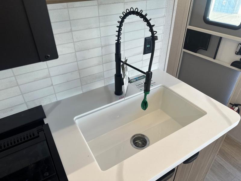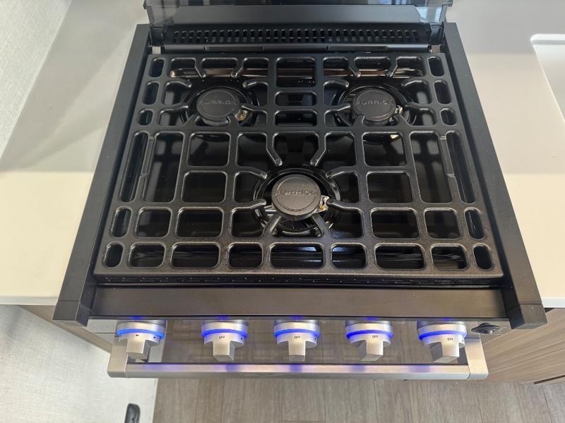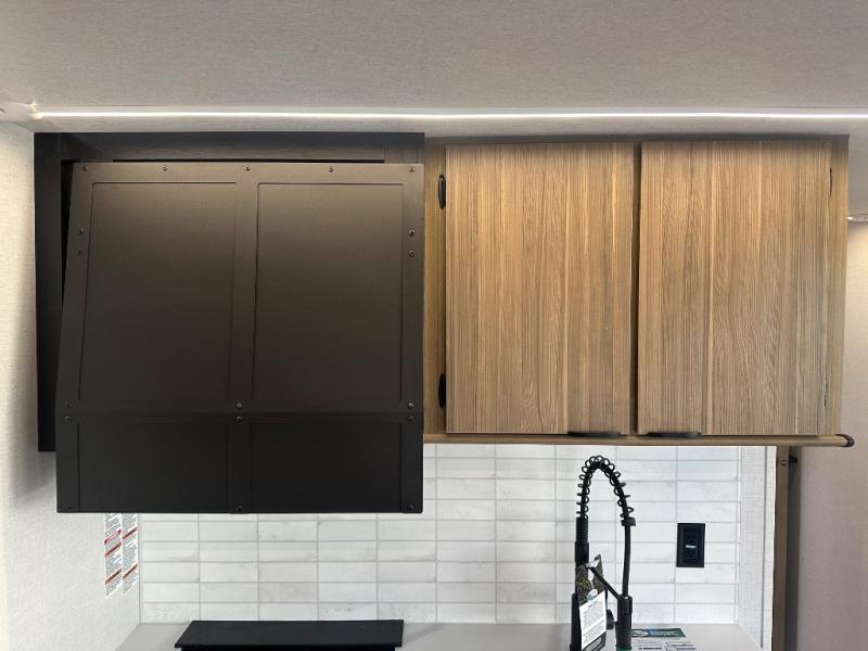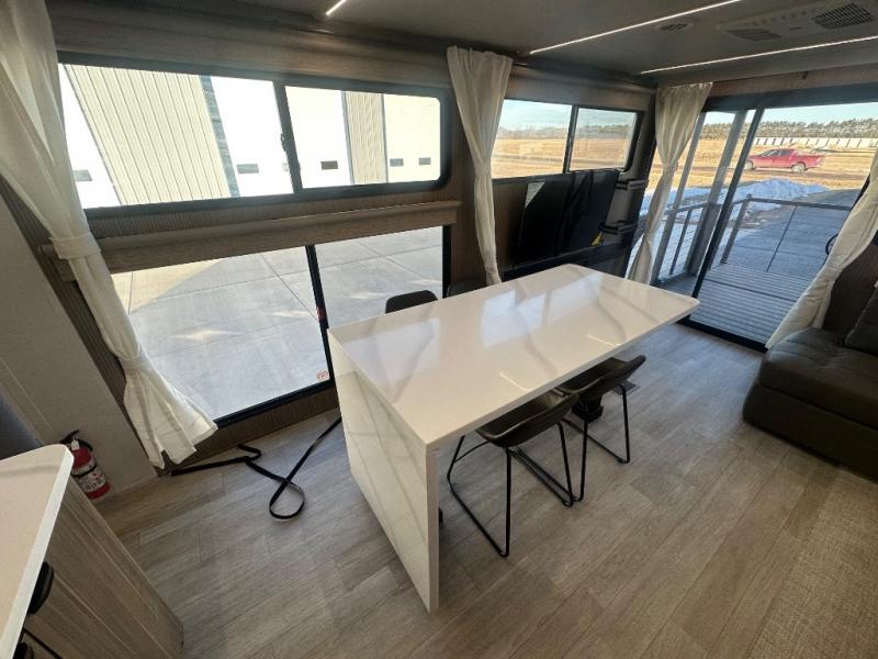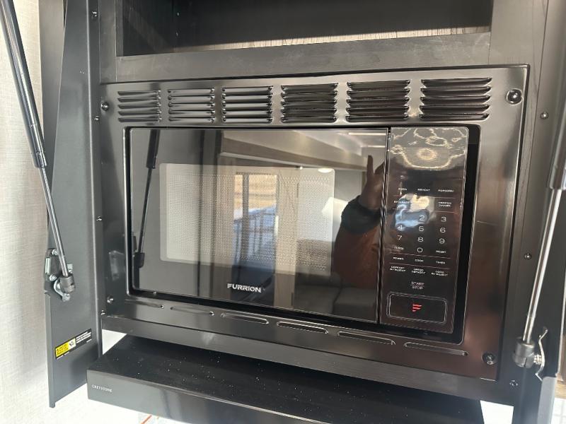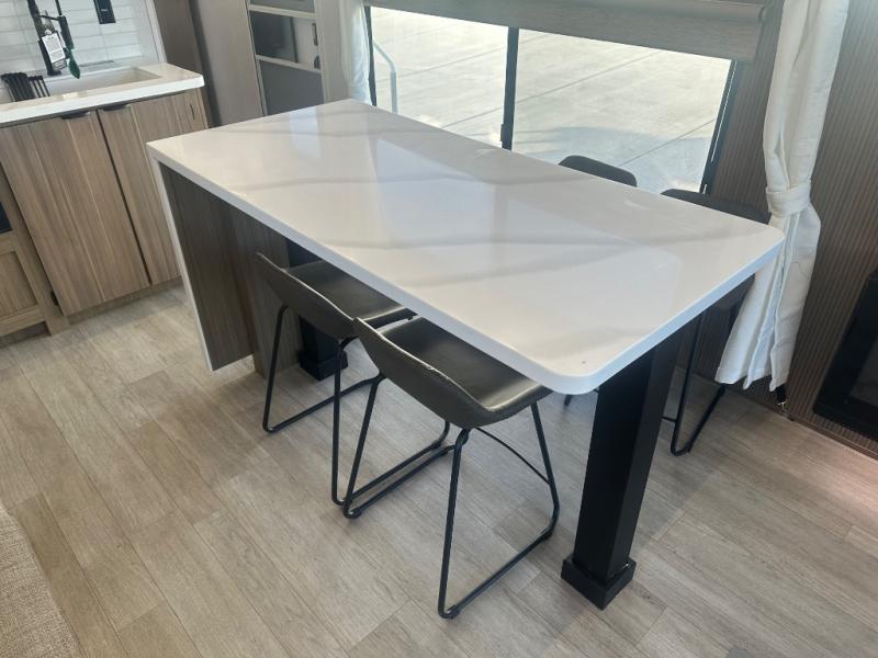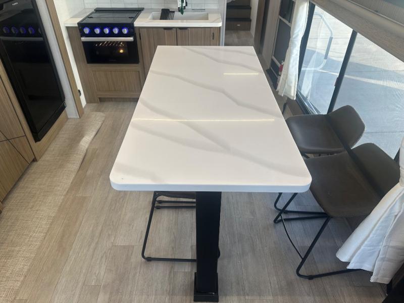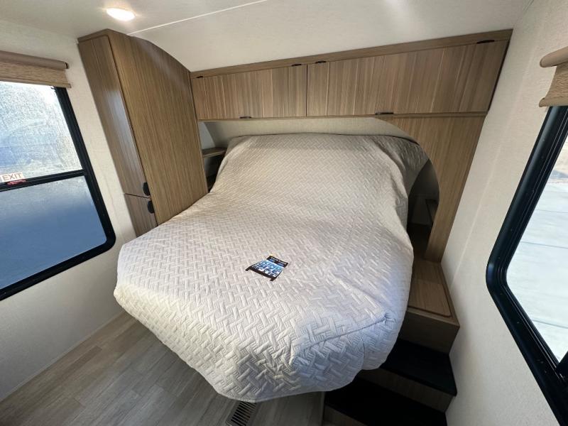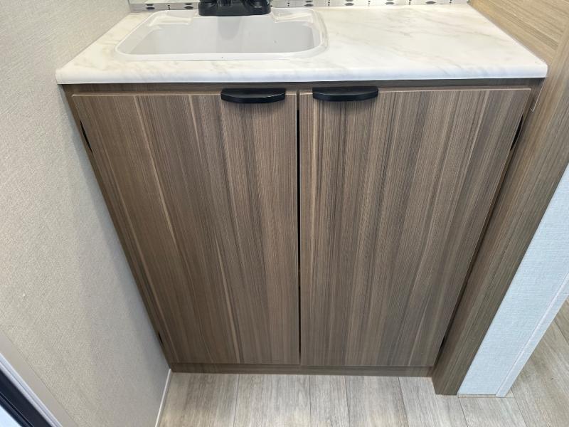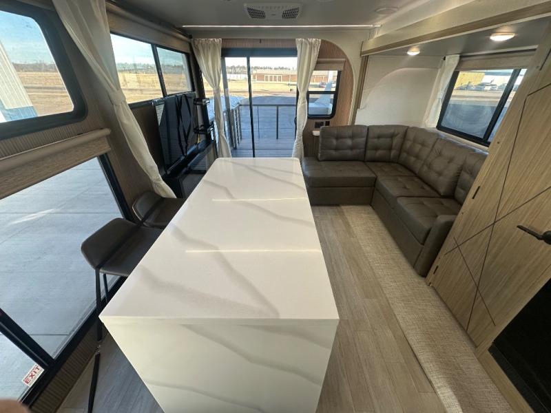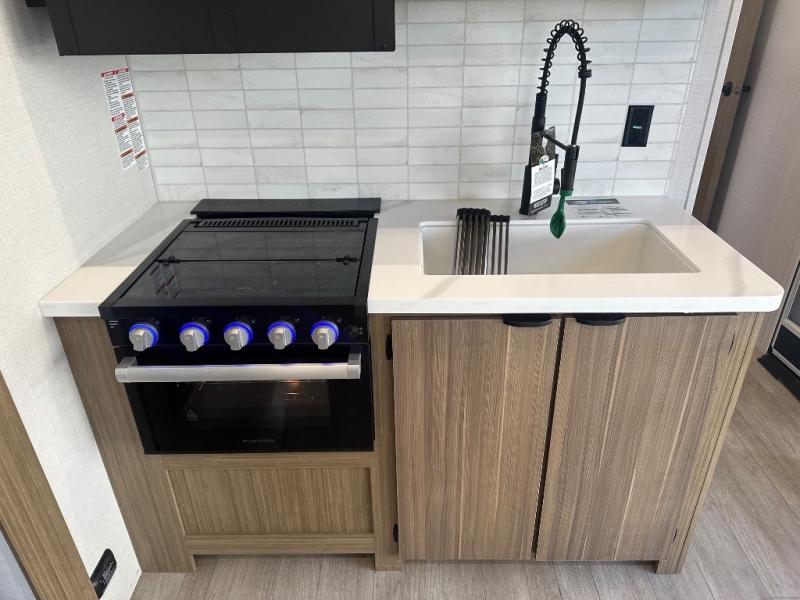 This travel trailer will feel more like home with its rear veranda/porch, dual entry doors, and front private bedroom! There is an outdoor kitchen on the back porch so you can make lunch in the fresh air, and the patio doors lead right into the main living area. Your crew can relax on the L-shaped sofa across from the fireplace, which will make your space more cozy. A kitchen island with four chairs will provide a place to dine at, and there is a spacious pantry and refrigerator for food storage. You will love having your own space in the private bedroom, and the Versa-Tilt custom king bed will let you sit up in bed to read your book at night.