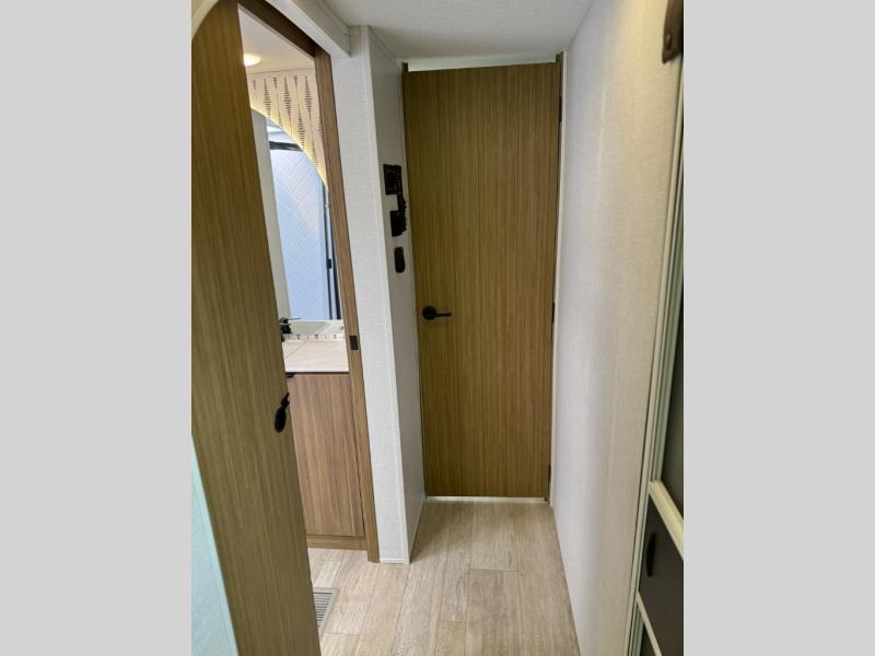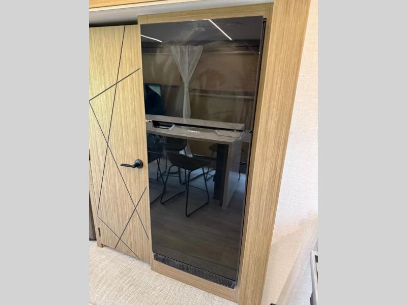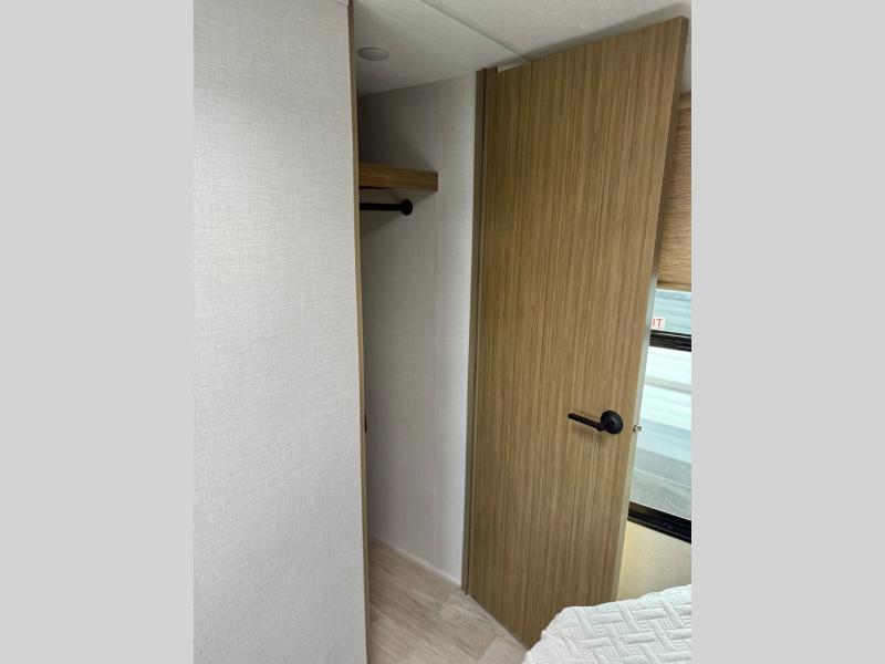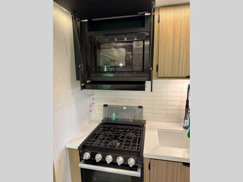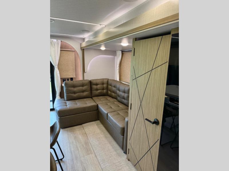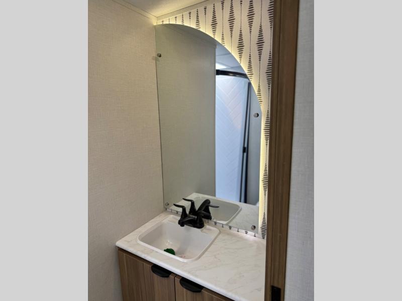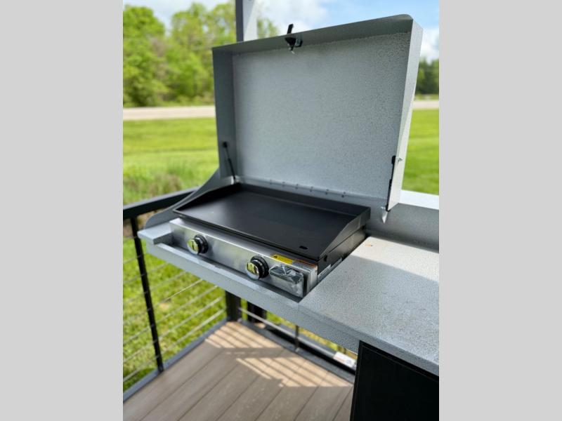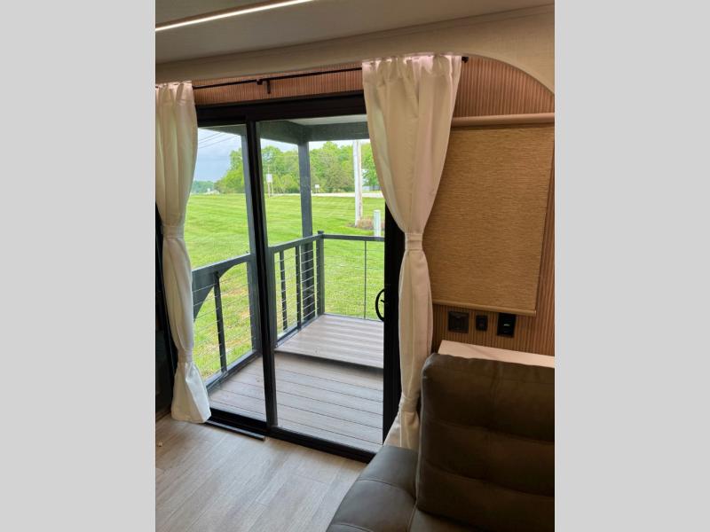 This travel trailer will feel more like home with its rear veranda/porch, dual entry doors, and front private bedroom! There is an outdoor kitchen on the back porch so you can make lunch in the fresh air, and the patio doors lead right into the main living area. Your crew can relax on the L-shaped sofa across from the fireplace, which will make your space more cozy. A kitchen island with four chairs will provide a place to dine at, and there is a spacious pantry and refrigerator for food storage. You will love having your own space in the private bedroom, and the Versa-Tilt custom king bed will let you sit up in bed to read your book at night.